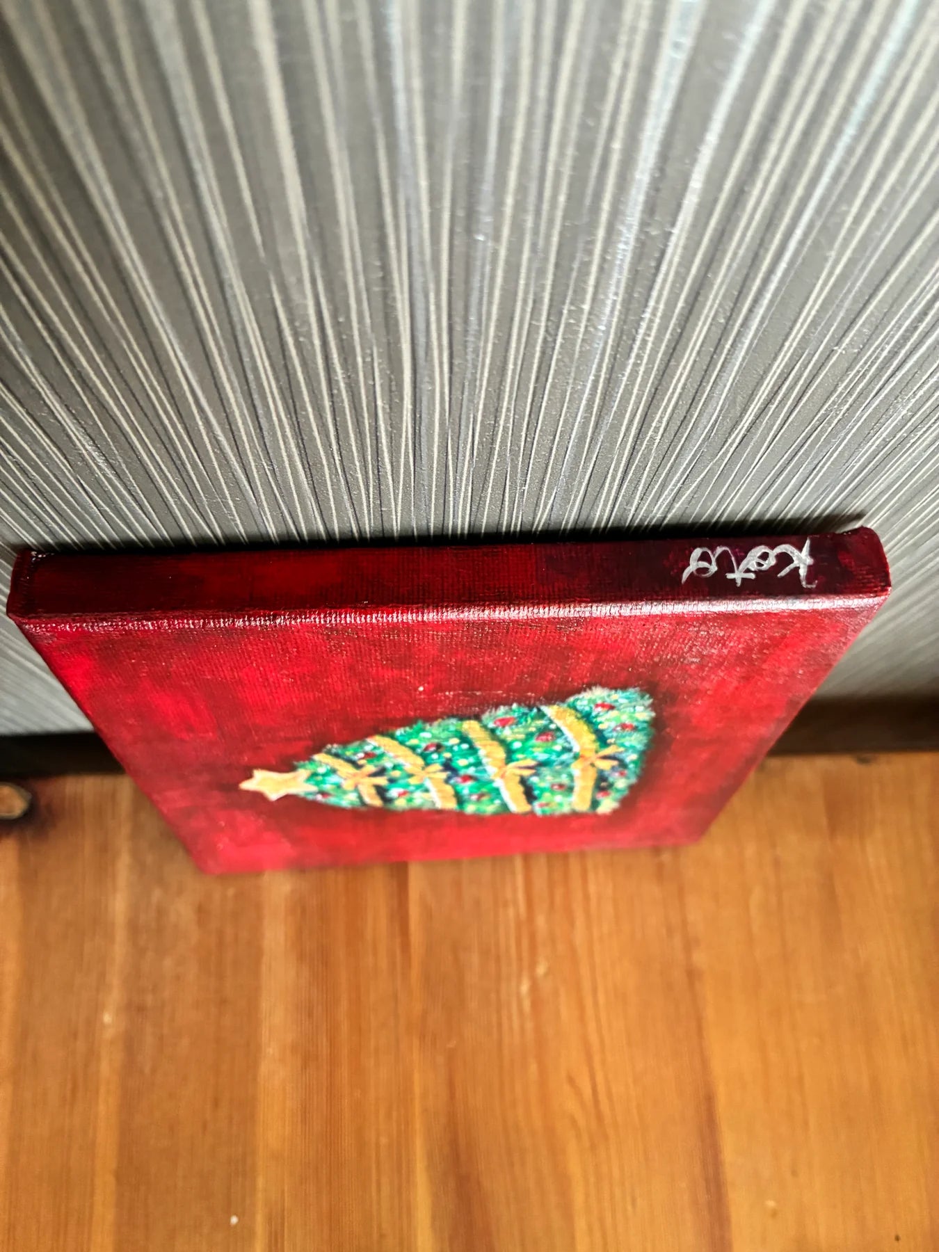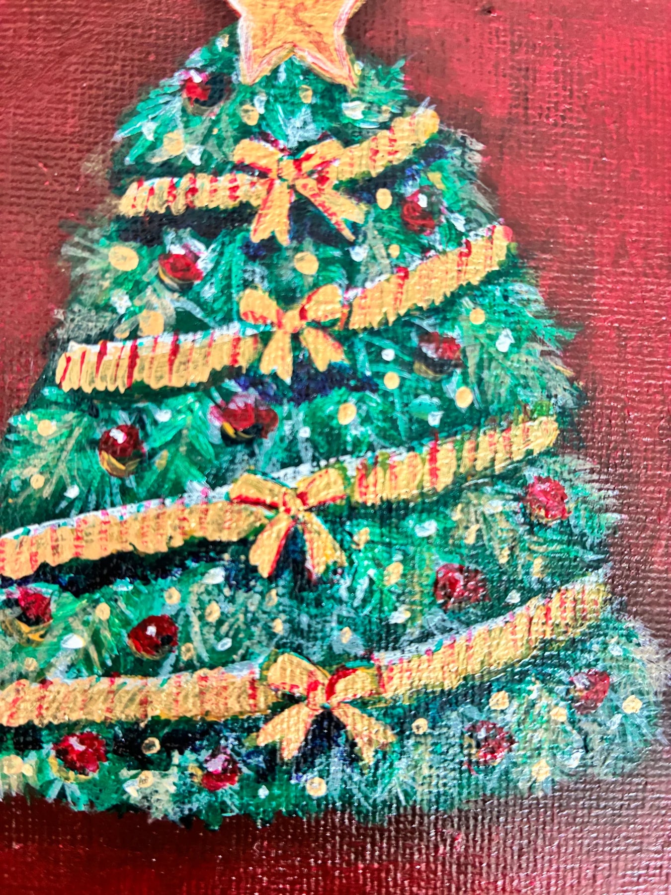 クリスマスにまつわるツリーを描きました。クリスマスらしい緑と赤とゴールドでお部屋が一層華やかに。他の作品と並べて飾っても可愛いです。
