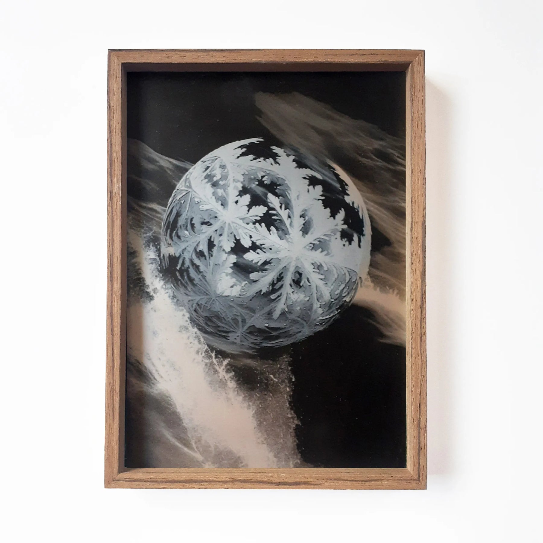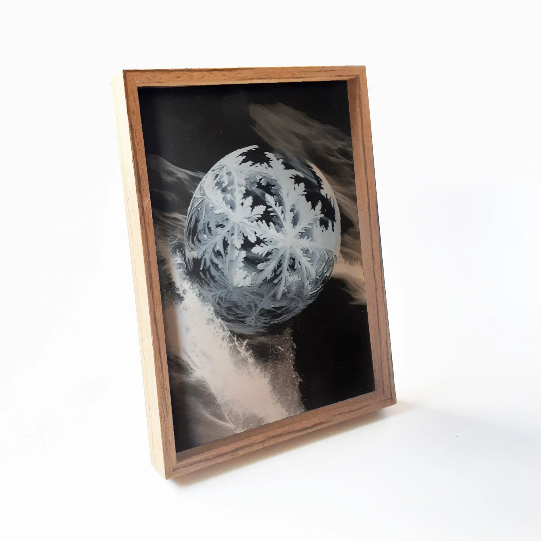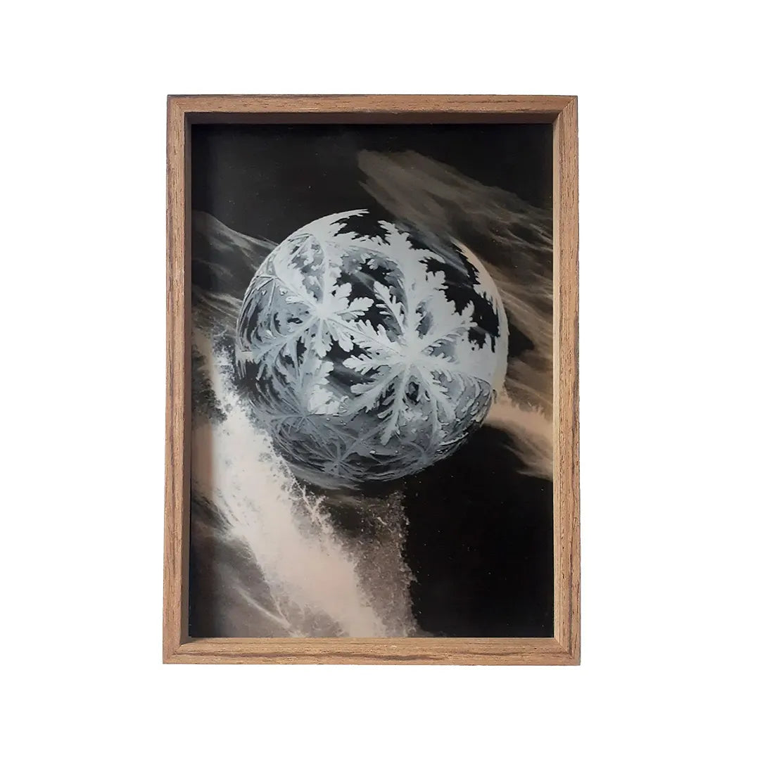 繊細な結晶が球体を包み、流れる光の中で静かに浮かび上がります。淡い白と深い影が交差し、透明な冷たさと優しい揺らぎが同時に広がる一枚です。眺めていると、動きと静けさが交互に立ち現れるようで、壁に掛けるだけで空間に澄んだリズムが宿ります。木枠の温もりとも調和し、落ち着いたリビングや書斎などにもすっと馴染む作品です。