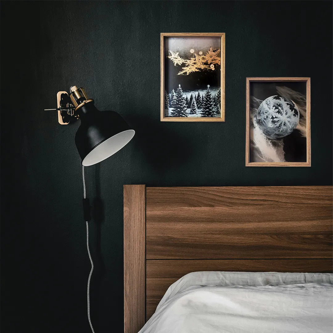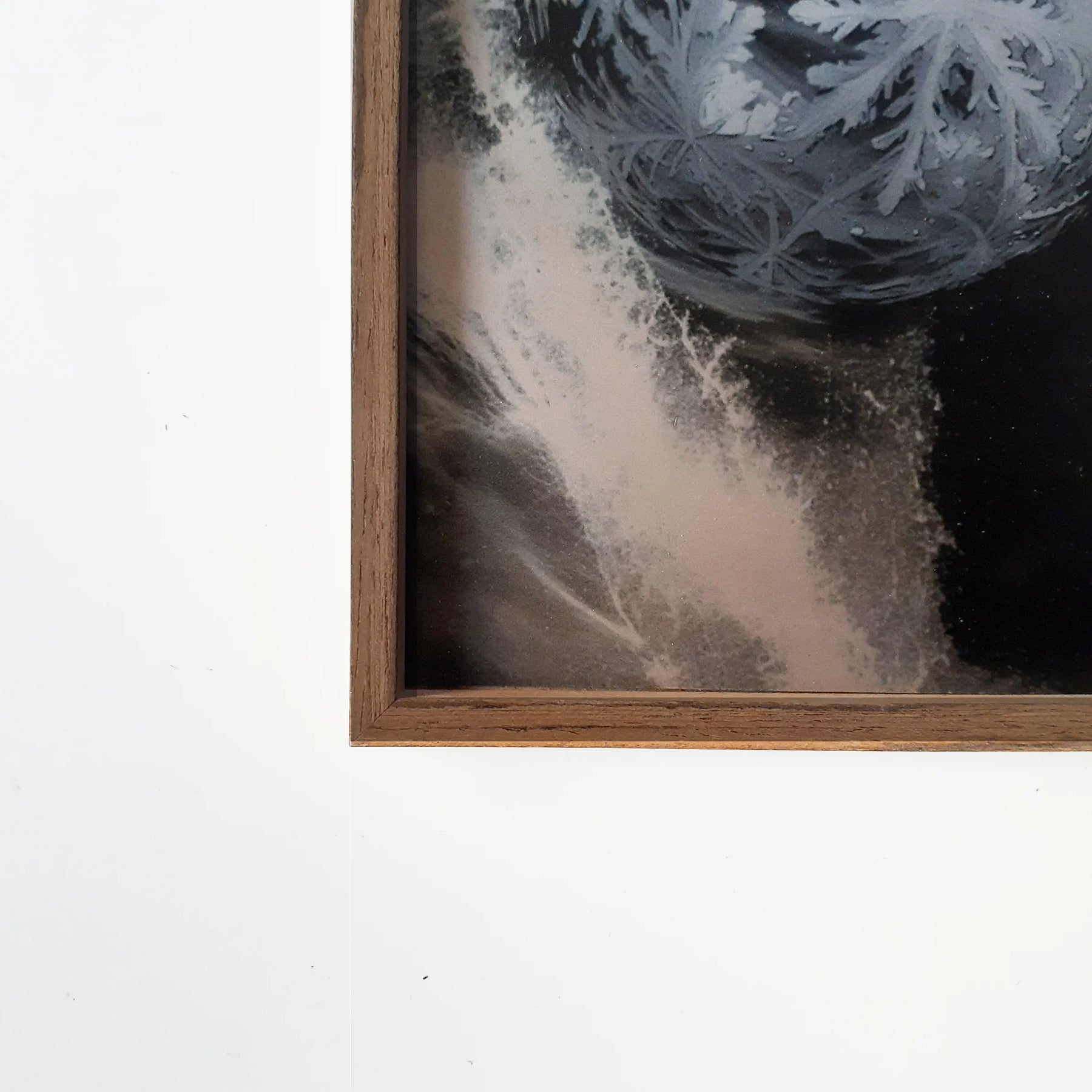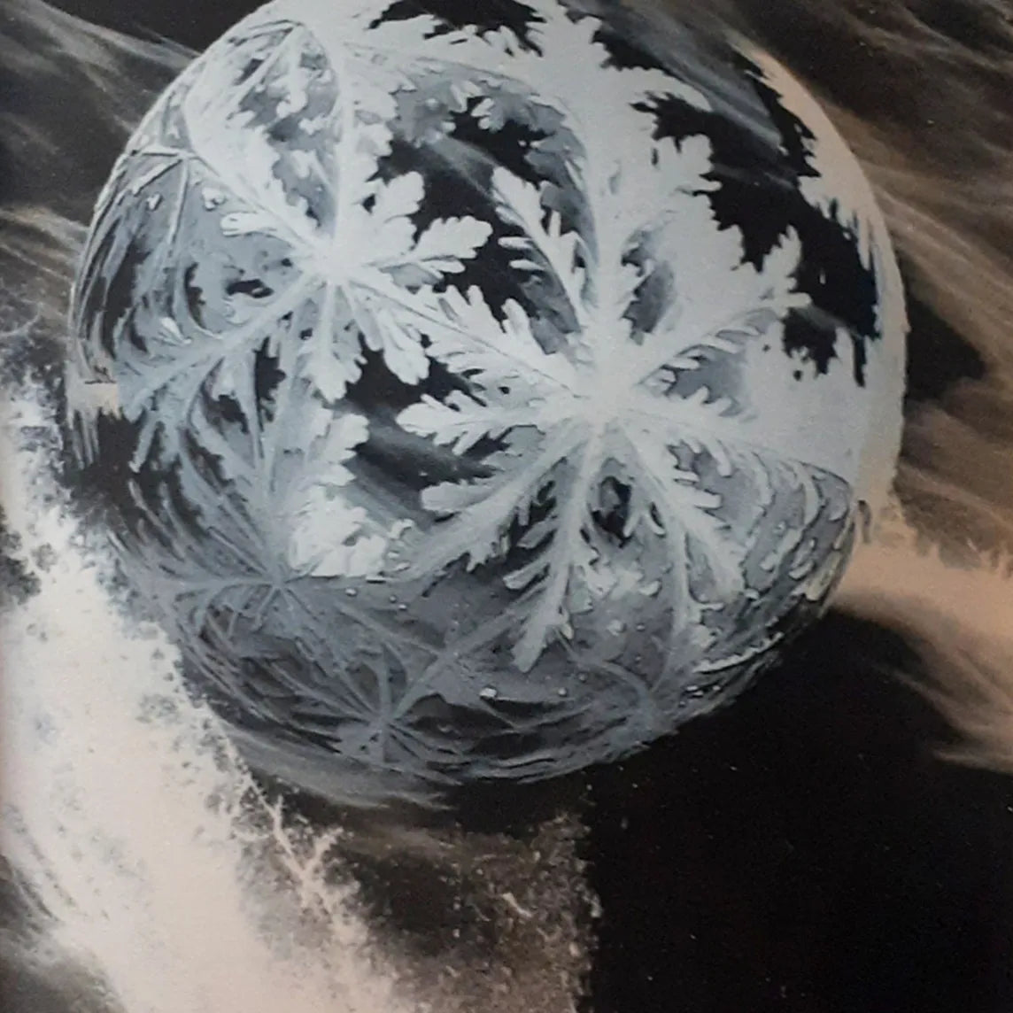 繊細な結晶が球体を包み、流れる光の中で静かに浮かび上がります。淡い白と深い影が交差し、透明な冷たさと優しい揺らぎが同時に広がる一枚です。眺めていると、動きと静けさが交互に立ち現れるようで、壁に掛けるだけで空間に澄んだリズムが宿ります。木枠の温もりとも調和し、落ち着いたリビングや書斎などにもすっと馴染む作品です。