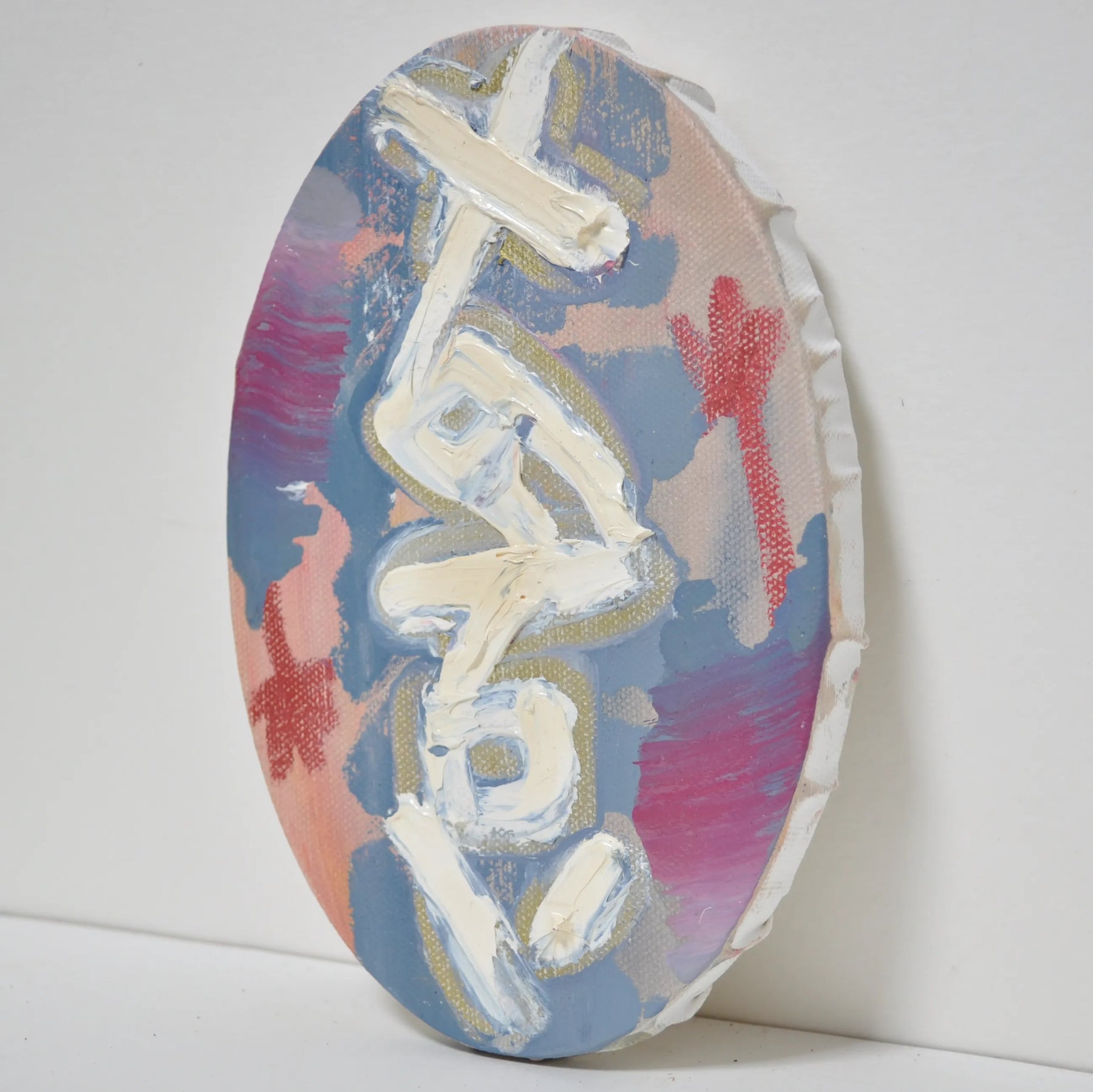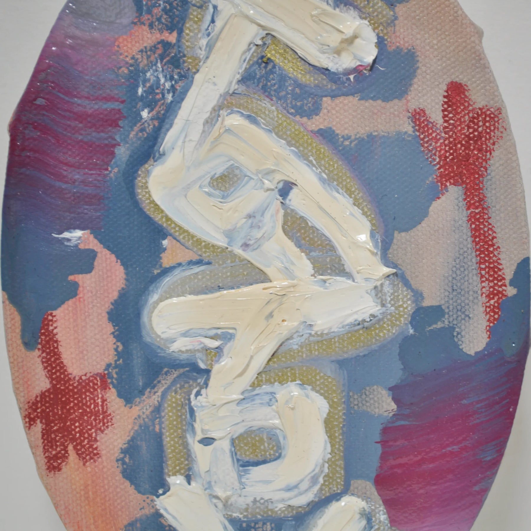 淡いブルーとピンクの上を、厚みのある白いストロークが静かに走る一枚です。筆致はまるで言葉の痕跡のように連なり、抽象の中に「声」や「記憶」を感じさせます。優しい色調が空間を柔らかく包み、リビングやワークスペースに飾ると穏やかなリズムが生まれます。シンプルなインテリアにも相性が良く、日常に小さな余韻をもたらすアートです。
