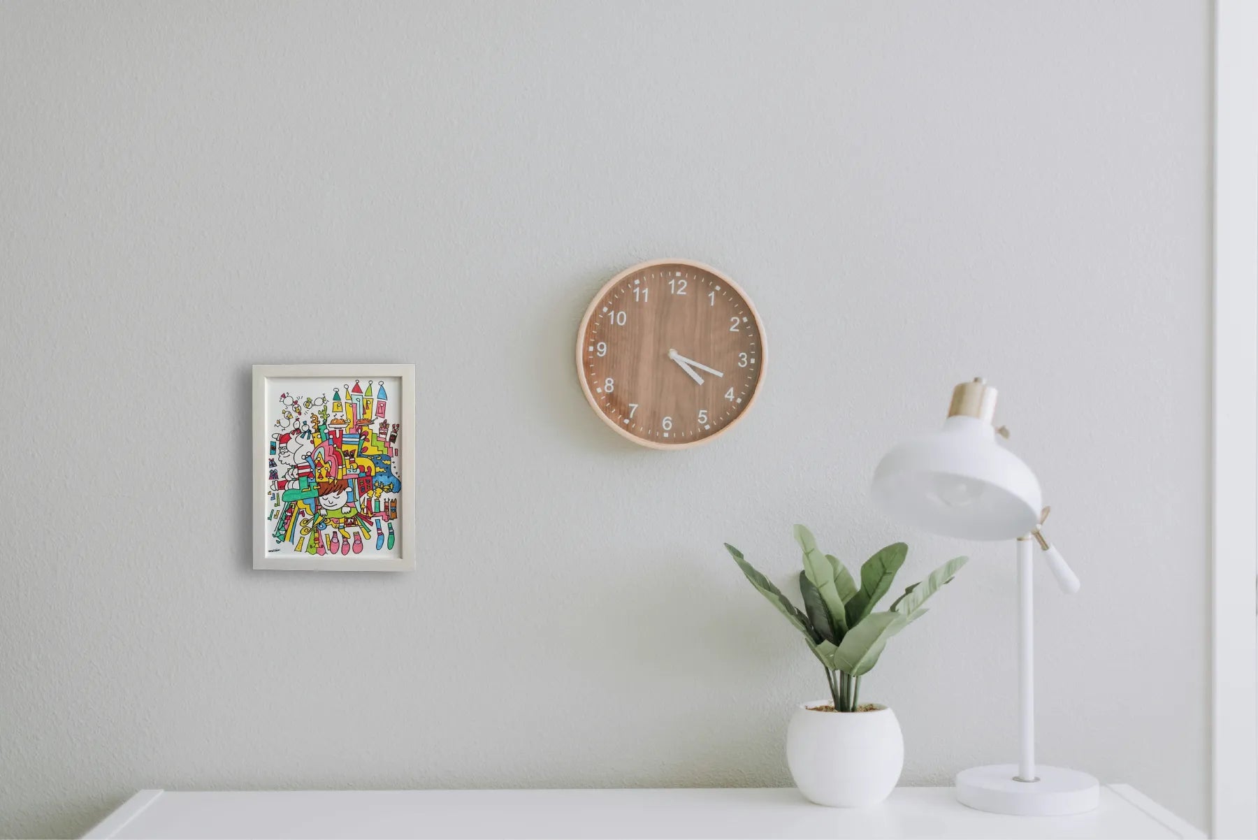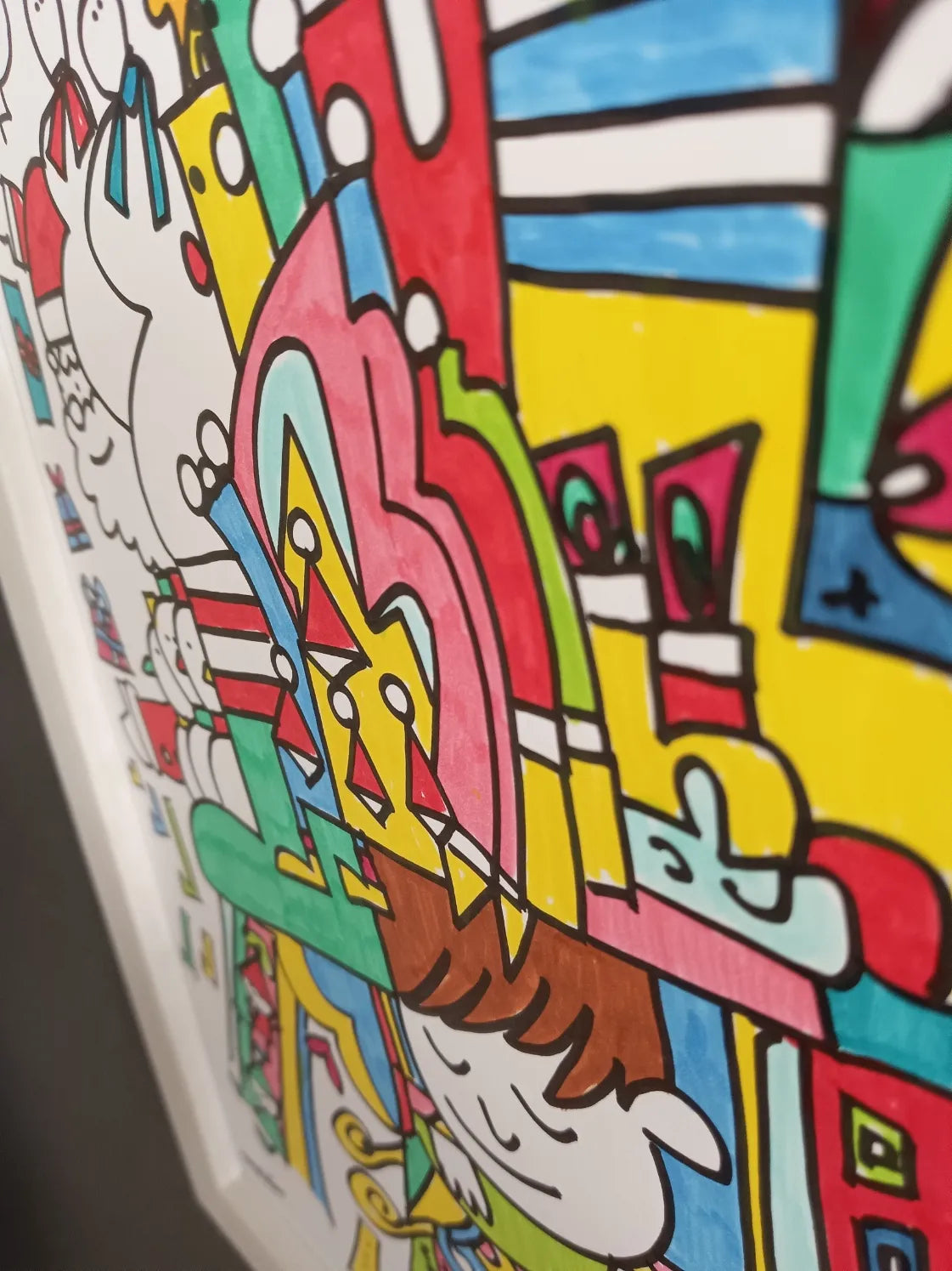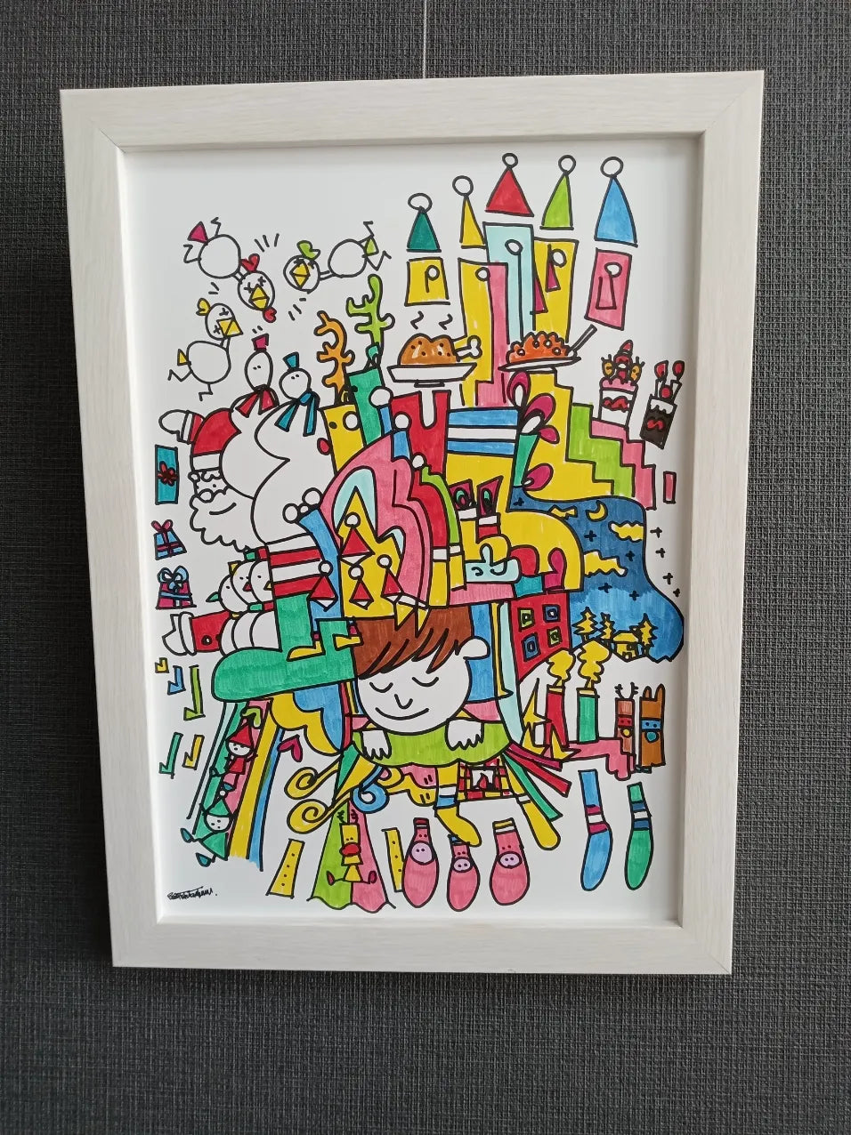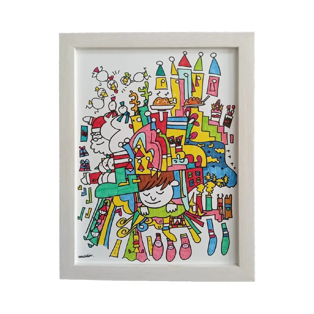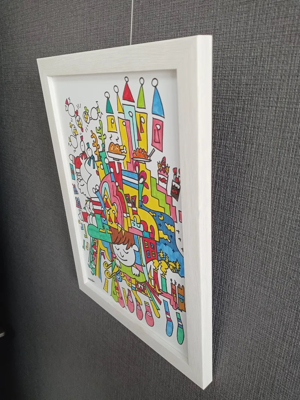 にぎやかな色彩と軽やかな線で、子どもの想像世界が立ち上がるように広がる一枚です。お菓子や家、動物たちがリズミカルにつながり、眺めるほどに物語が生まれる楽しさがあります。ワークスペースやリビングに飾ると、空間に遊び心と明るさが生まれ、毎日の気分転換にもぴったりなアクセントになります。