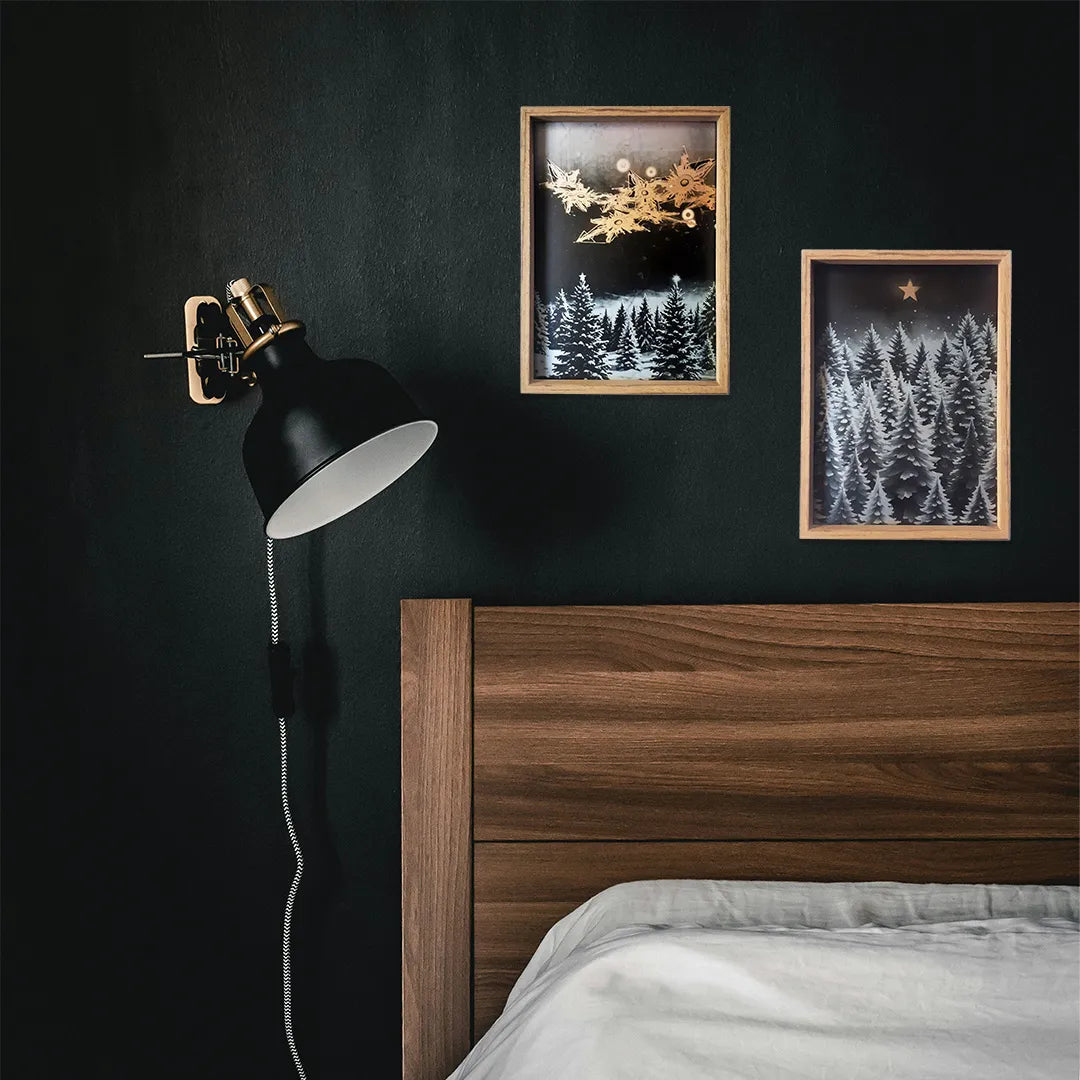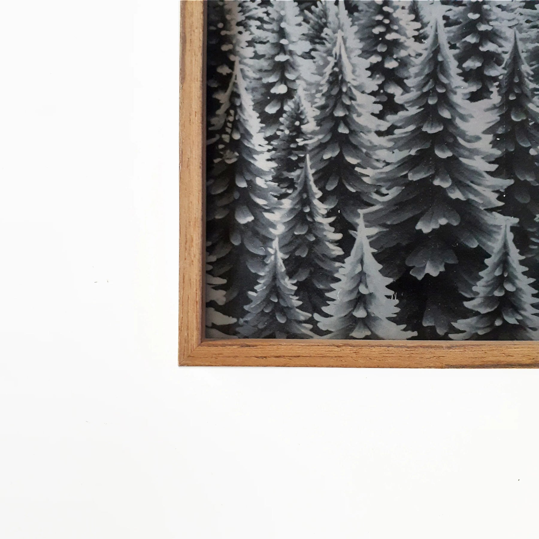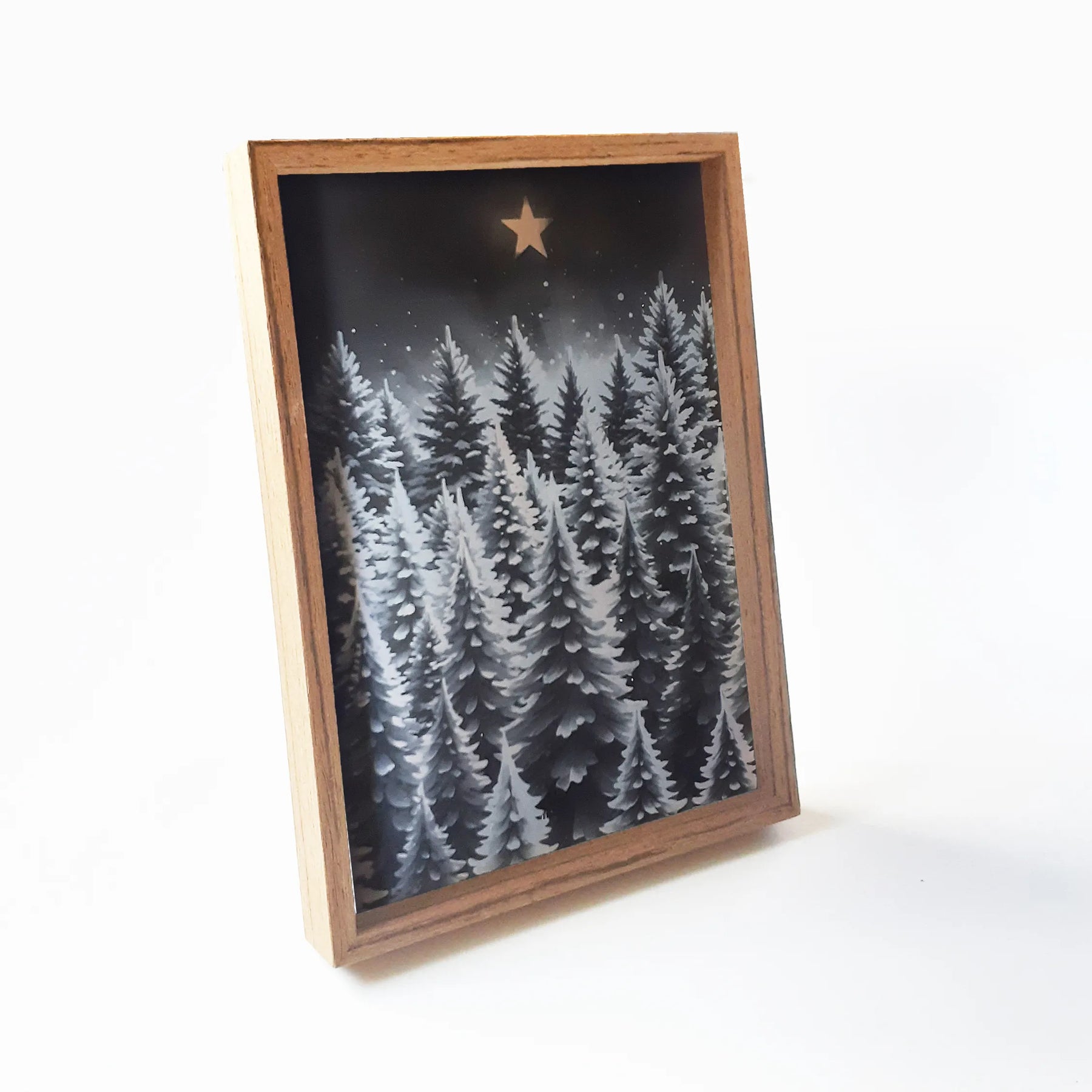 深い森の上空に星がひとつ輝き、雪をまとった樅木の列が静かな夜気の中に立ち並びます。黒と白の濃淡が奥行きを描き、星の金色がそっと温度を添える一枚です。眺めていると、冬の空気がゆっくり澄みわたり、心の中にも穏やかな灯りがともるような感覚が広がります。木枠の柔らかさとも調和し、控えめな色調のリビングや寝室の壁にも自然に馴染む作品です。