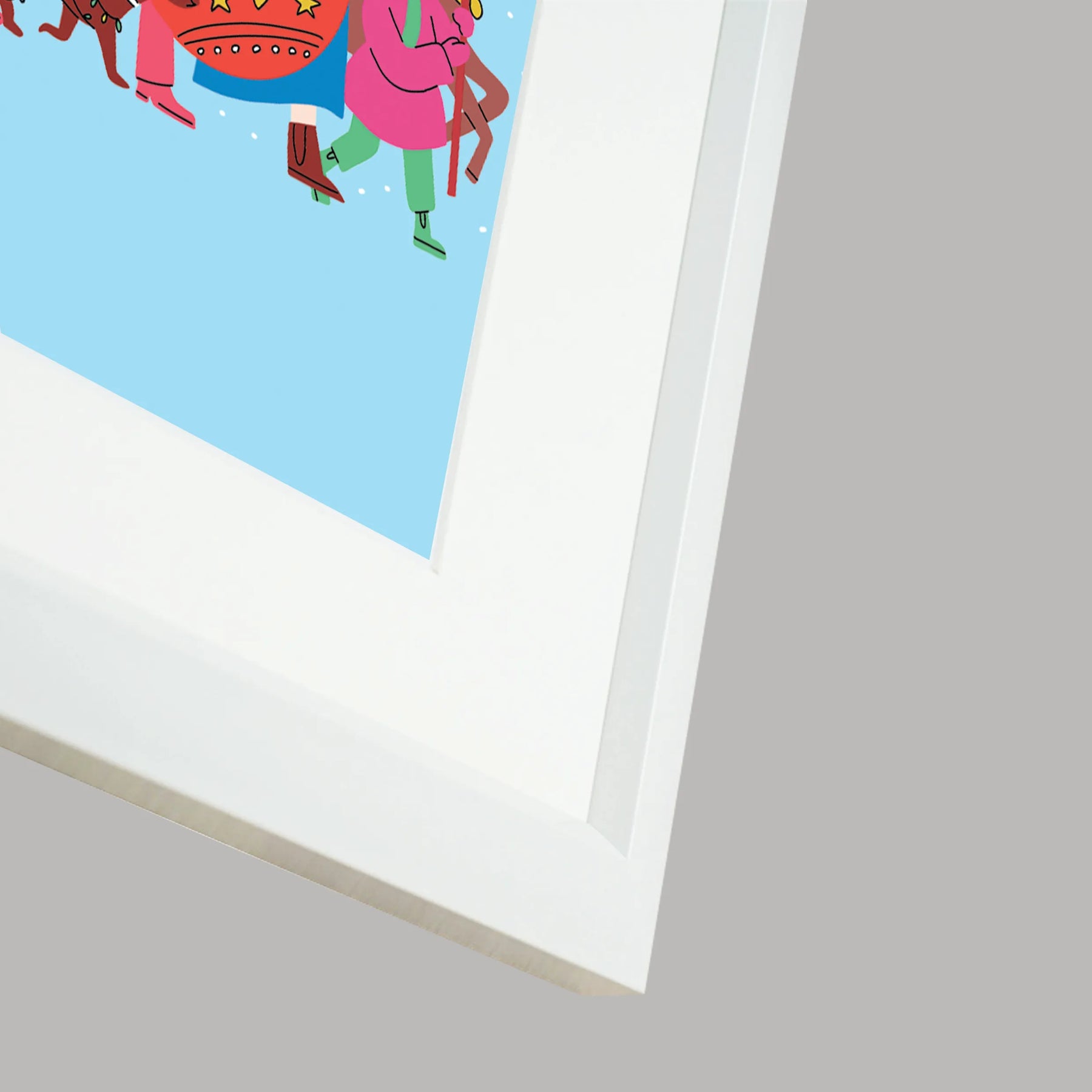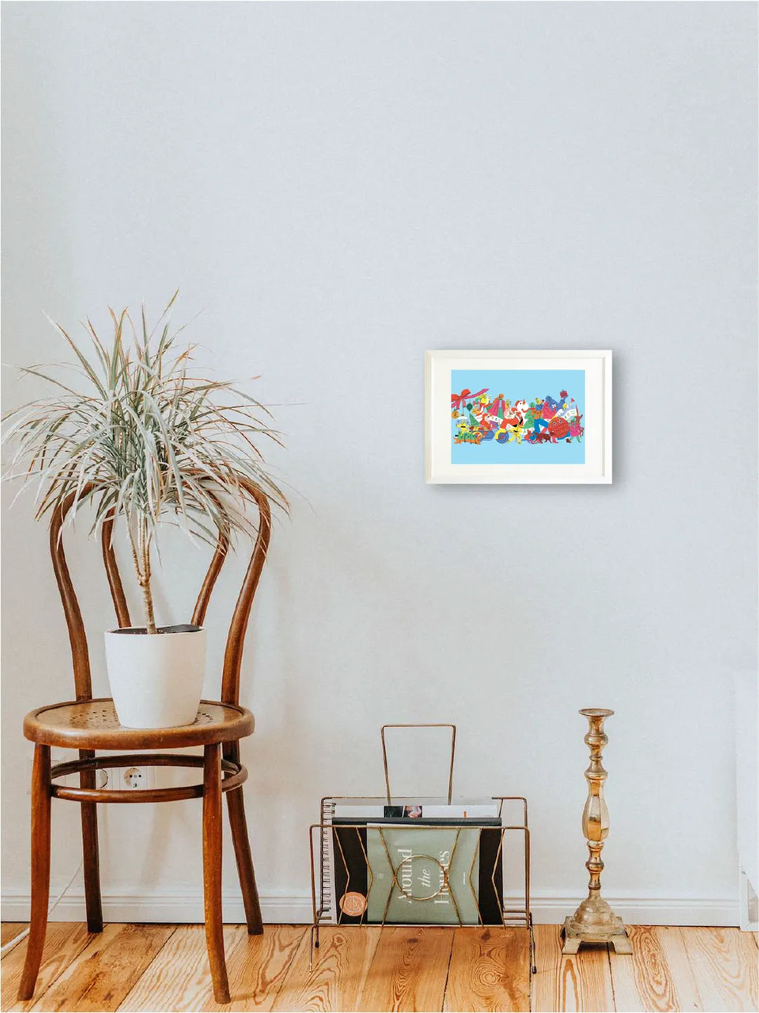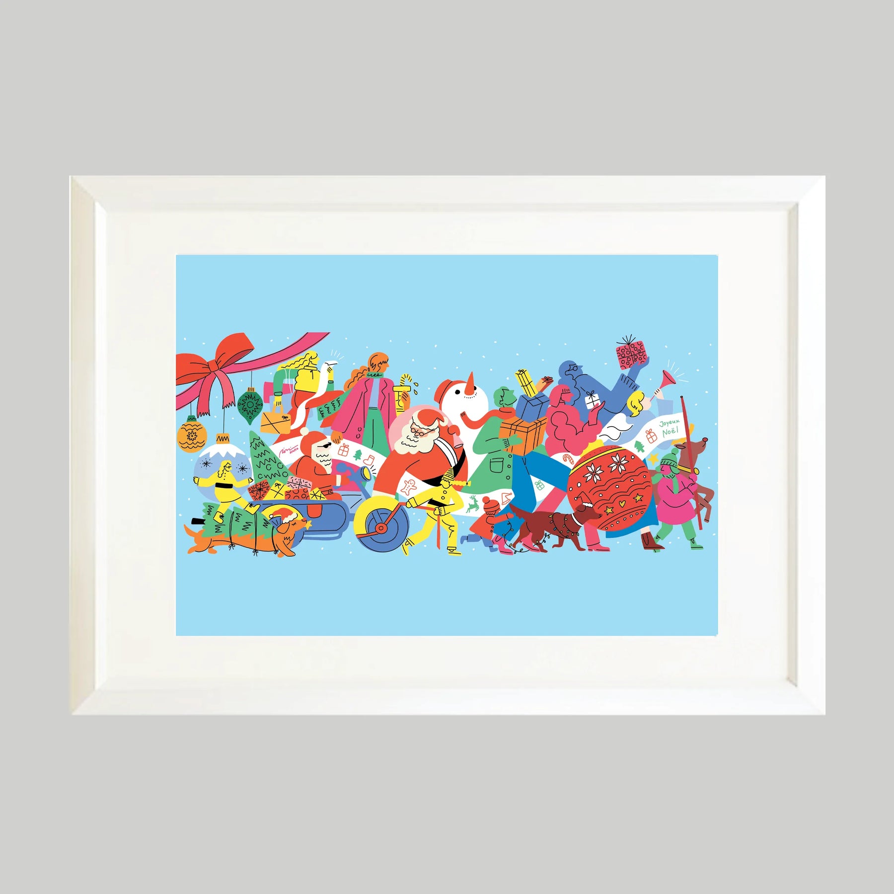 次々とプレゼントを運ぶキャラクターたちが行進する、にぎやかで楽しいホリデーアート。明るい水色をベースにした軽やかな配色が心を弾ませ、眺めるだけで気分が華やぎます。リビングや玄関、子ども部屋に飾ると季節感が生まれ、空間を朗らかに演出。シンプルな北欧インテリアやカジュアルな部屋とも相性が良く、冬のアクセントとして飾るだけでホリデー気分を盛り上げてくれる一枚です。