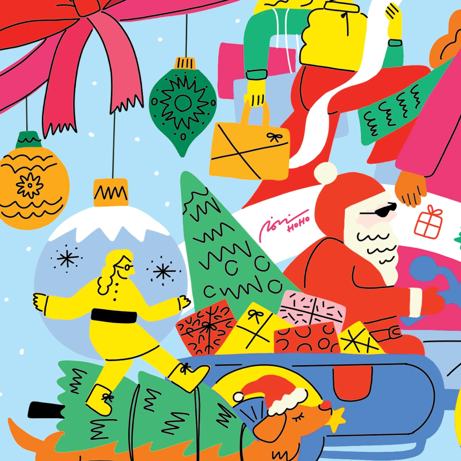 クリスマスイブに、寝ている子供達を起こさないように、リハーサルしてるサンタとプレゼントを運ぶ仲間たち。旗の中に書かれている「Joyeux Noël」はフランス語で「メリークリスマス」を意味します。当日ちゃんと運びきれますように。