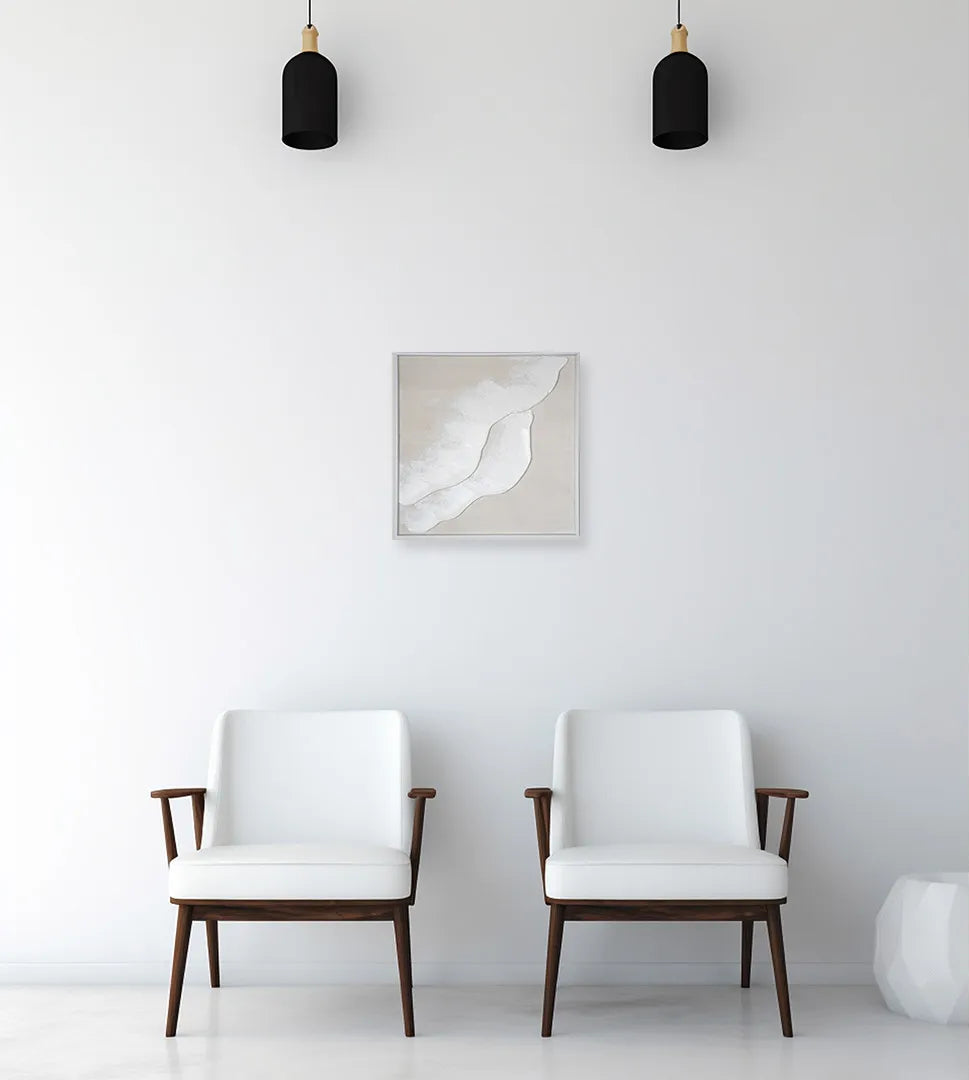 柔らかな白が静かに重なり合い、砂に風が描く模様のような穏やかな広がりを感じます。飾る瞬間に部屋へ澄んだ気配が届き、空気がゆっくり整うようです。リビングや寝室の落ち着いたインテリアにも自然と溶け込みます。