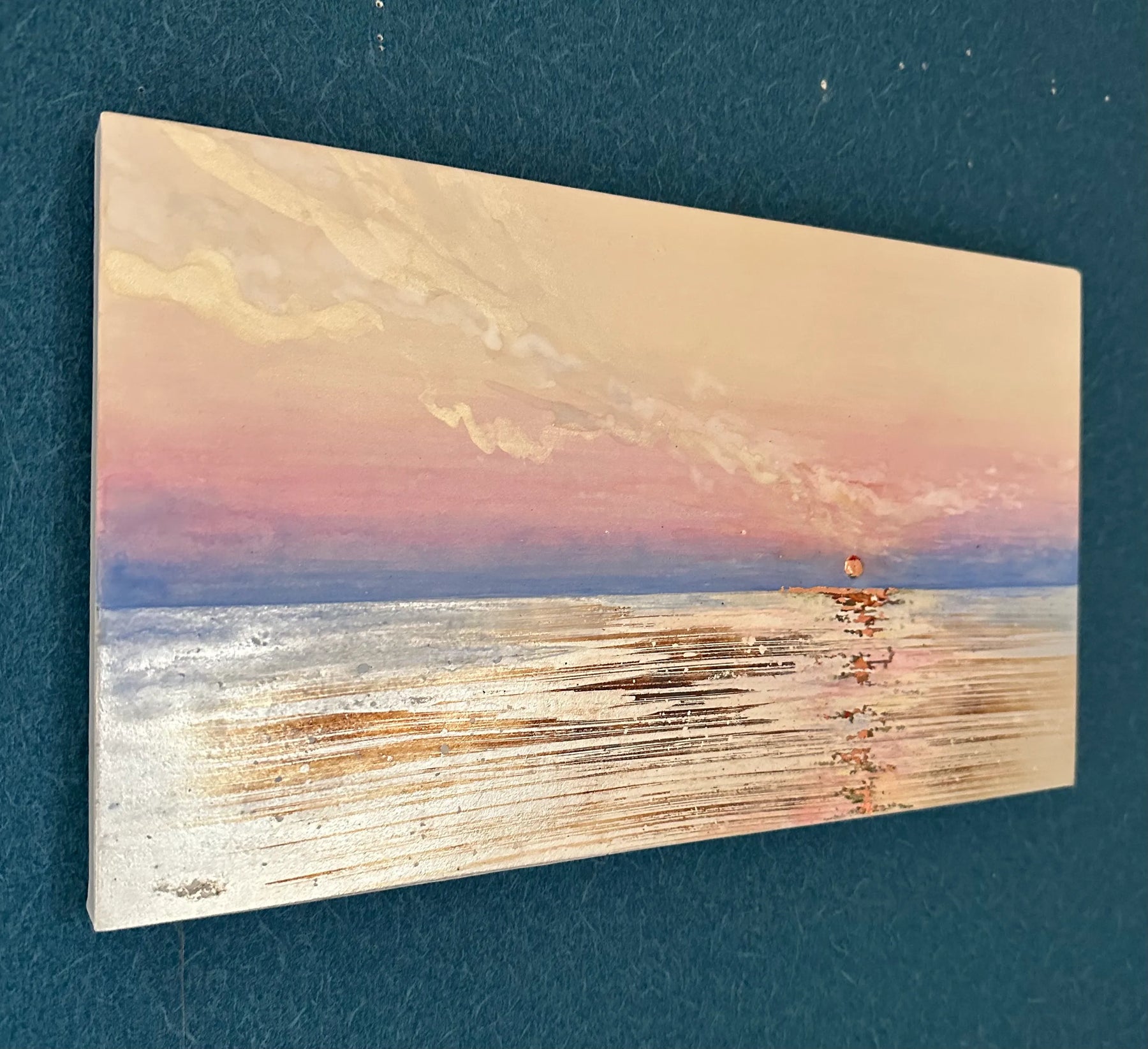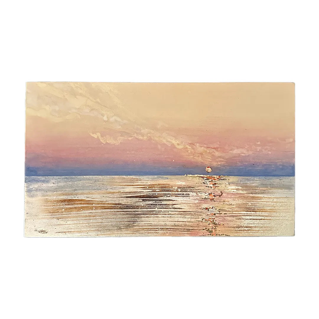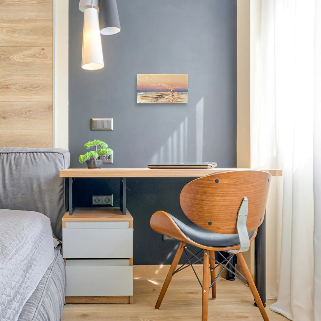 水平線に沈む宝石のような夕日が、水面を金色に震わせながらゆるやかに広がり、柔らかな薄桃の空と溶け合う情景が胸の奥に静かな温度を残します。壁に掛けると、部屋にほのかな伸びやかさが生まれ、日常の時間がゆっくりとほどけていきます。落ち着いたリビングや穏やかな寝室にも自然に馴染み、空間に穏和な広がりを添えてくれます。