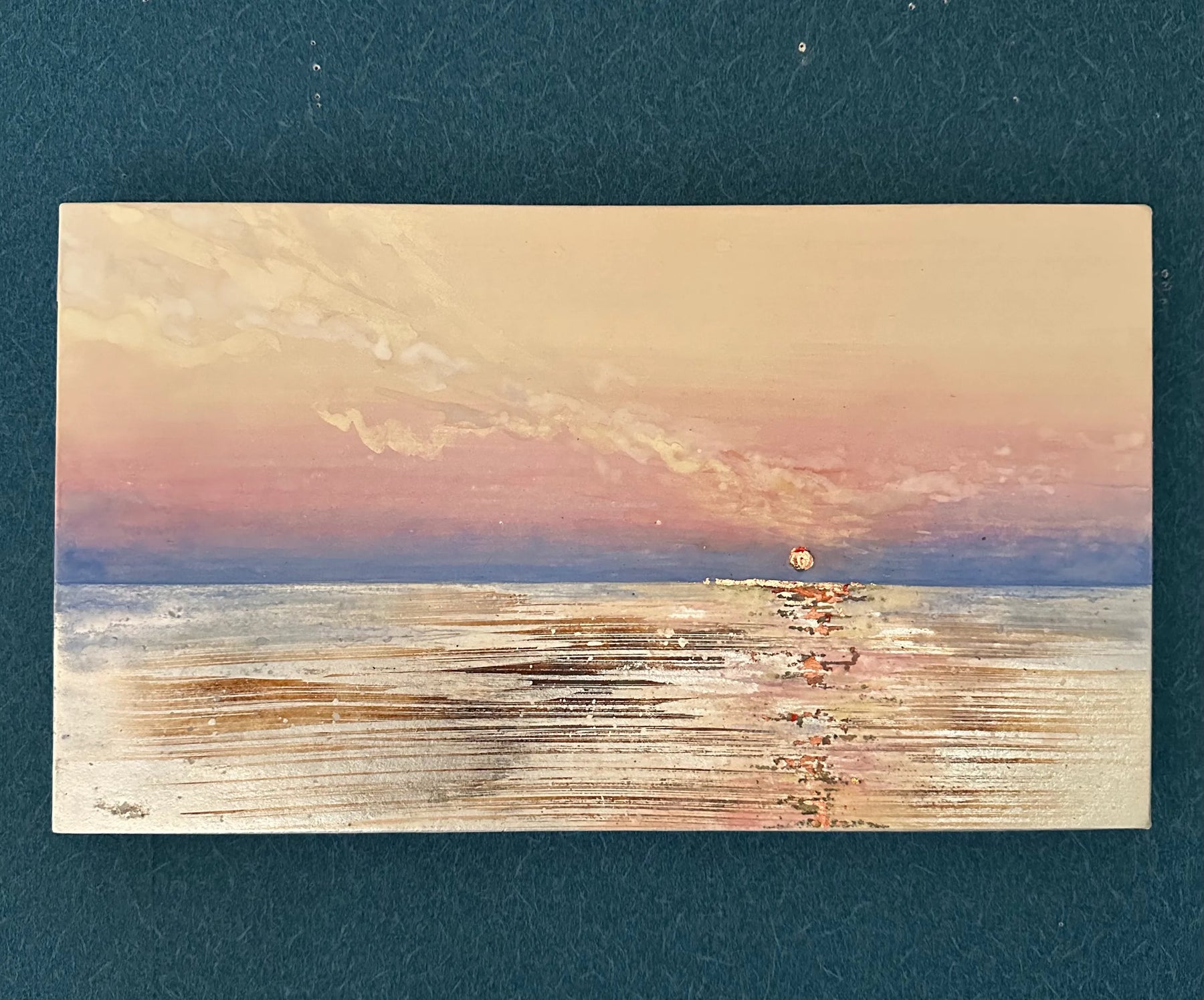 夜明け前の静寂からゆっくりと日の出を待つ贅沢なひととき。 波は穏やかで鏡のような水面には銀色の光がゆらめき、わずかな風が水面を揺らして幻想的に輝く。 新たな一日の始まり…。 金沢の銀箔や金属箔を使用して穏やかな輝きを加えています。 光のあたり方、時間帯によって色合いが変わります。