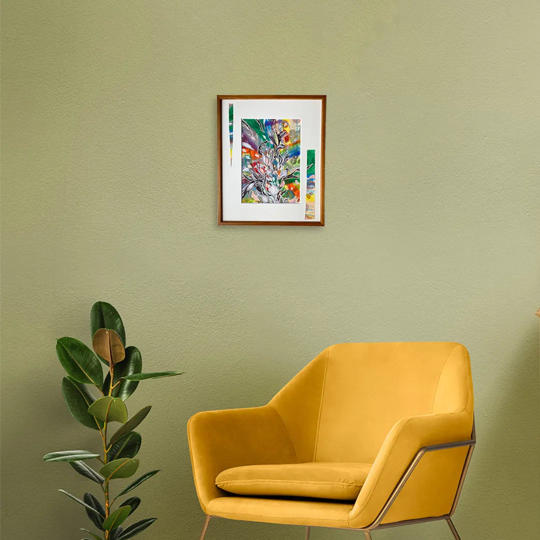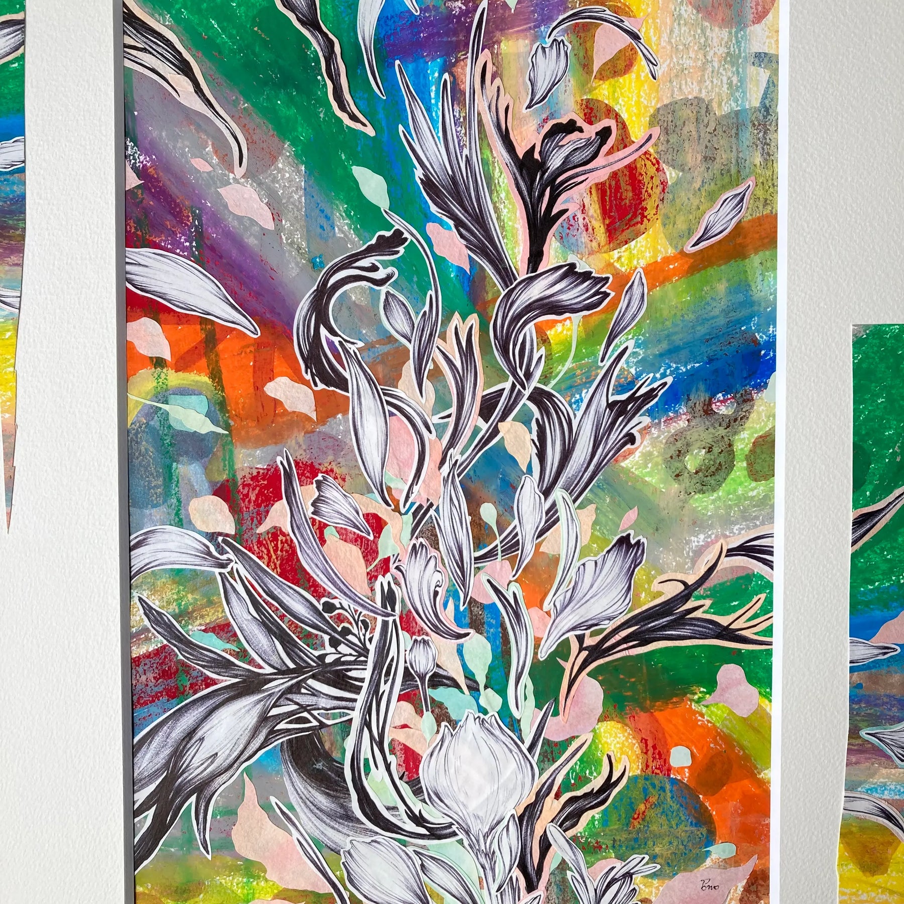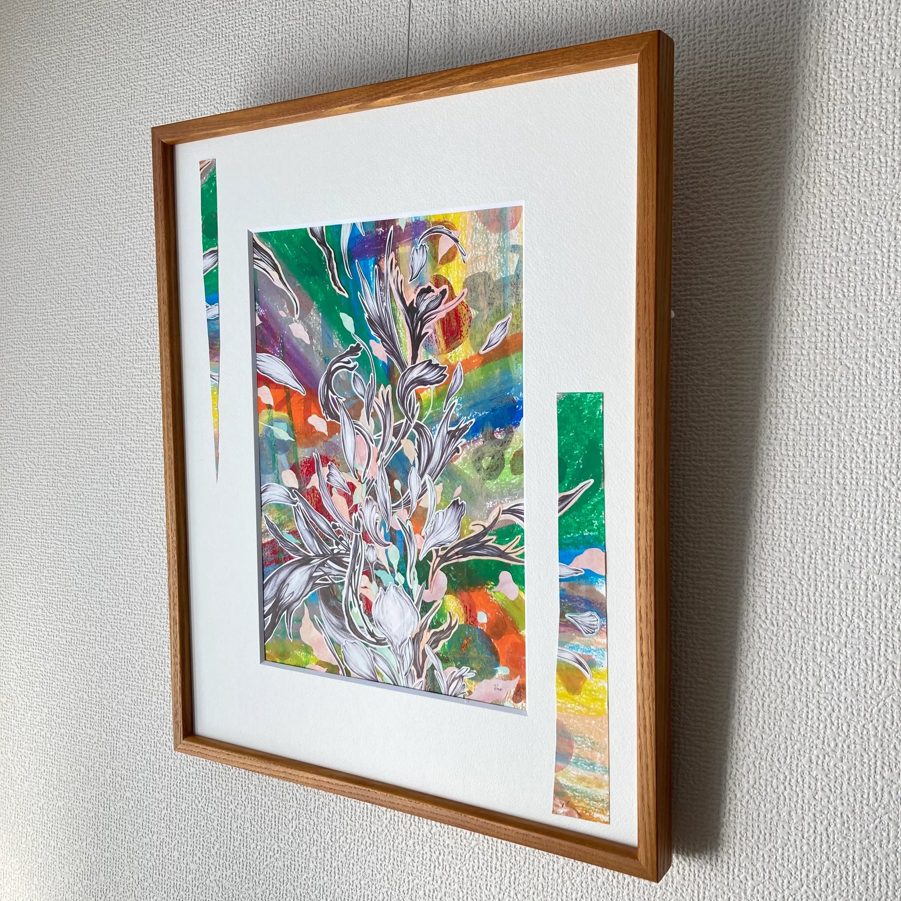 鮮やかな色の流れに白い線描の植物が浮かび上がり、光の層がそっと脈打つような気配を宿しています。壁に掛けると周囲に華やかな勢いが広がり、リビングやワークスペースにも心地よく映えます。木製の家具や柔らかな色調のインテリアと組み合わせると、より自然に調和します。
