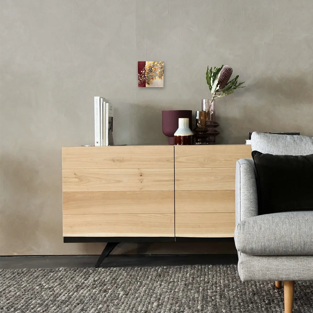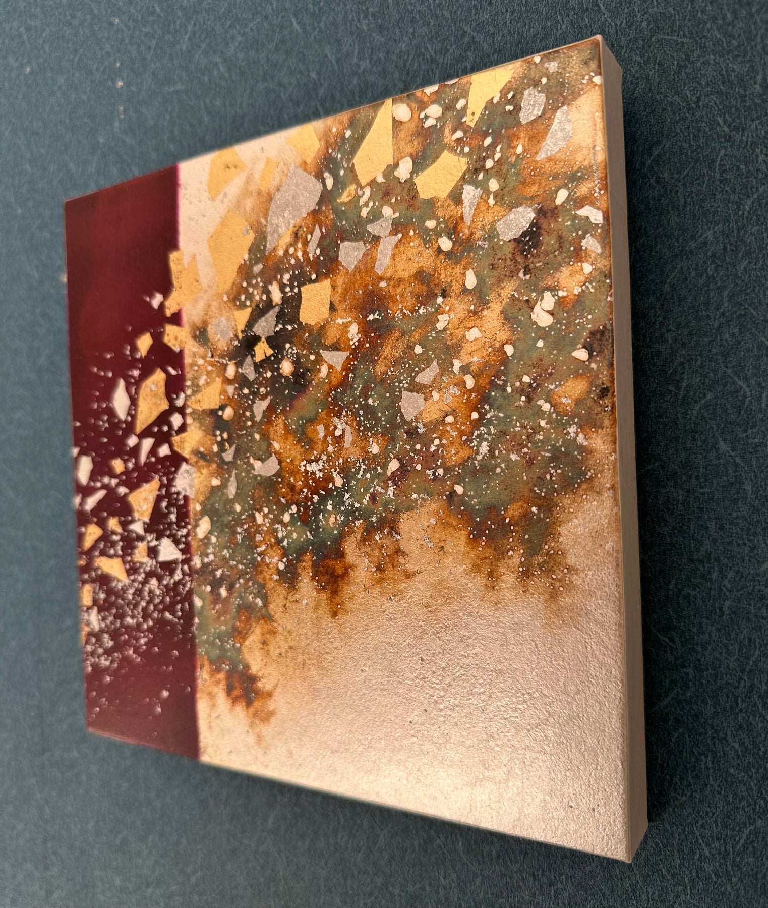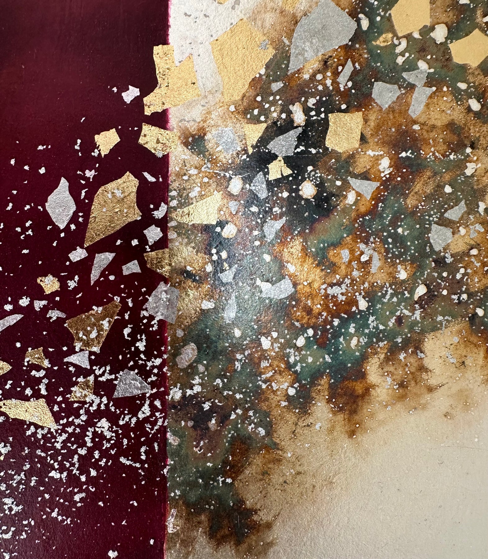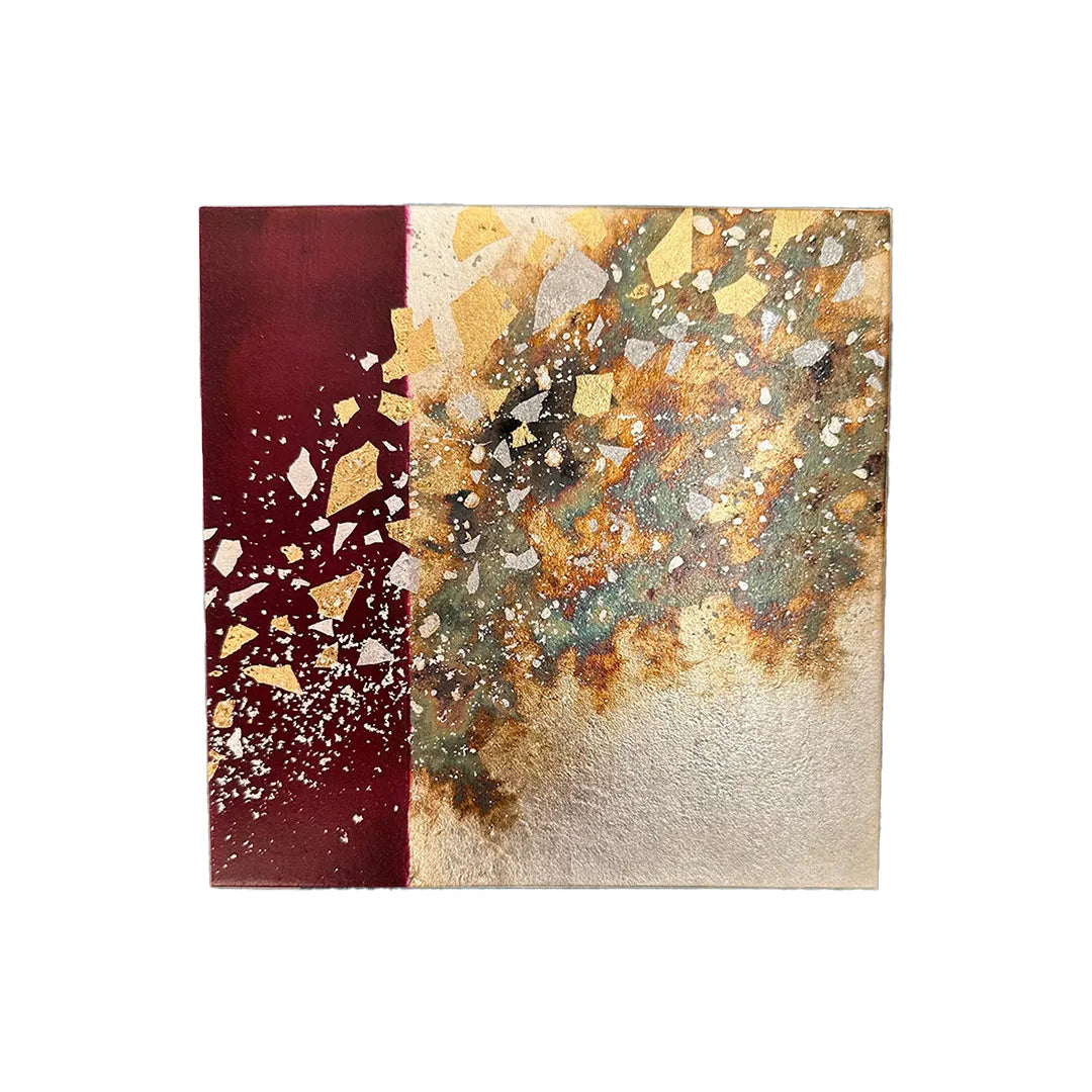 深紅の縁から砕けた光が舞い上がり、金属の滲みが雲海のように揺れる情景がそっと立ち上がります。飾ることで静かな部屋に緩やかな躍動が宿り、書斎や木調のリビングにも柔らかく調和しながら、日々の視線に新しい息づかいを添えます。