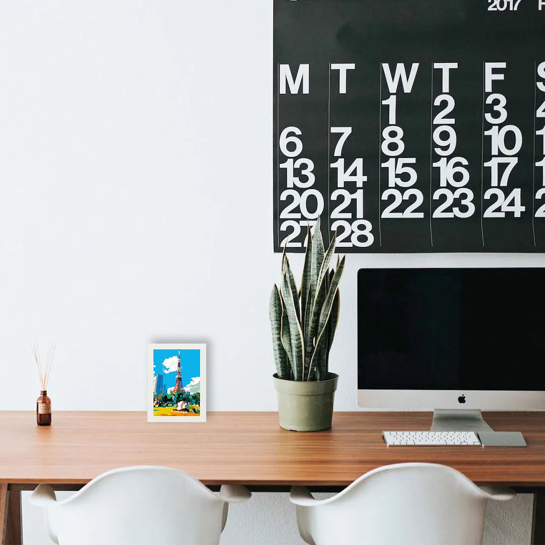 澄んだ青に赤い塔が伸び上がり、芝生に落ちる光がゆったりと午後の温度を運んでくれるように感じます。壁に飾ることで部屋に開放感が生まれ、視界に爽やかな抜けをもたらします。リビングの白い棚や木調のテーブルとも自然に調和し、仕事部屋にも心地よい活気を添えます。