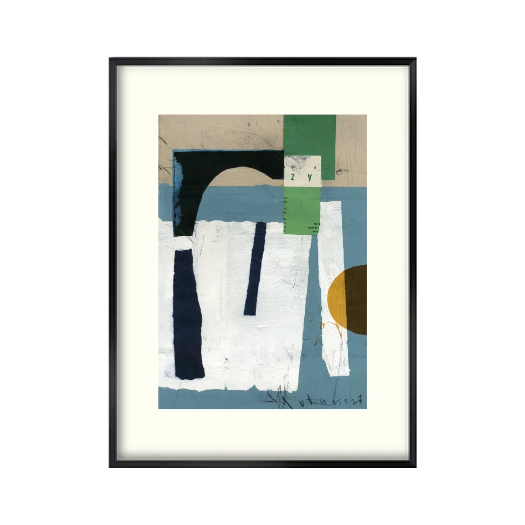 本作品は、ブルーやホワイトを基調に、幾何学的な形状とコラージュが融合した抽象画です。黄土色やグリーンがアクセントとなり、動きとバランスが感じられるモダンで洗練されたデザインが特徴的ですね。