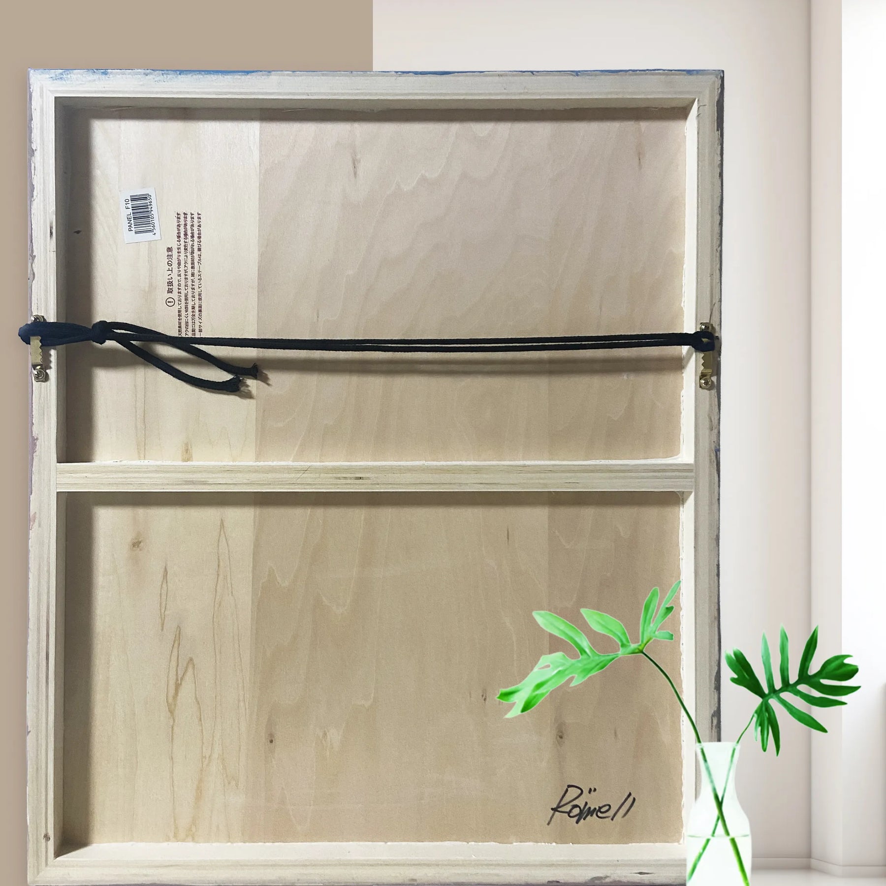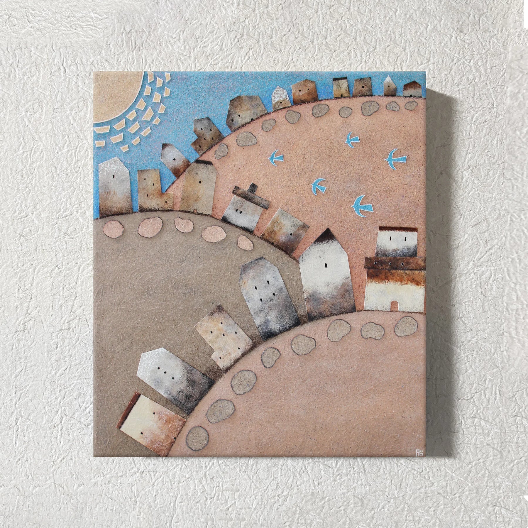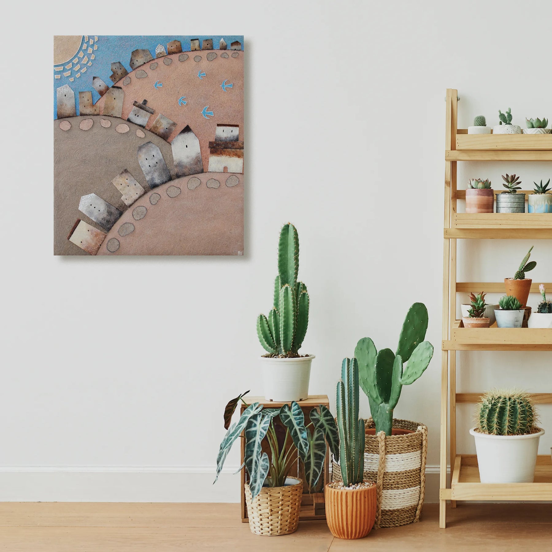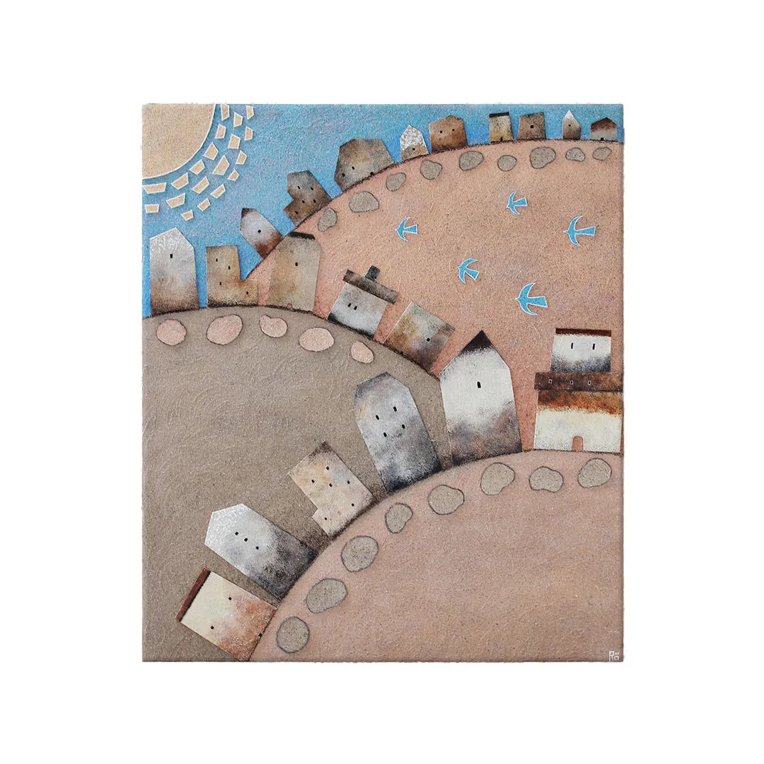 土の色を帯びた丘に家々が沿い、空には小さな鳥が弧を描いています。傾きのある配置が視線を誘い、散歩道を歩くような高揚が残ります。壁に迎えると、空間に緩やかな流れが生まれ、時間の感覚がやわらぎます。リビングや廊下に置くと、木や陶の家具とも心地よく調和します。