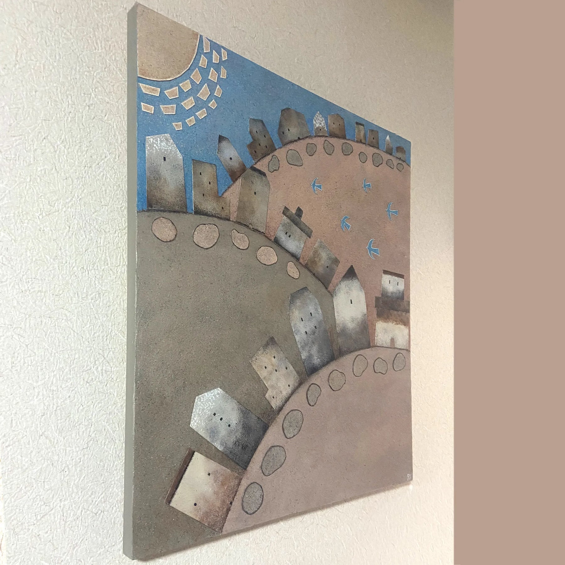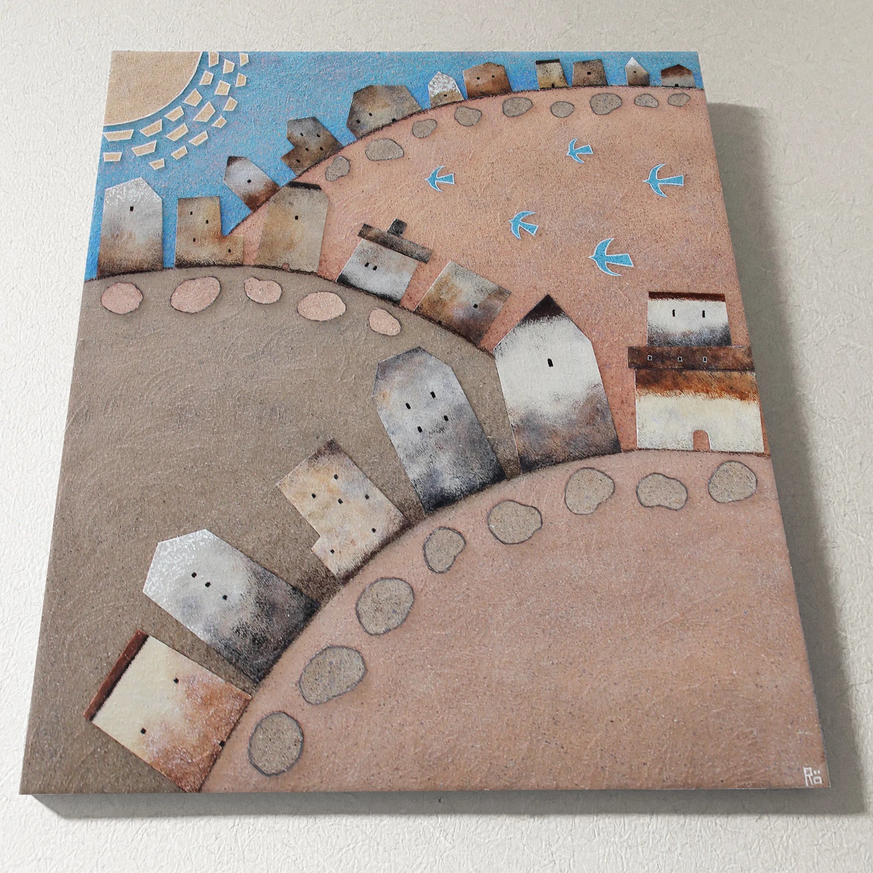支持体に砂の塗料を使用し凹凸をつけ壁のような土台を作り、家には塗料に漬けた高級水彩紙に独自技法による無数の粒子で陶器のような質感を演出した作品です。 STORY 配色 : 茶色・黄白色(ベージュ) 石灰岩と洞窟内の印象で茶色と黄白色を中心に描きました。 形状 : ヨーロッパ風の家のまわりに石灰岩でつくった家が並ぶ世界に類を見ない奇岩の風景と洞窟住居で世界文化遺産に登録されたトルコのカッパドキアの印象と自己のイメージをアレンジして制作いたしました。 (作品の建物自体はは穴の空いたような洞窟住居のそばに真四角の建物が立っており、その対比に惹かれ四角い建物を選び制作いたしました。 全体的に茶で表現したグランジテイストの構成と空の青のコントラストが光ります。 丘の上に横一列に並んだ家々や太陽と空を飛ぶ鳥たちの様子から、あたたかさや可愛らしさを感じていただけますと幸いです。 本作品が癒しや心地よさとなり、幸せな空間を彩れるよう願い制作いたしました。