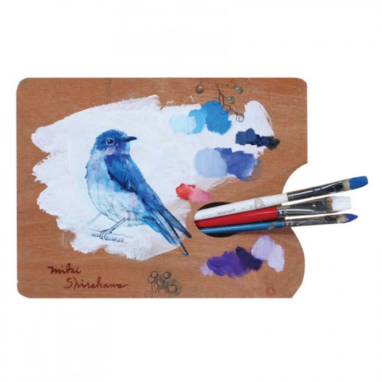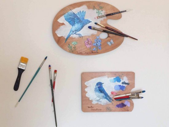 青い鳥が描かれる瞬間を、絵筆やパレットごと閉じ込めたユニークな作品です。