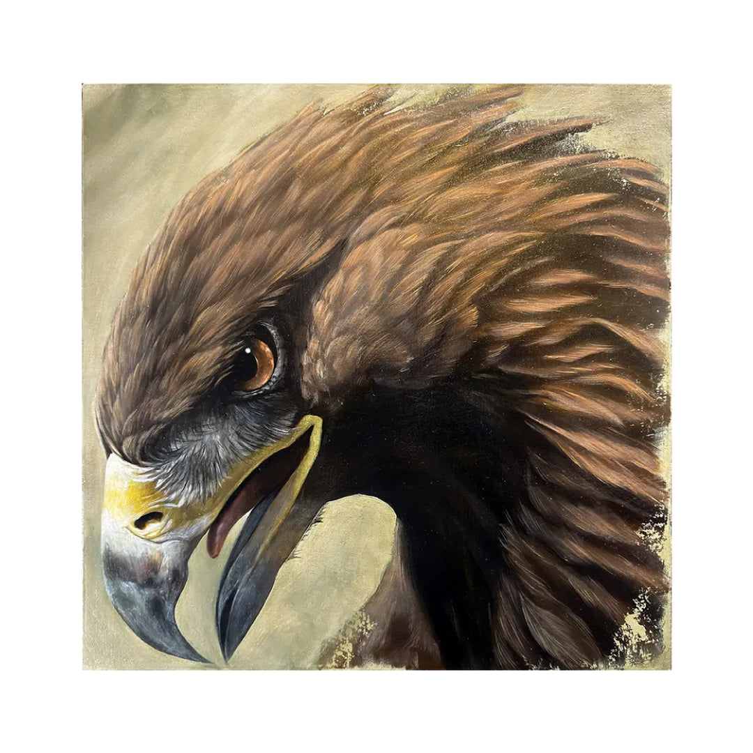 イヌワシの力強い姿を描いた作品で、英名であるGolden Eagleから羽毛に金の塗料を施すことによって、光に映えて輝き、絵画でしか楽しめない作りとなっております。また羽毛の細部や鋭い眼光が威厳を放ち、背景の穏やかな色調がその存在を際立たせます。過酷な自然を生き抜く守護者のストーリーを感じさせ、お部屋に飾れば空間に力強さと輝きをもたらします。