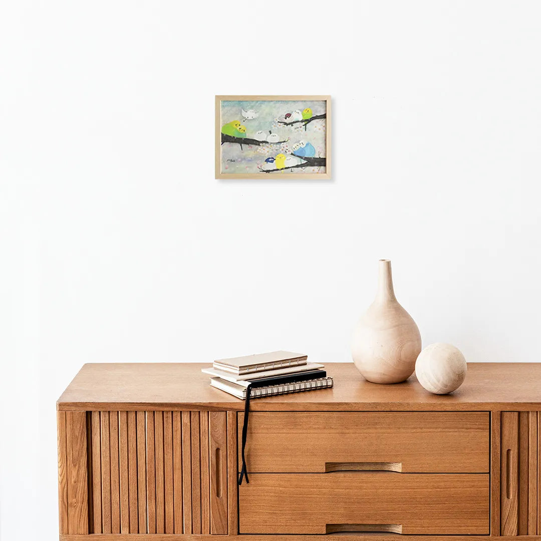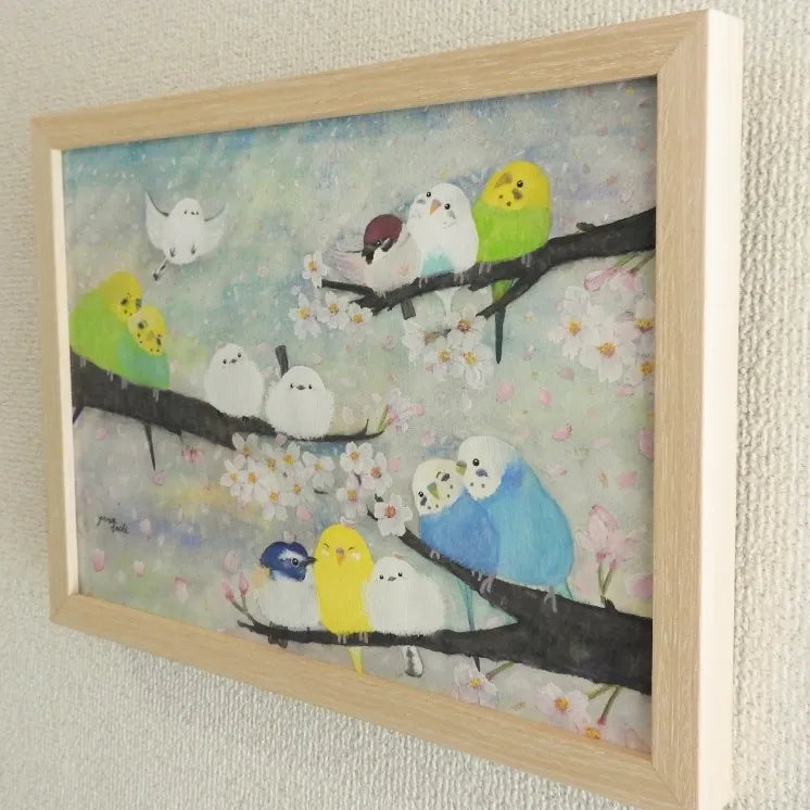 仲睦まじく寄り添う姿が繊細な筆致で描かれています。春の柔らかな光を纏ったような色彩は、眺めているだけで心に穏やかな安らぎと、新しい季節への期待を届けてくれるでしょう。この作品を壁に飾れば、空間に心地よい春風が吹き抜け、日々の暮らしに瑞々しい潤いが生まれます。木目調の落ち着いたコンソールテーブルの上や、家族の笑顔が集まる明るいダイニングにも美しく調和します。