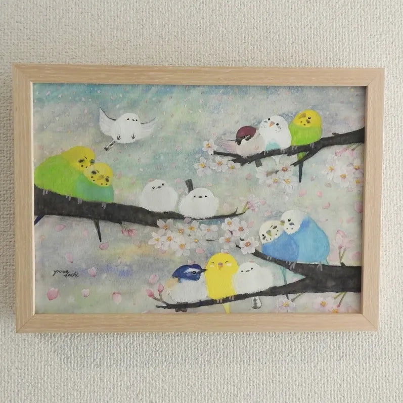 - 幸せを運ぶさくら 小鳥たちの和やかなお花見を描きました。
