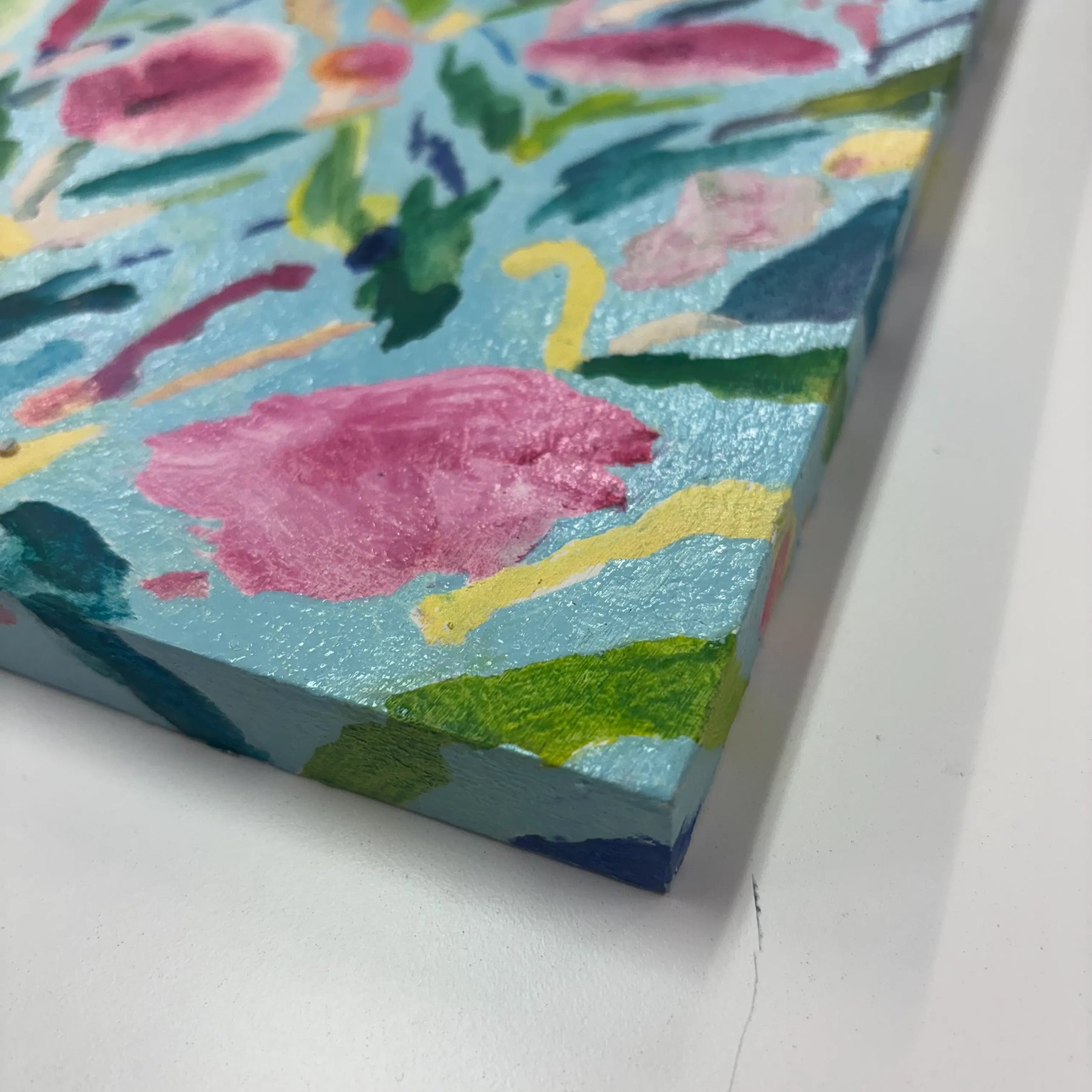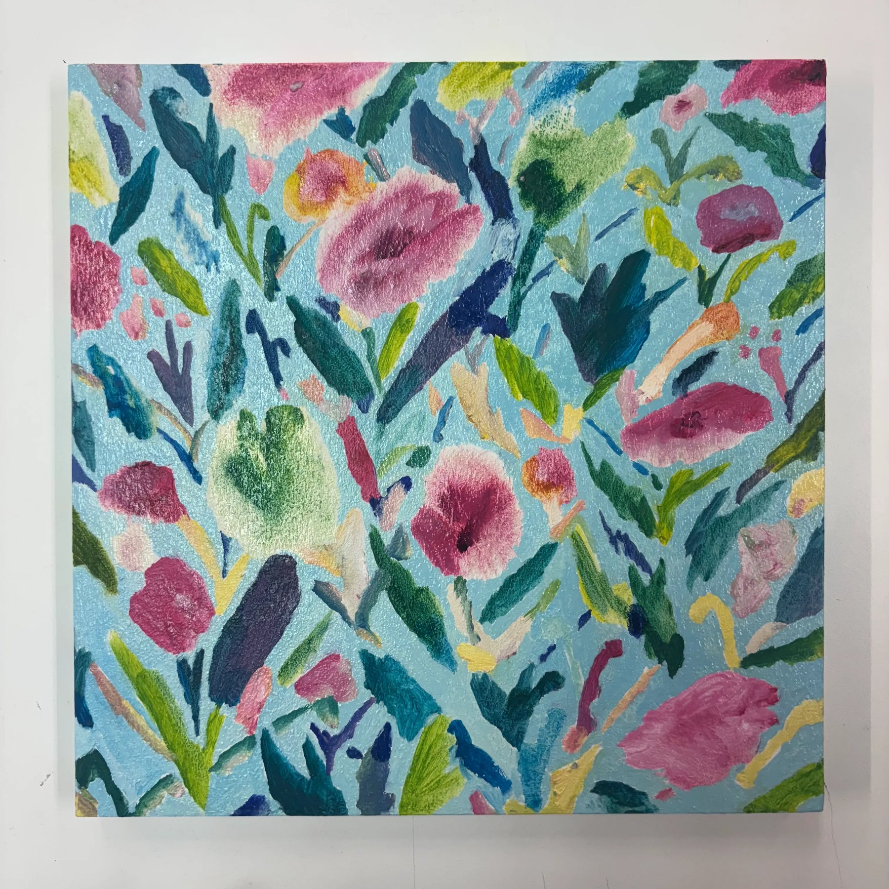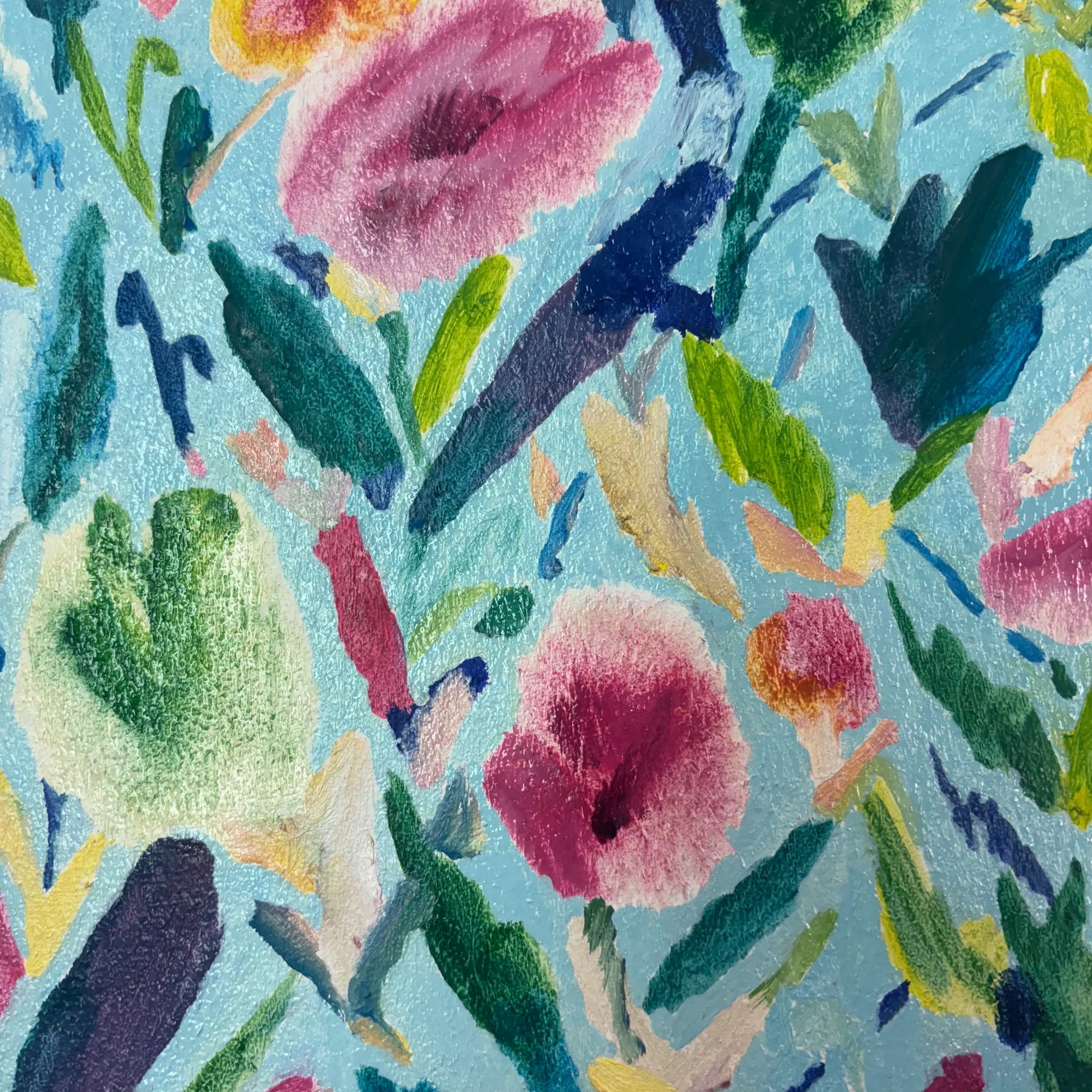 水色の地に、花や葉の形が軽やかに散り、筆の重なりが野原のざわめきを運びます。点在する色の粒が視線を誘い、歩くたびに景色が入れ替わる感覚です。壁に掛けると空間が明るくひらけ、気配が前向きに整います。ダイニングや子ども部屋に添えると、白壁や明るい木目と響き合い、暮らしに伸びやかな彩りを加えます。