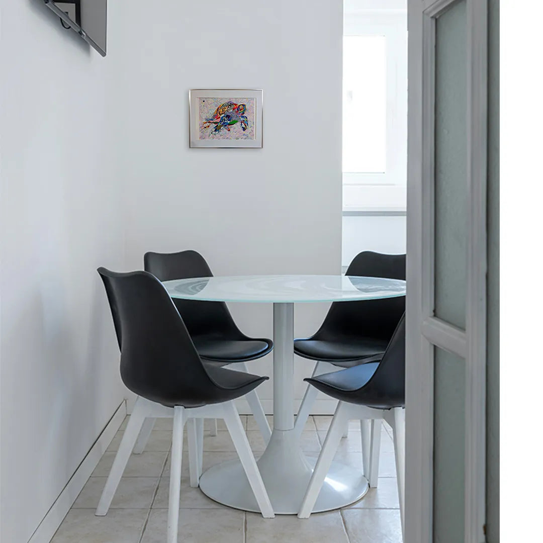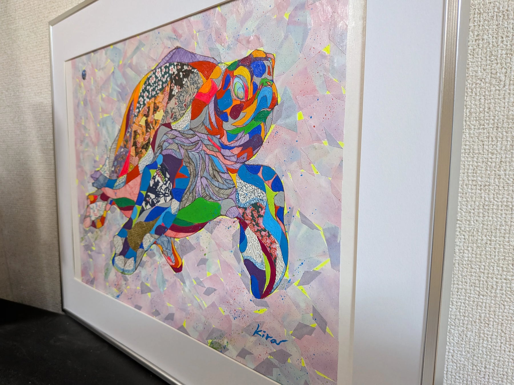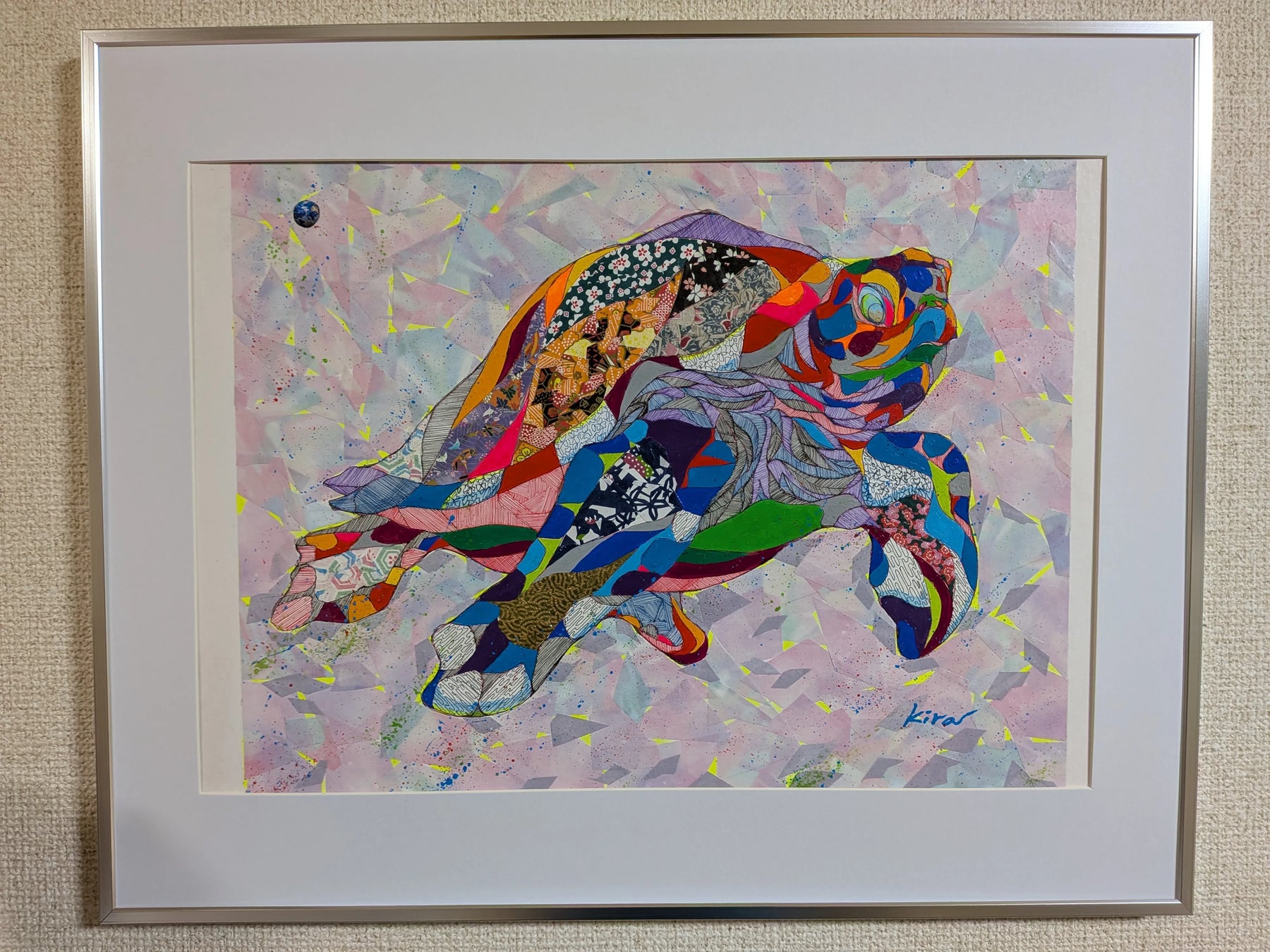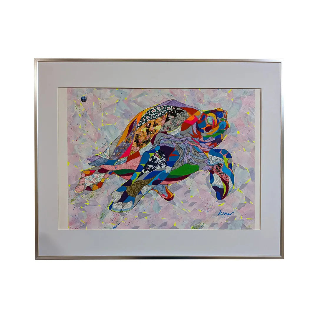 緻密な幾何学模様と多彩な和柄がパズルのように組み合わさり、悠々と泳ぐ海亀の姿を力強く描き出しています。細部まで描き込まれた線の集積は、万物が混ざり合う世界の豊穣さを物語り、眺めるほどに新たな発見と高揚感を届けてくれるでしょう。この独創的な一作を飾ることで、室内には瑞々しい活気が漲り、空間をドラマチックに勇気づけます。広いリビングやエントランスに、モダンな調度品と設えるのが最適です。