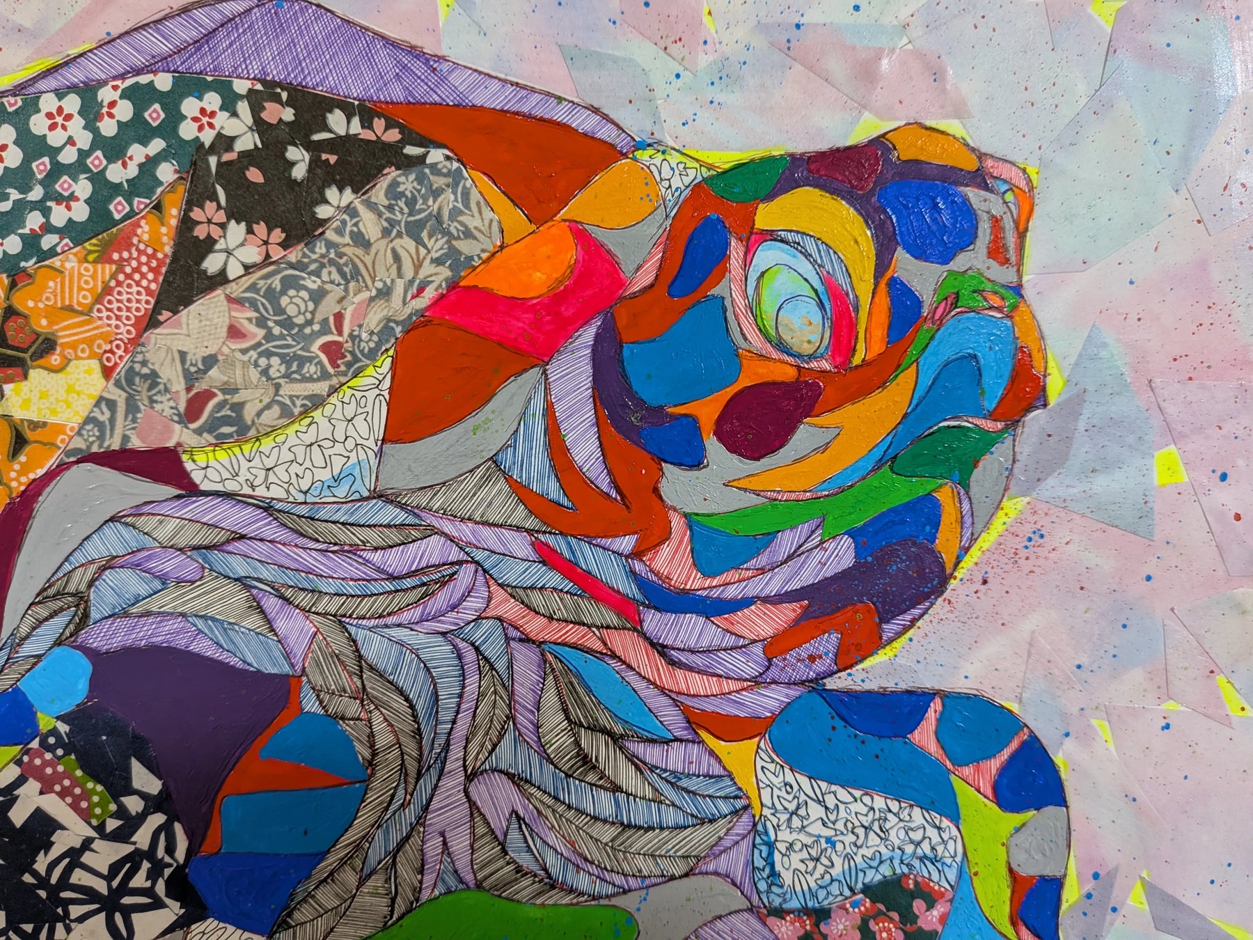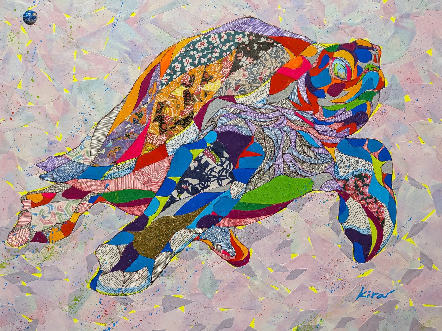 - この作品は、亀をモチーフに「時間」「記憶」「旅」をテーマとして描いた抽象表現作品です。 亀の甲羅に広がる多様な色彩や文様は、個々の記憶や文化、感情の断片を象徴しています。それらは一見バラバラでありながら、一つの生命として調和し、前へと進んでいきます。 ゆっくりと、しかし確実に進む亀の姿には、急がずとも自分の歩幅で人生を進んでよいというメッセージを込めました。