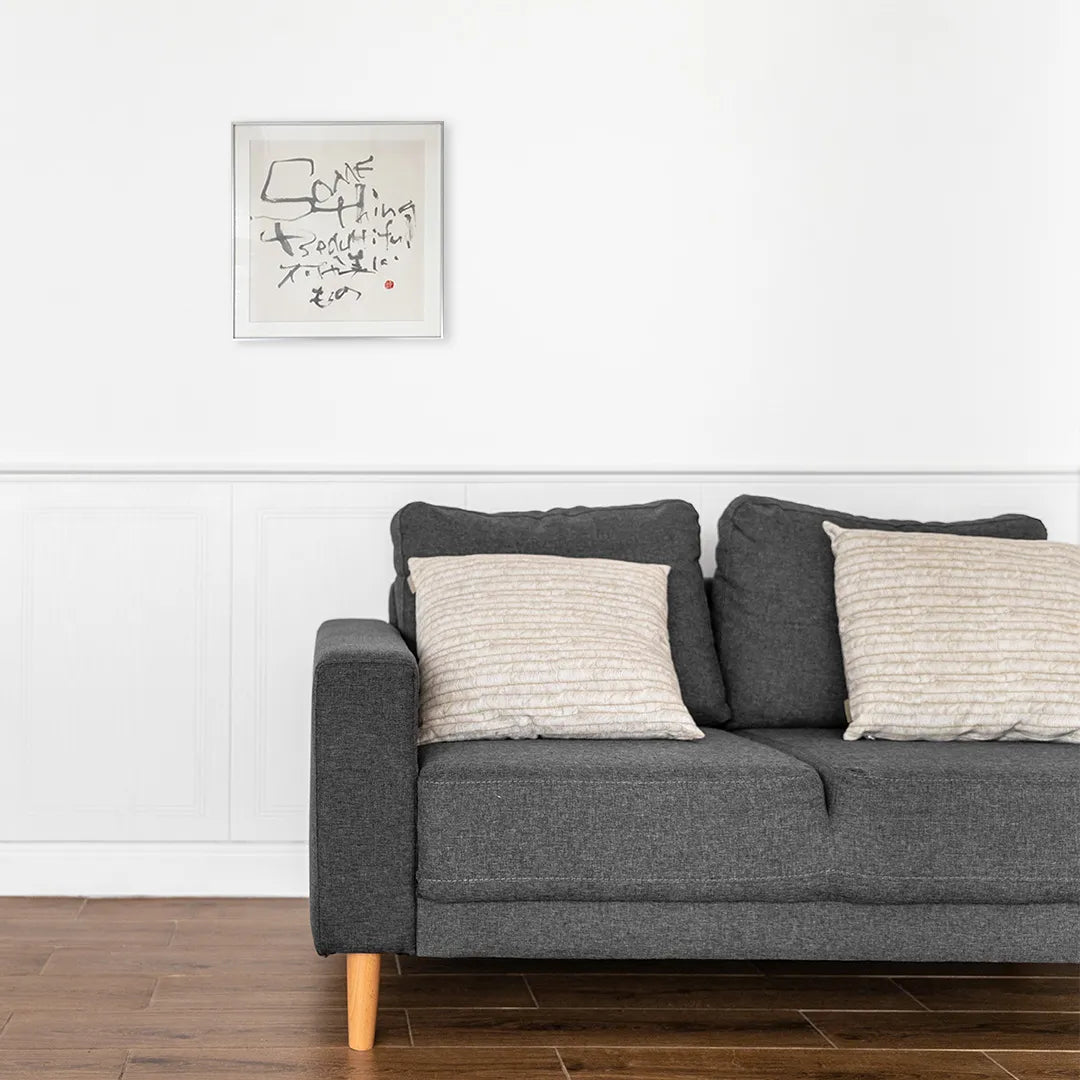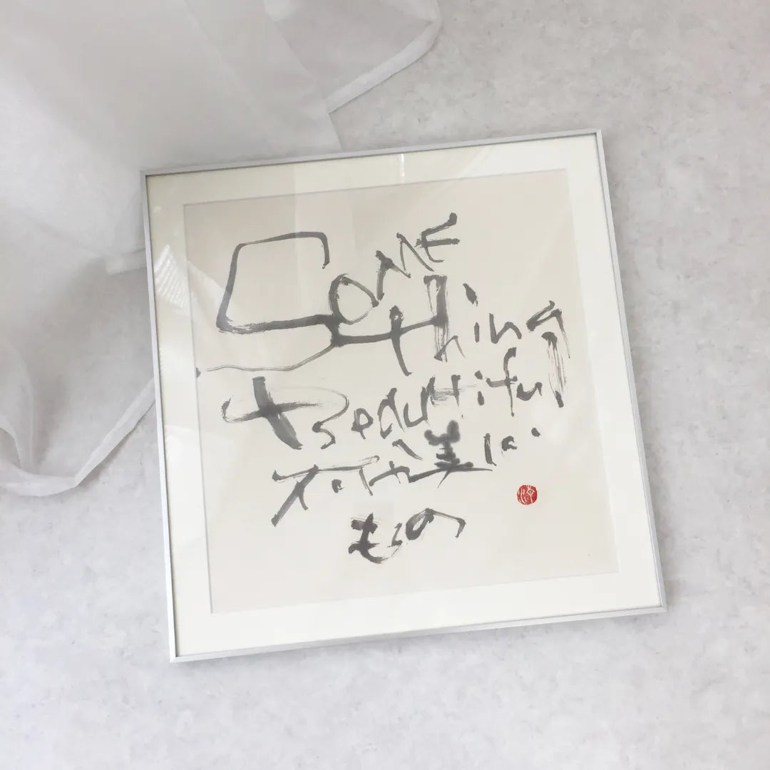 - Something Beautiful Casual and inorganic. Precisely because it is unpolished, something unexpectedly catches the heart. This work was born from the question: 「Does beauty exist only within perfect forms?」 A deliberately distorted typeface that maintains legibility. Lines that seem uncalculated, yet capture the very fluctuations of emotion, quietly touch the viewer's sensibility. The contrast with the nearly square, formal mounting highlights the calligraphy's 「imperfection」, bringing tension and negative space to the room. The soft gradations of pale ink change expression depending on the light and time of day, allowing you to discover new 「beauty」repeatedly in daily life. The outer frame uses a silver steel frame, allowing it to blend naturally not only into Japanese-style spaces but also into modern, minimalist, and industrial spaces. A one-of-a-kind piece crafted over a four-month production period. While it is a work meant to be read, it is also a calligraphic piece to be owned through sensation, transcending meaning.
