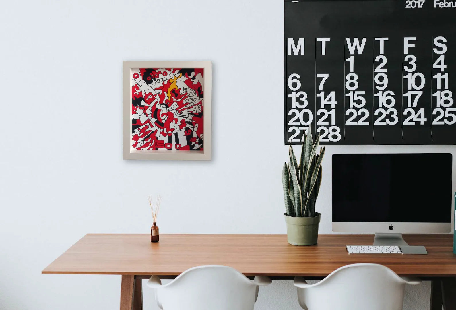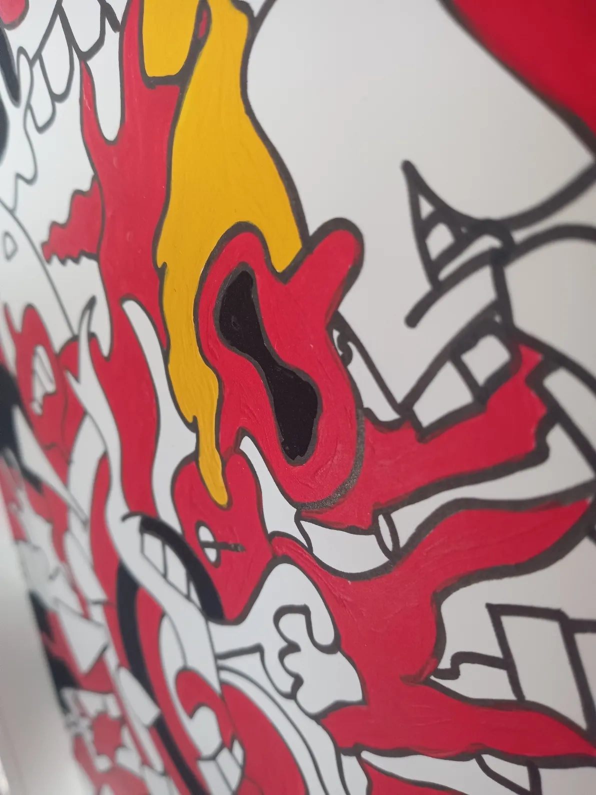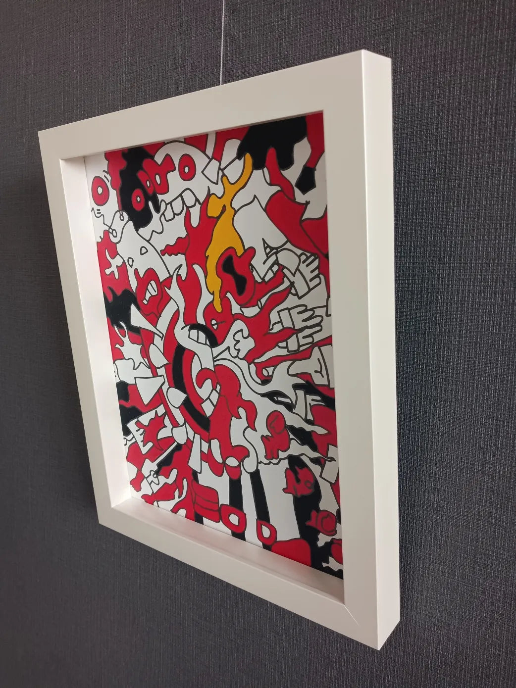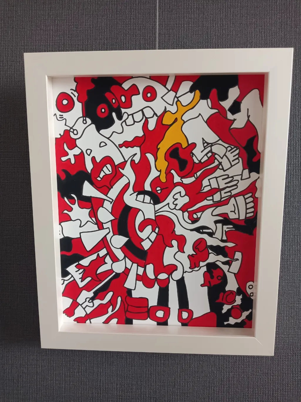 赤・黒・白の強烈なコントラストで構成されたポップアート作品。渦を巻くような構図に、多様なキャラクターやモチーフが入り混じり、混沌としたエネルギーの爆発を感じさせます。中央から放射状に広がるラインと黄色のアクセントが、リズム感と生命力を与え、見る者の心を揺さぶります。飾ることで空間全体が一気にアクティブになり、日常に刺激と遊び心をプラスしてくれる一枚です。