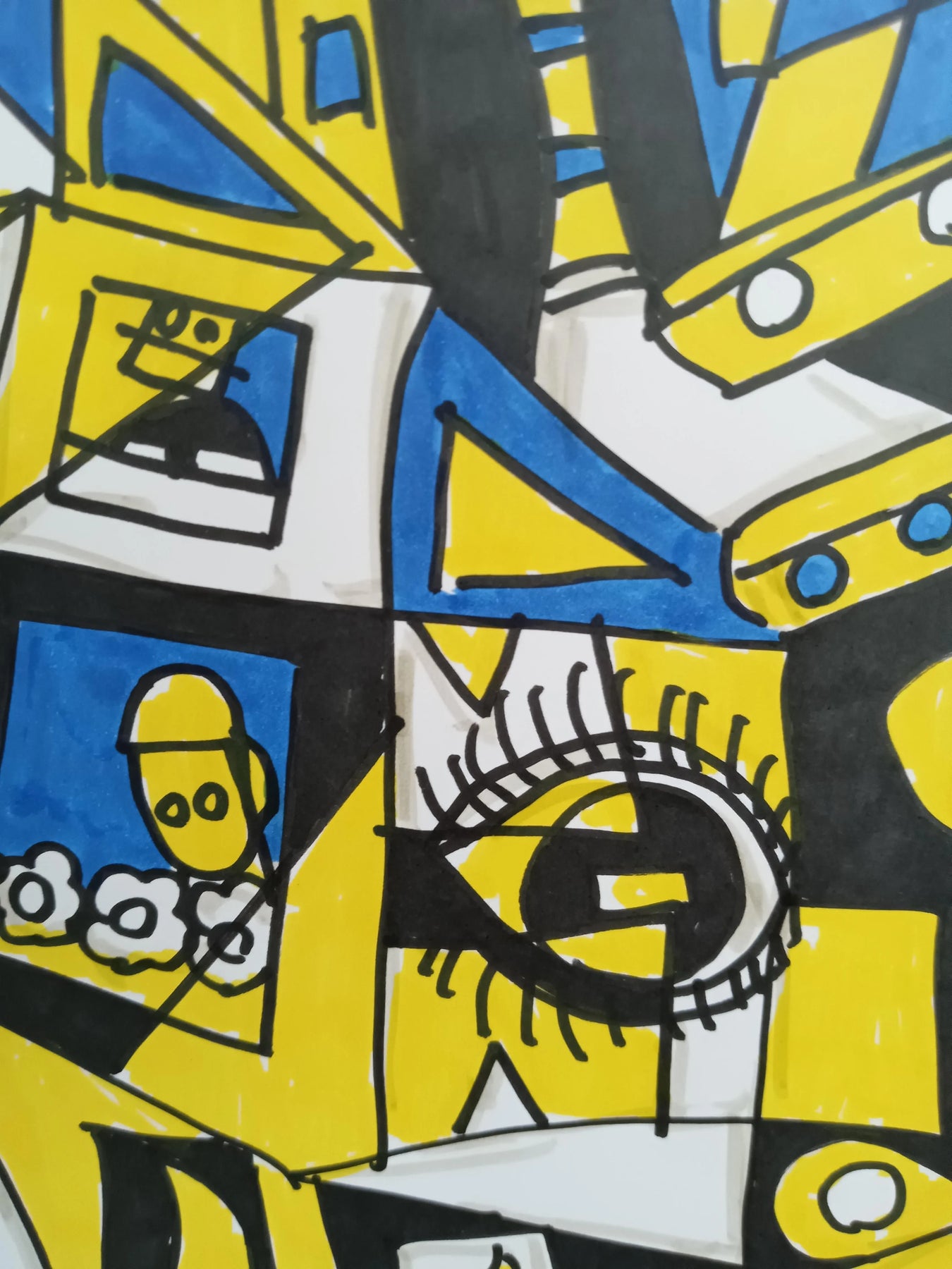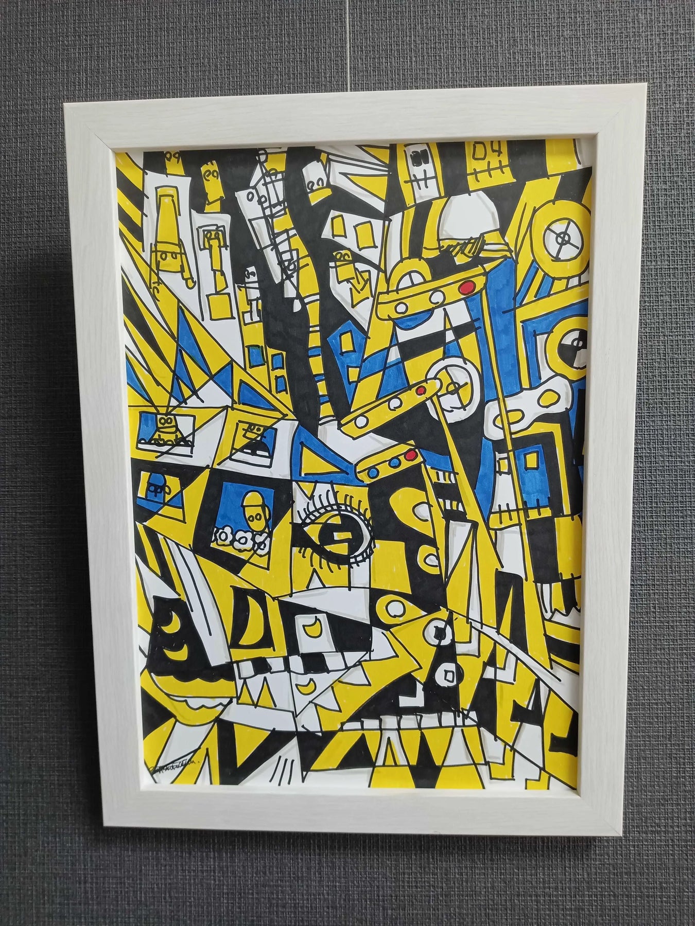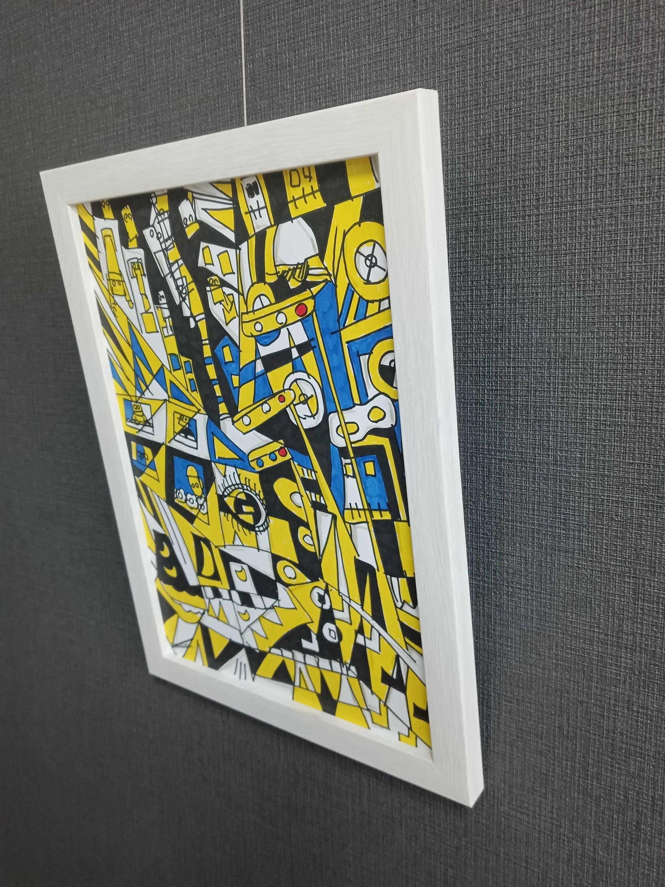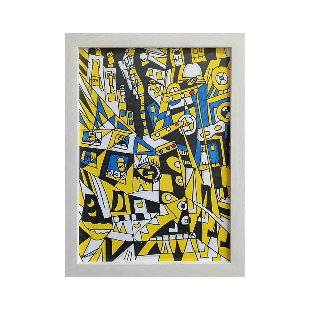 鮮烈なイエローとブルーが交錯し、都会のダイナミズムを鋭い感性で切り取ったような一作です。緻密に構成された幾何学模様の中に、多様な視線や物語が隠されているような奥深さを感じさせます。壁に一枚飾ることで、空間に知的な刺激と圧倒的な存在感が加わり、見慣れた景色がモダンなギャラリーへと進化するでしょう。スタイリッシュなオフィスや、ホテルライクな寝室のモノトーンインテリアに美しく映えます。