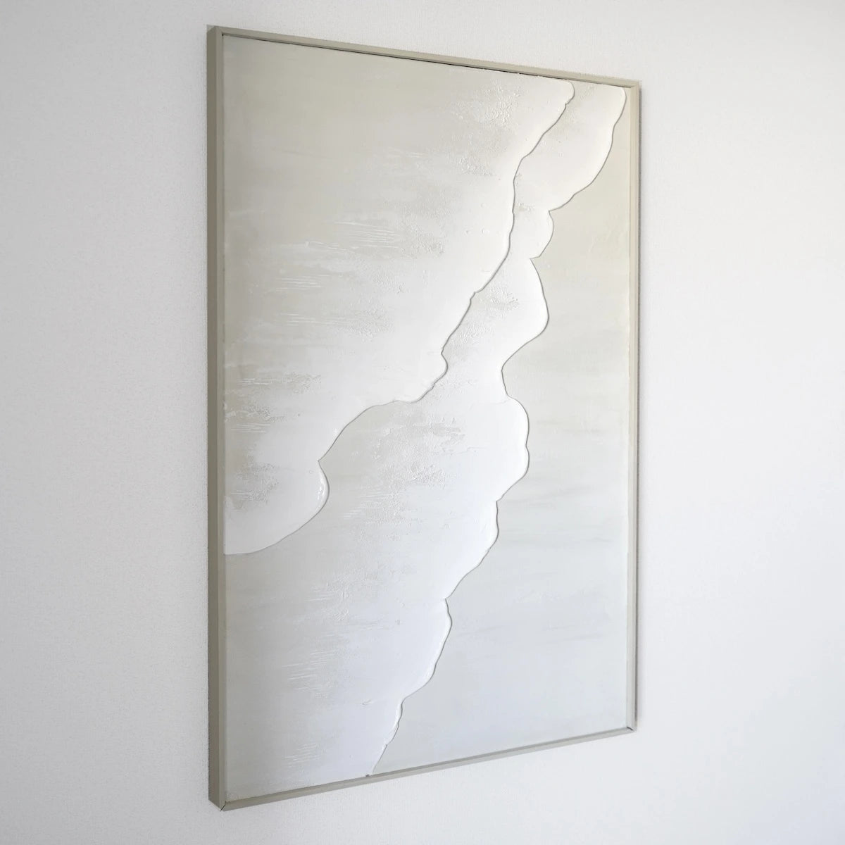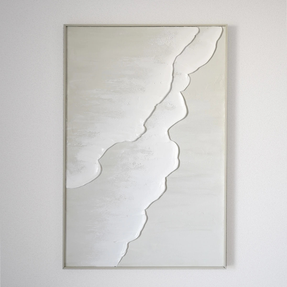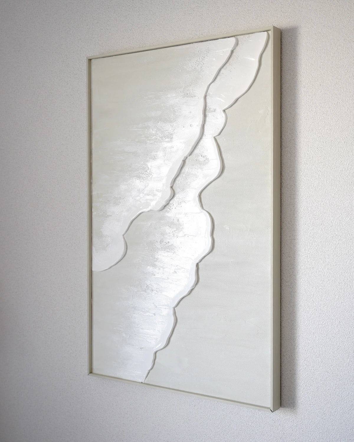 幾重にも重なるテクスチャーが、まるで砂浜に打ち寄せる波のような心地よいリズムを描き出しています。マットな質感と艶やかな光沢が織りなす立体感は、光の角度によって刻々とその表情を変え、見る人を深い安らぎへと誘うでしょう。壁にこの一枚を添えれば、空間に洗練された静寂が宿り、ホテルライクな上質さを日常にもたらします。ミニマルな寝室や、スタイリッシュな書斎のメインアートとして格別の存在感を放ちます。