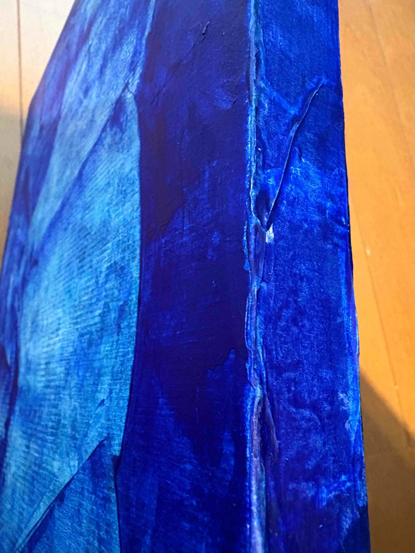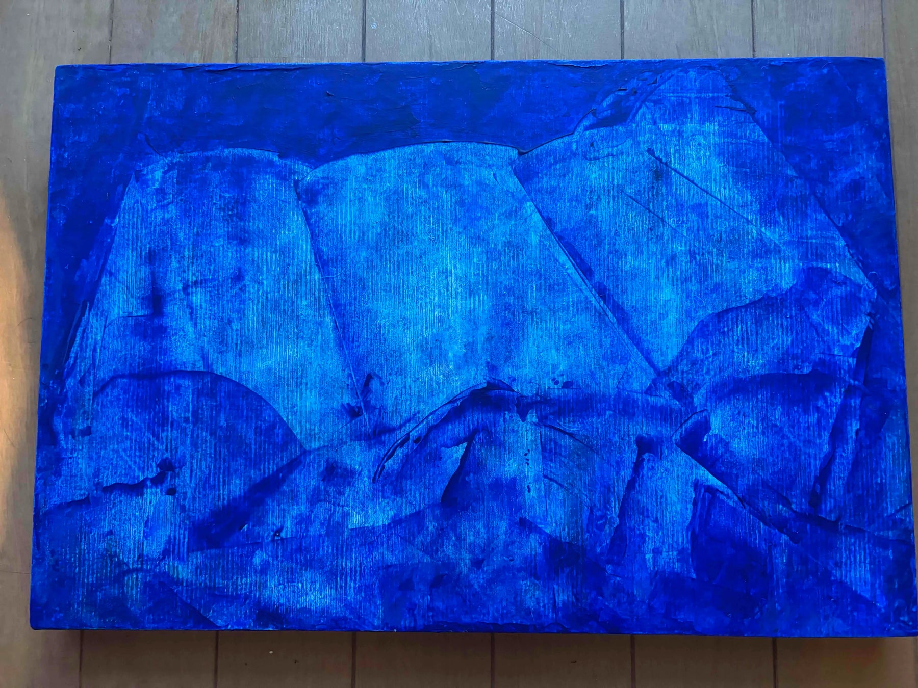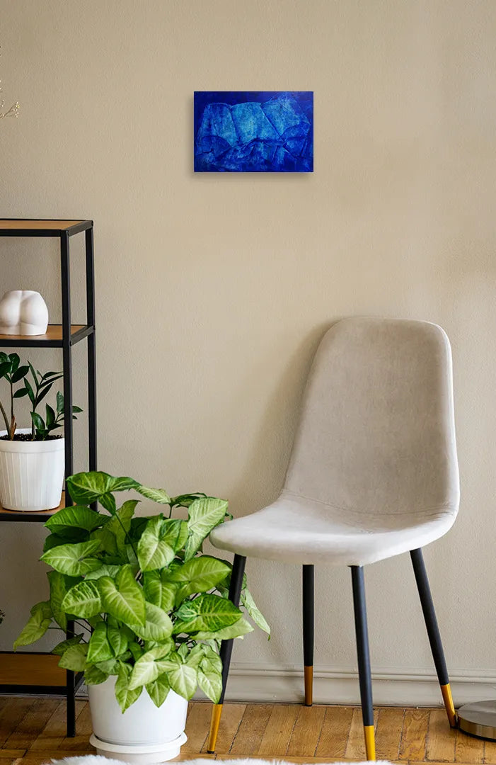 深い群青が重なりあい、まるで海の底を歩くような静けさと奥行きを感じさせます。ざらついた質感と微かな光の揺らぎが、見る人の内面に穏やかな波紋を広げます。壁に飾ることで、空間全体に落ち着きと静寂が宿り、思考が自然と深まるような時間が流れます。リネンやウッドの素材と合わせれば、書斎やベッドサイドにも心地よく調和します。