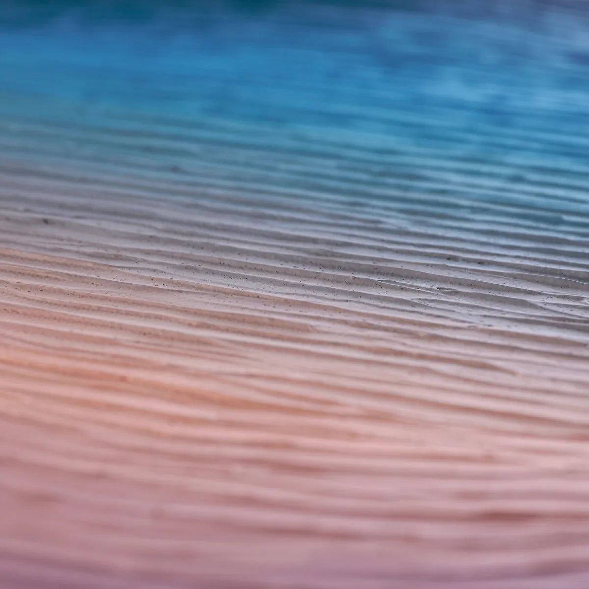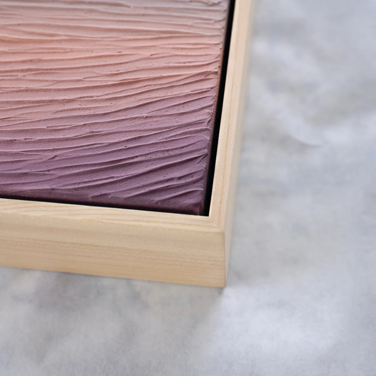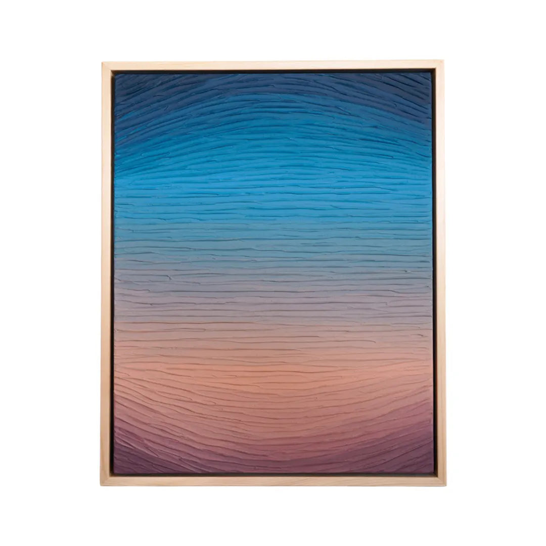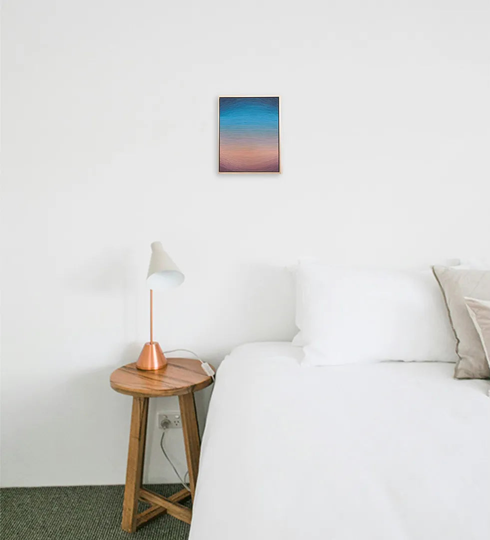 深い藍色から柔らかな茜色へと移ろう色彩が、波打つような独自のテクスチャと重なり、沈みゆく夕日の余韻を美しく描き出しています。地平線の彼方を眺めているような、穏やかで奥深い情景は、見る人の心に深い安らぎと内省の時間をもたらしてくれるでしょう。この一作を壁に添えるだけで、空間に静かな品格が加わり、日々の喧騒を忘れさせる上質な休息の場へと整えてくれます。寝室の枕元や書斎の壁面に、落ち着いた色調の木製家具と合わせるのが最適です。
