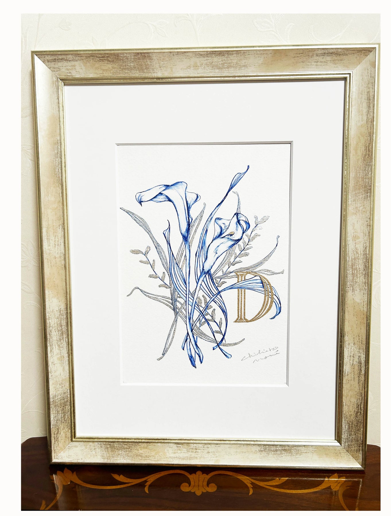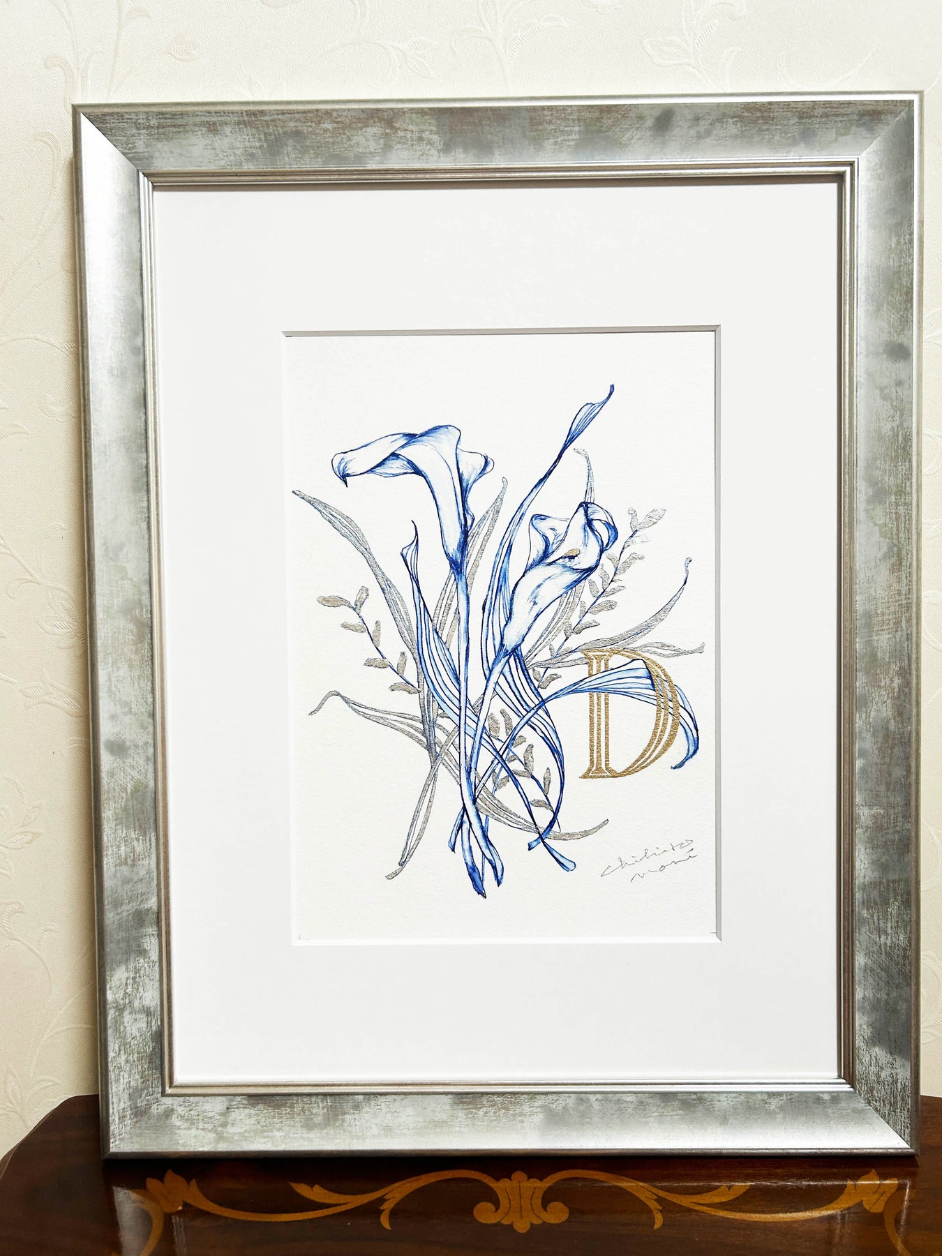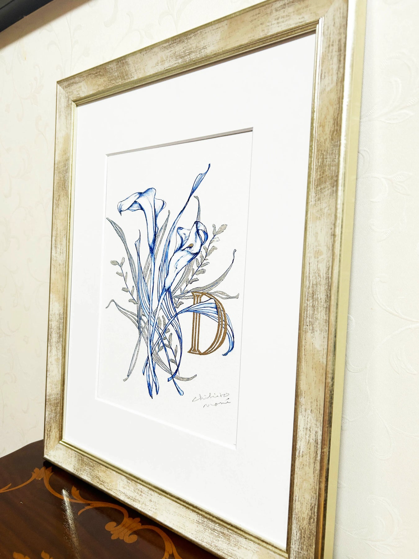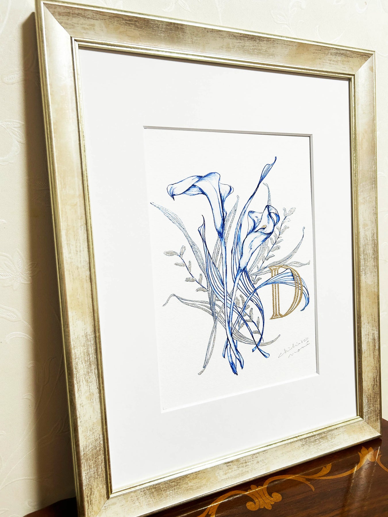 繊細な線で描かれたカラーリリーが、凛とした静けさの中でやわらかな気品を湛えています。青と金の響きが印象的に交わり、手紙のようにそっと心に語りかけてくる佇まいです。壁に飾ることで空間に洗練された静穏が加わり、穏やかな余韻をもたらします。クラシカルな家具やナチュラルな素材と美しく調和し、書斎や寝室にもすっと溶け込みます。