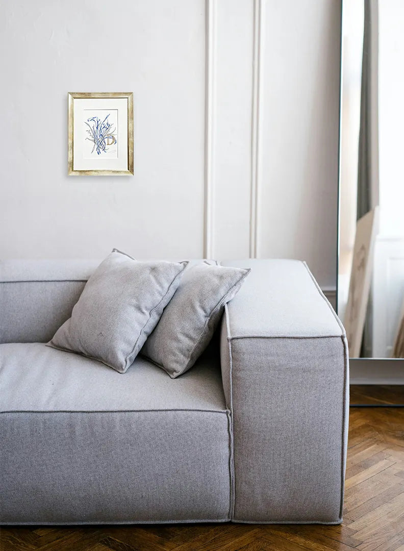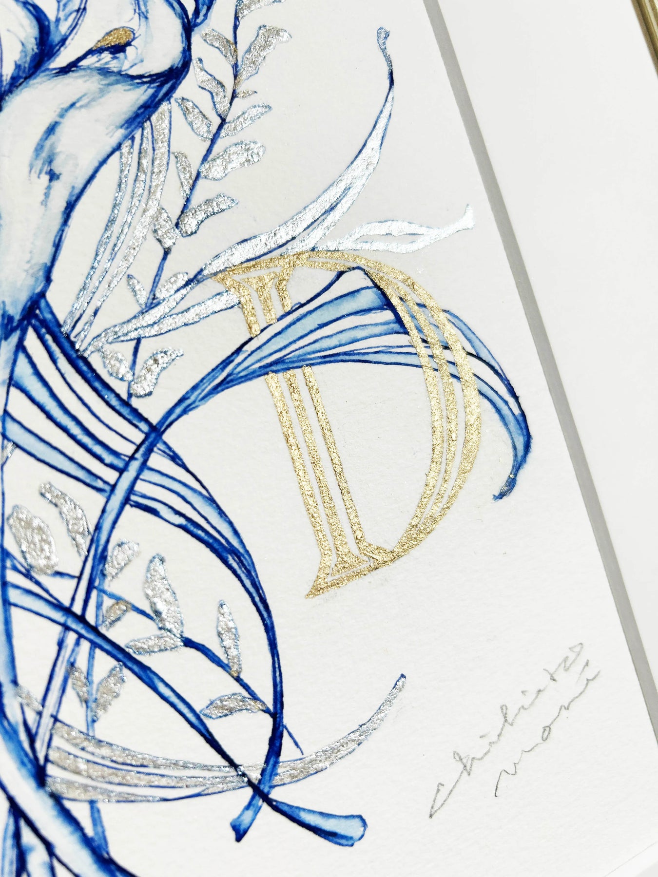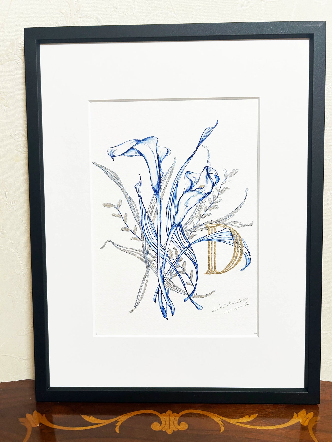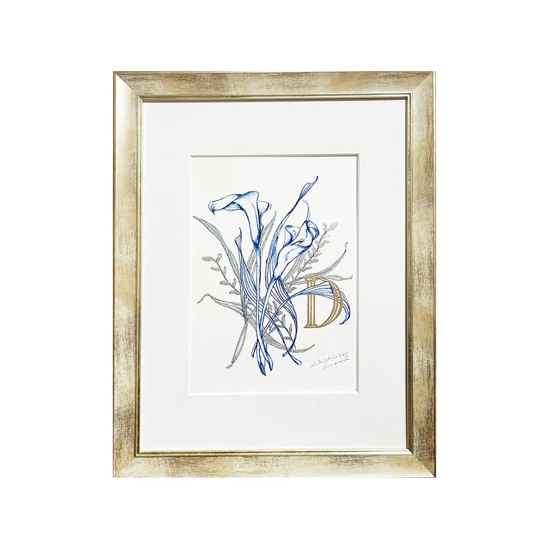 繊細な線で描かれたカラーリリーが、凛とした静けさの中でやわらかな気品を湛えています。青と金の響きが印象的に交わり、手紙のようにそっと心に語りかけてくる佇まいです。壁に飾ることで空間に洗練された静穏が加わり、穏やかな余韻をもたらします。クラシカルな家具やナチュラルな素材と美しく調和し、書斎や寝室にもすっと溶け込みます。