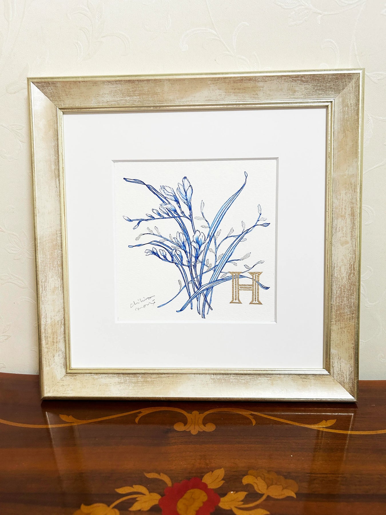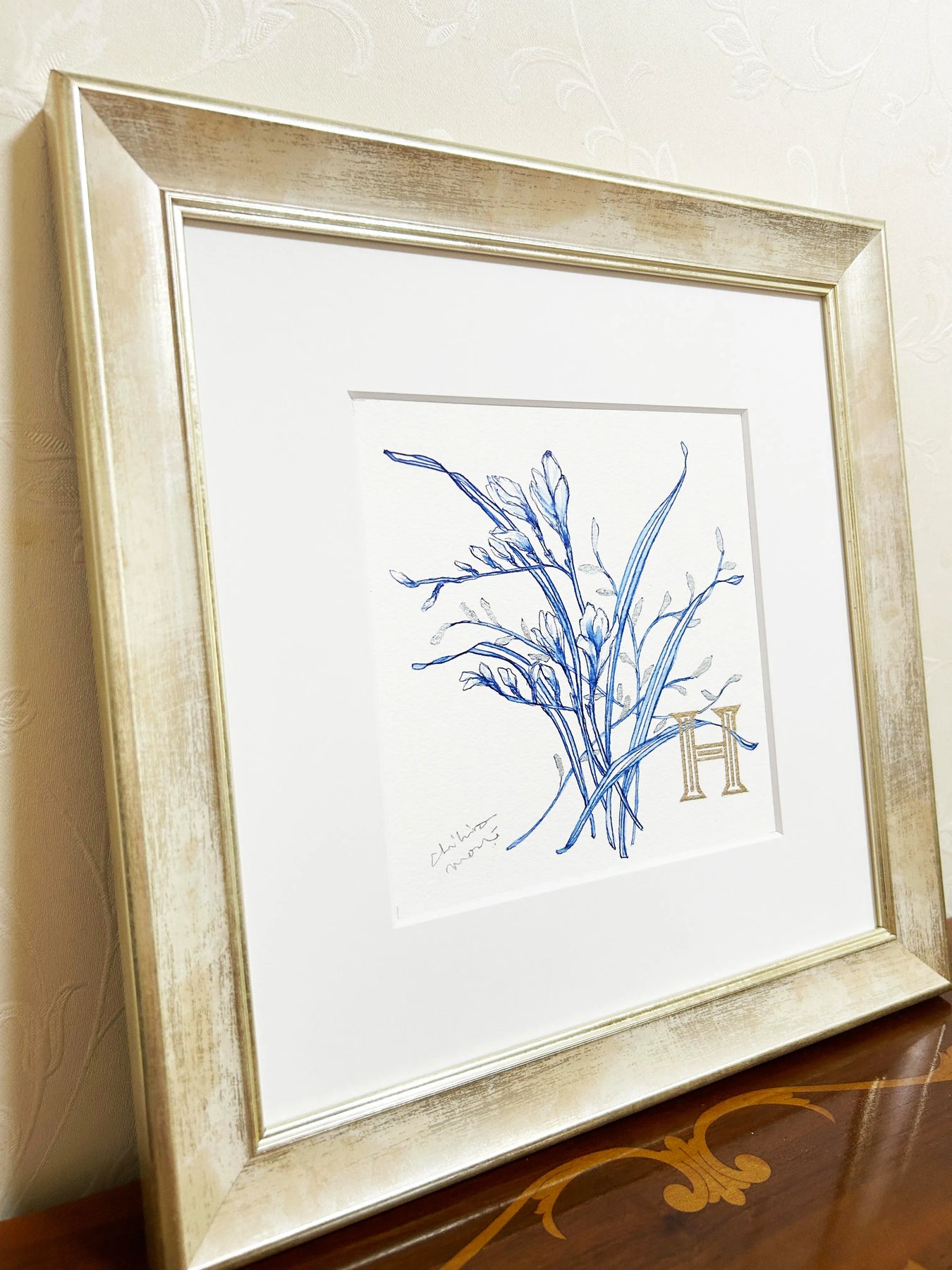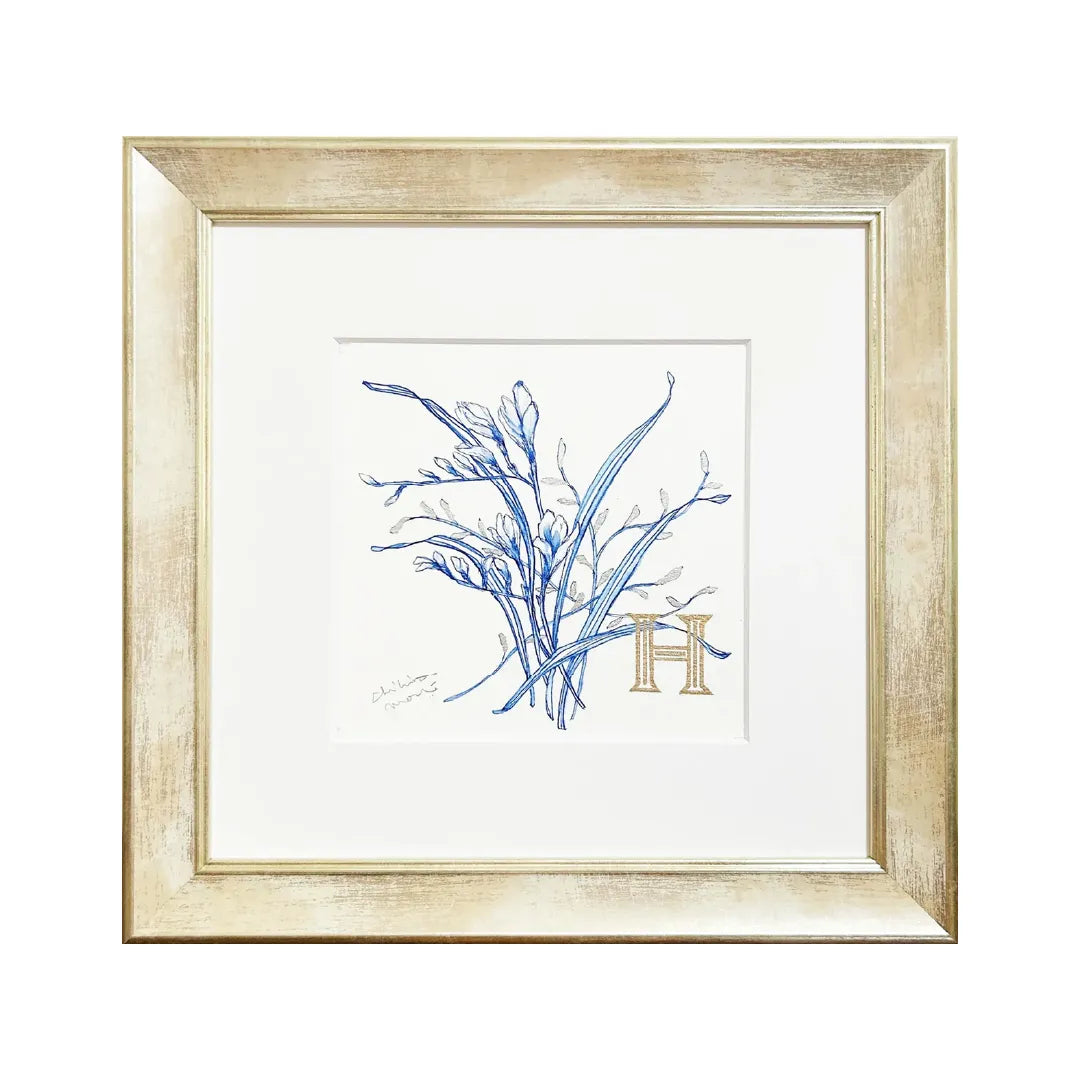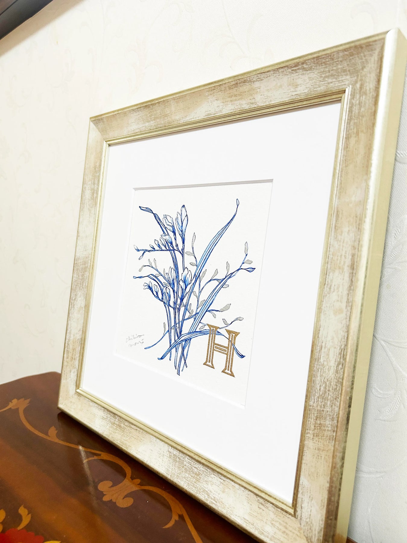 繊細な青の線で描かれた植物に、ゴールドの「H」が寄り添うエレガントな作品。ブルーの透明感と金色の輝きが美しいコントラストを生み出し、クラシカルで洗練された印象を与えます。シンプルでありながらも品格が漂い、どんな空間にも落ち着きと上質さをプラス。リビングや書斎に飾れば、インテリアを格上げするアクセントとなり、穏やかで洗練された空間を演出します。