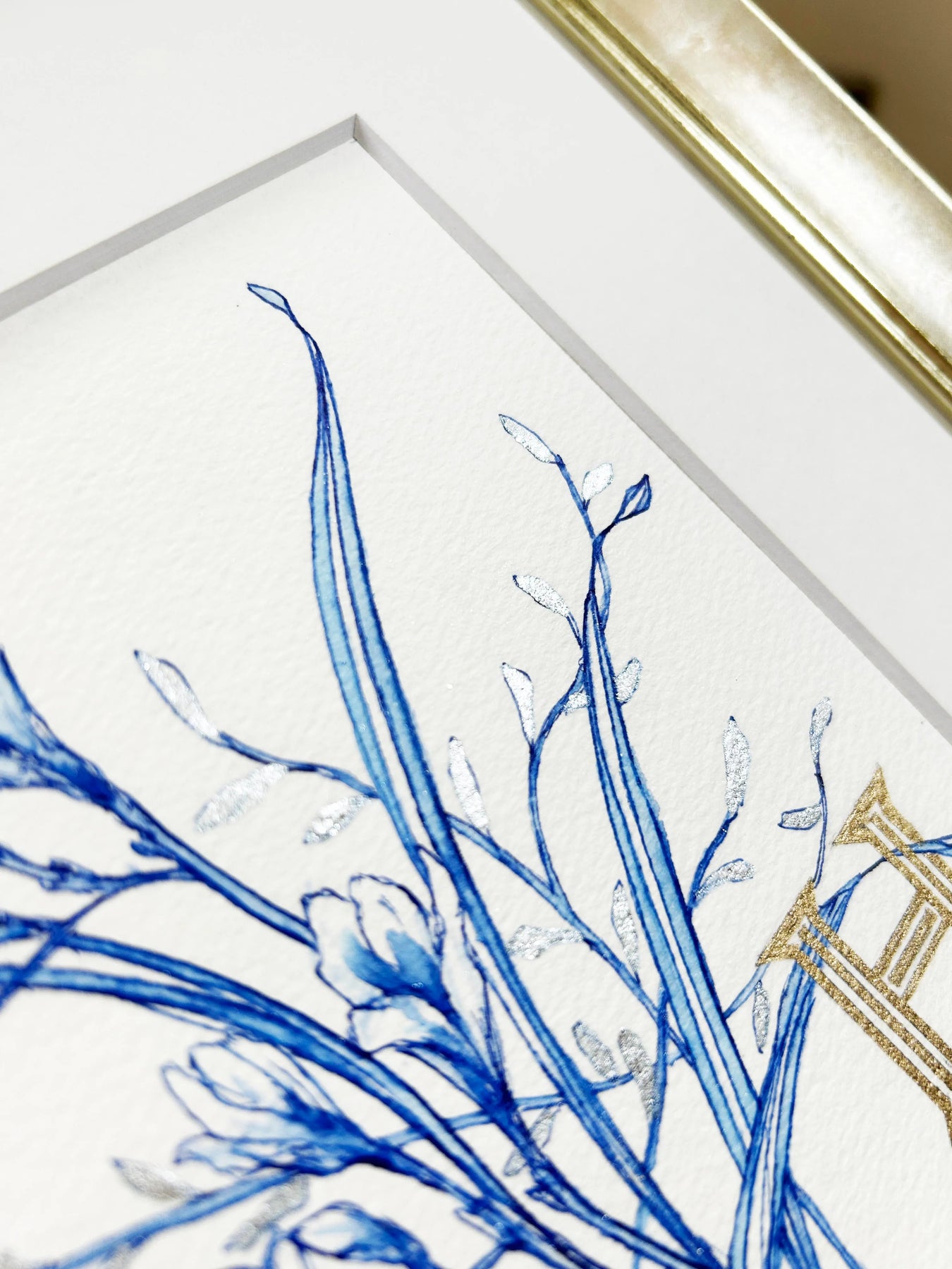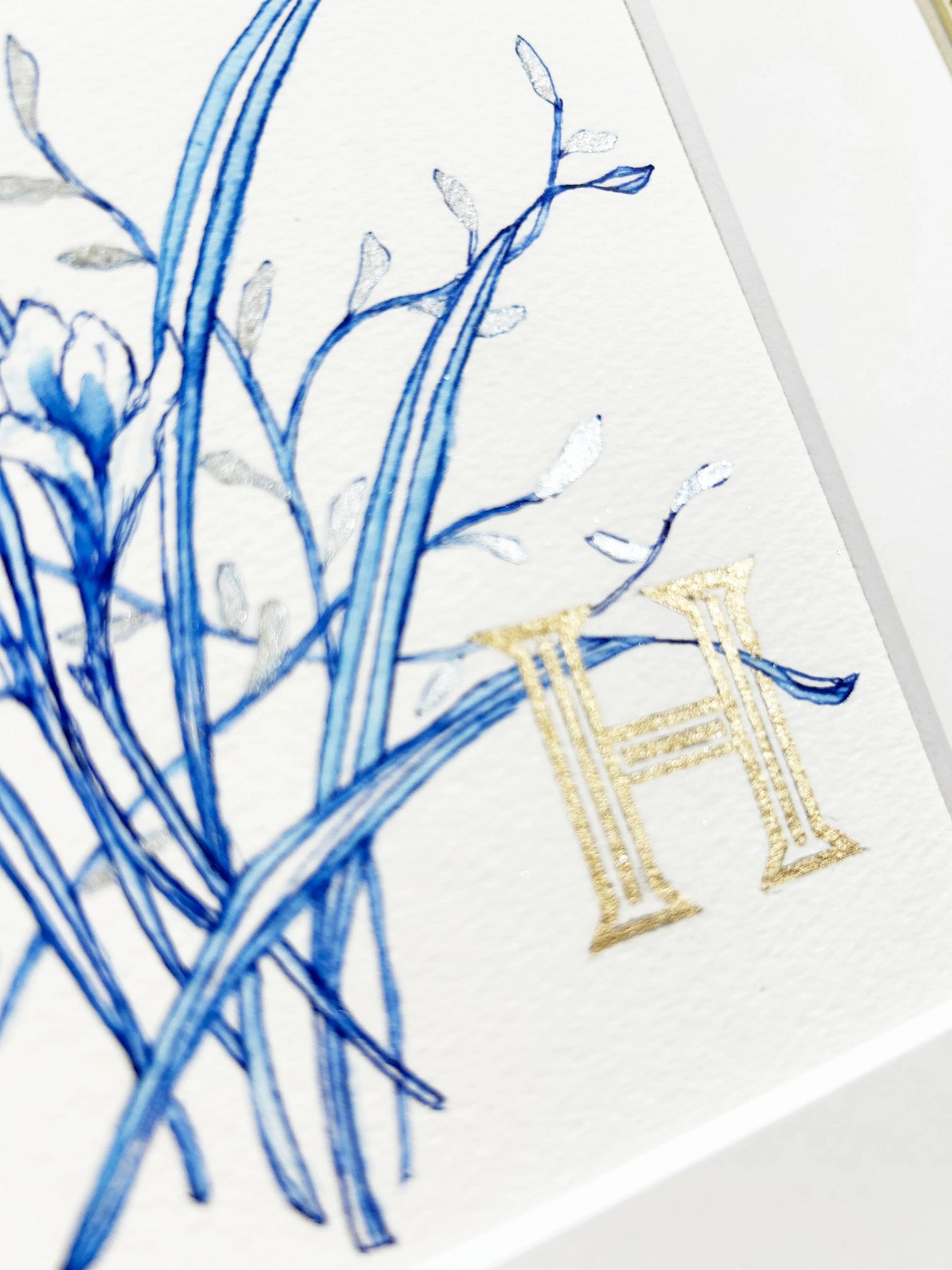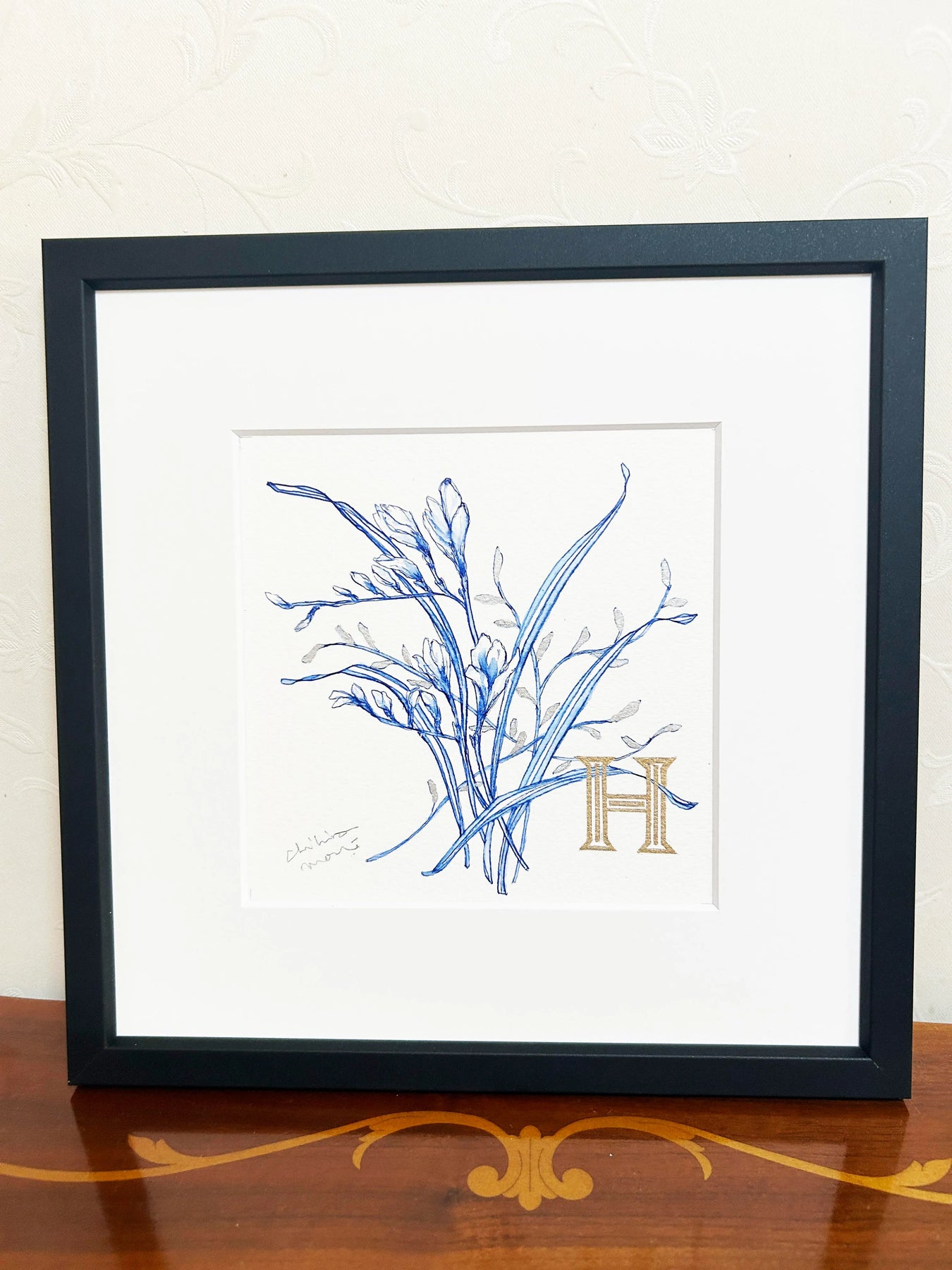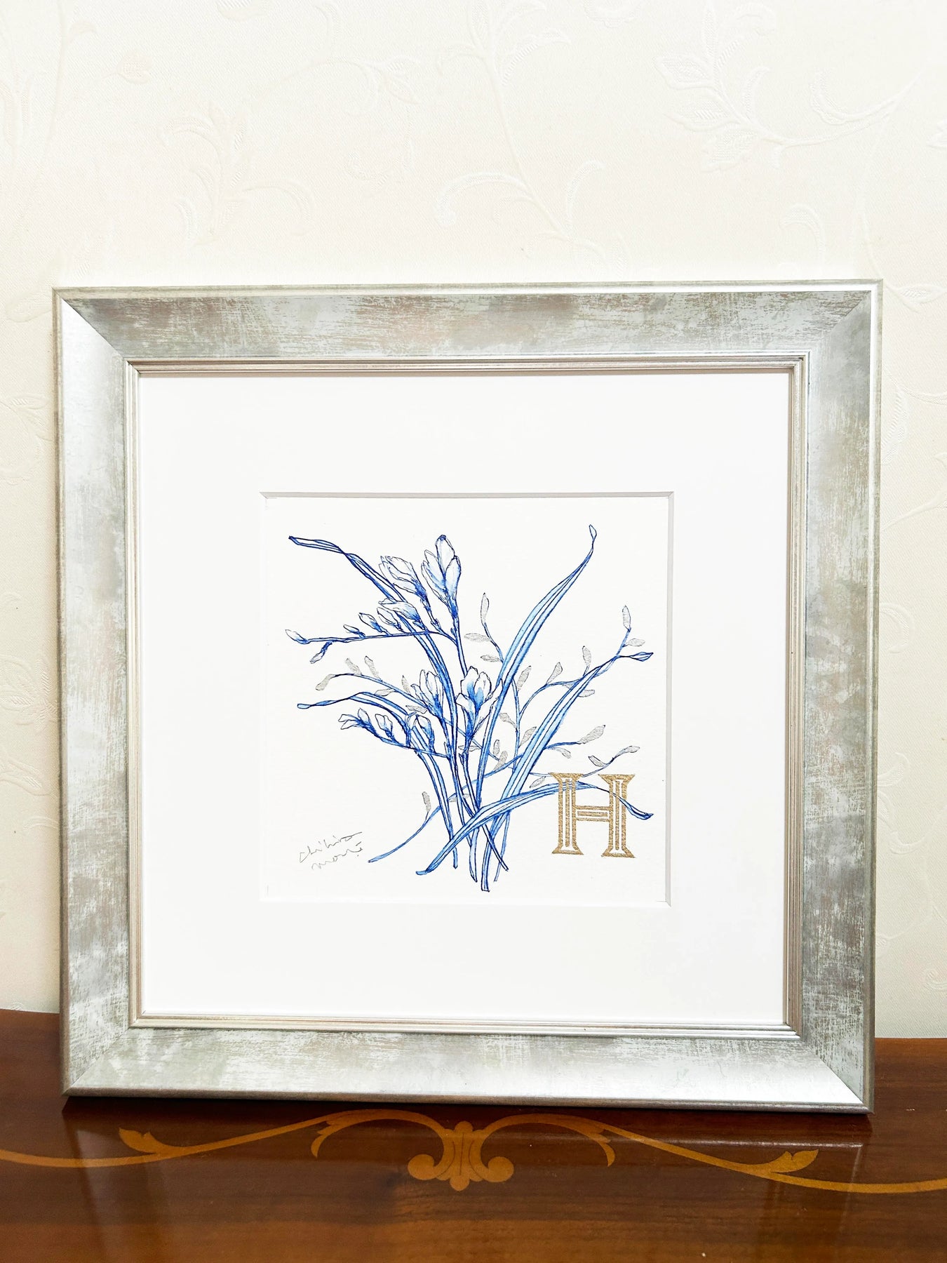 繊細な青の線で描かれた植物に、ゴールドの「H」が寄り添うエレガントな作品。ブルーの透明感と金色の輝きが美しいコントラストを生み出し、クラシカルで洗練された印象を与えます。シンプルでありながらも品格が漂い、どんな空間にも落ち着きと上質さをプラス。リビングや書斎に飾れば、インテリアを格上げするアクセントとなり、穏やかで洗練された空間を演出します。