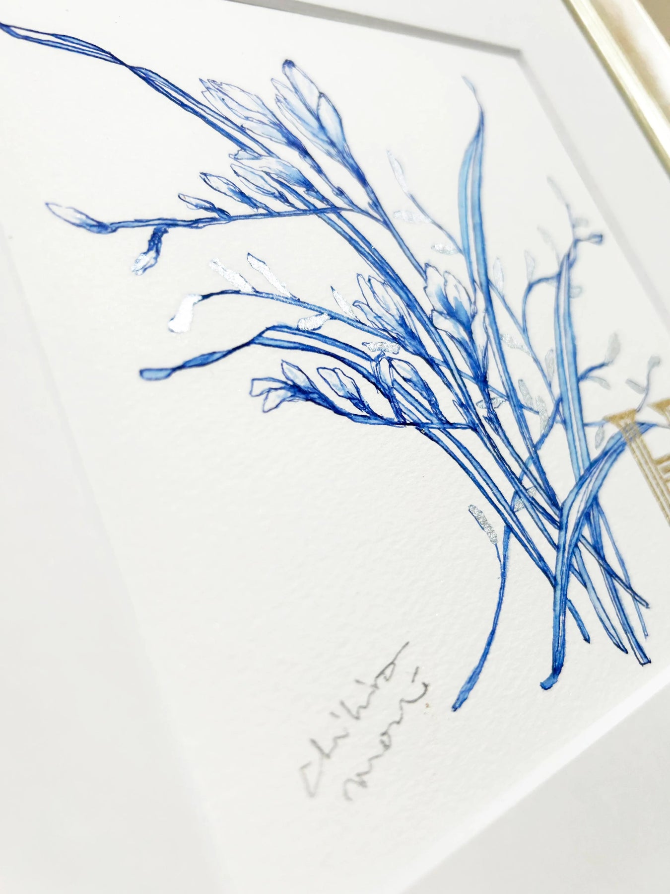 *こちらの作品は3タイプの額からお好きな額をお選びください。 *また、お好きな絵柄とお好きなアルファベット文字を入れることも可能です。 (御納品は発注から2週間後になります) FP‐Line はペンにインクを付け描いています。ペンから流れ落ちるインクの線は、時に軽やかに、時に偶発的にインクが滞留する線がとても魅力的です。 そんな線はどことなく私たちの日常にも似ています。軽やかに過ごせる日、時として立ち止る日、そんな日々の積み重ねがそれぞれの人生となり、軌跡となってゆく。 そんな線で描いた「フリージア」。フリージアの花言葉「幸福Happiness」の頭文字「H」を入れました。この作品が皆様の心にそっと寄り添い、作品を目にする度、心が軽やかになり、「幸福Happiness」を感じていただければ幸いに存じます。 細かく入れた金箔、銀箔の光沢感も楽しんでいただければ幸いです。