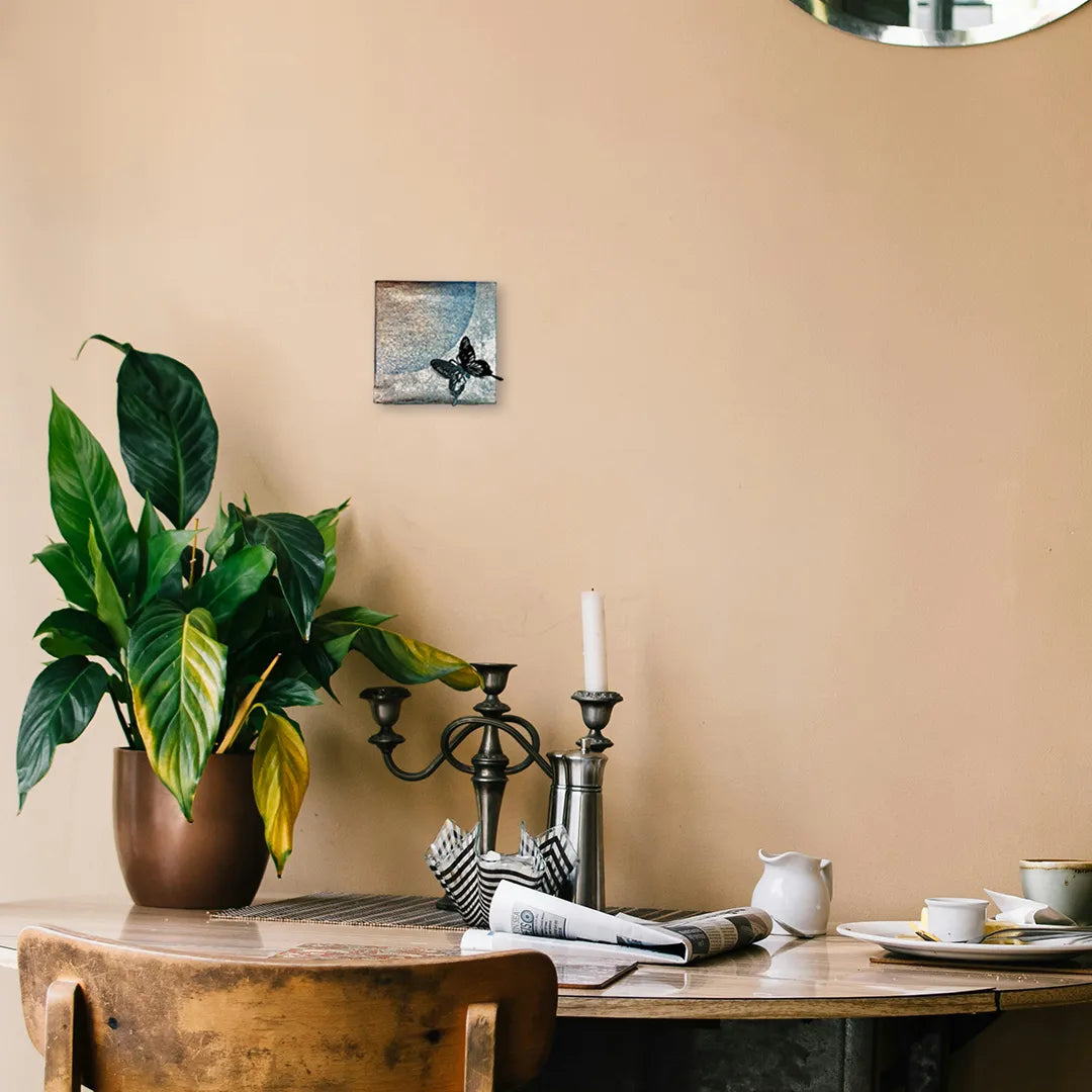 金属の光が揺らぐ地に黒い蝶がふわりと舞い、淡い空気をそっと震わせるような静かな気配が漂います。壁に迎え入れるだけで室内の表情がやわらかくほどけ、視線の流れに穏やかな広がりが生まれます。落ち着いた色調の書斎や夜のひとときを整えるベッドサイドにも自然に馴染み、空間へ澄んだ余韻を添えてくれます。