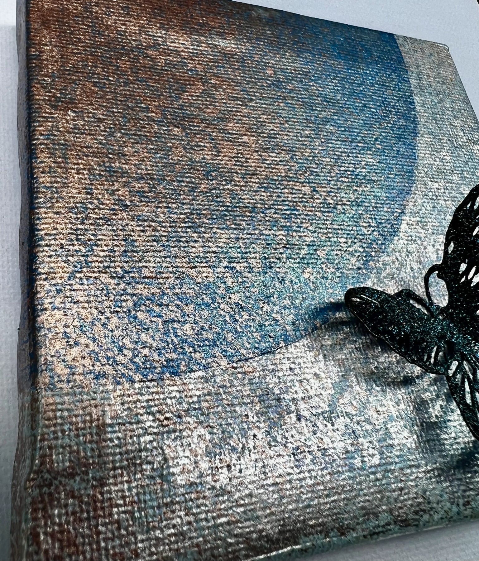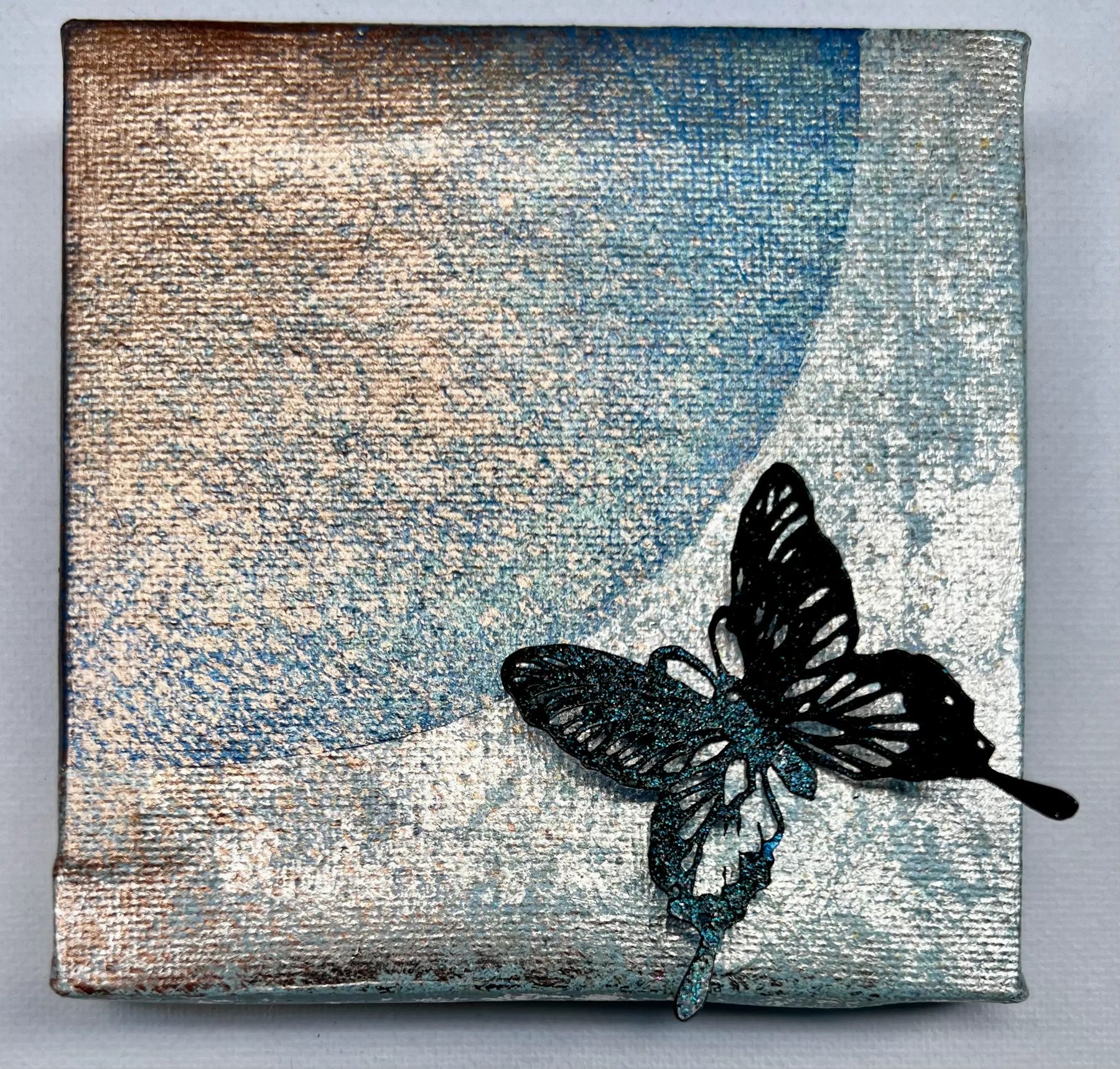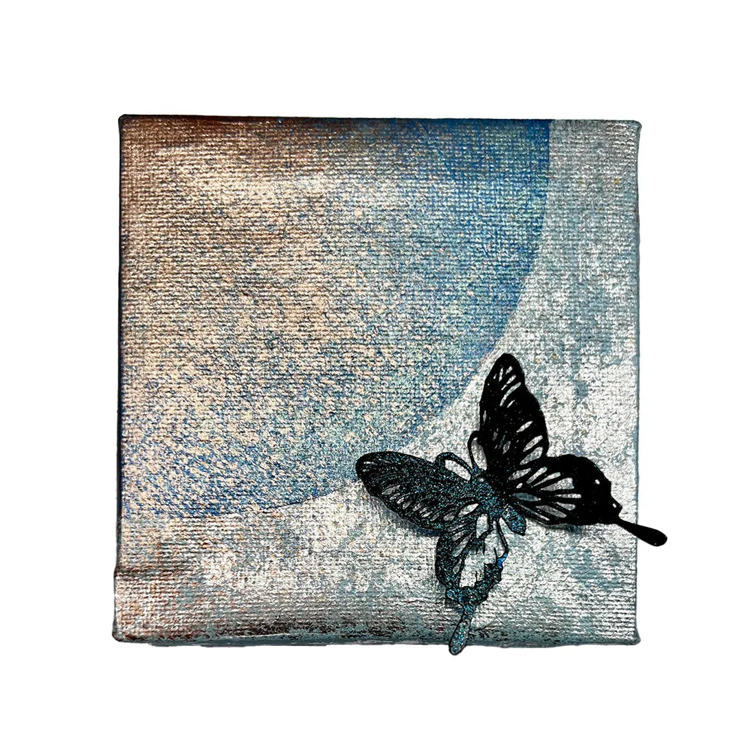 経年劣化風の味わいの背景に蝶が舞う。 独自のやり方で浮き出るひびや掠れ等を生かして侘び寂びの美しさを表現したミニアート。 蝶は、さまざまな宗教の中で、輪廻天性や再生等を象徴するものとして存在することが多く、人の心も何度も何度も再生をくり返いしているんだという思いを蝶の作品にのせています。