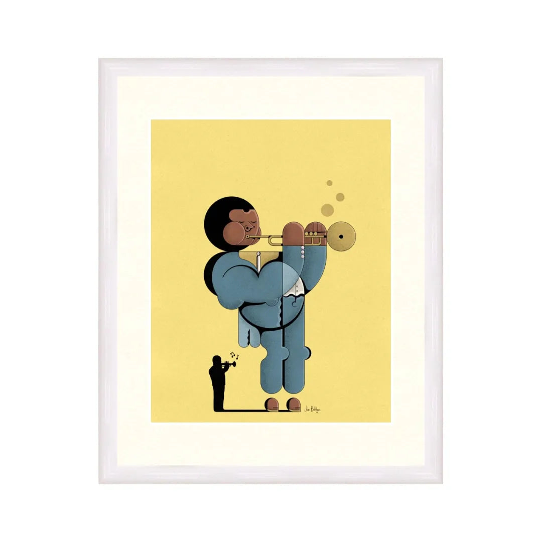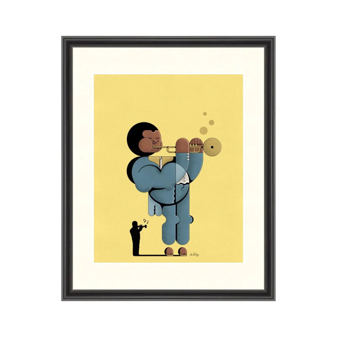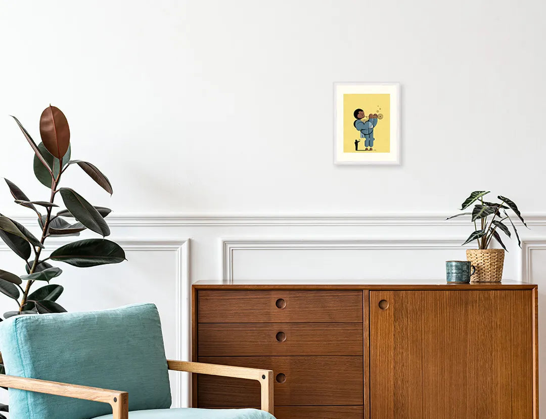 柔らかな山吹色の背景に、幾何学的な曲線で描かれたトランペット奏者が、心地よい音色を奏でているようです。デフォルメされたシルエットと、落ち着いたブルーの衣装が絶妙な調和を見せ、空間に大人の遊び心と小粋な情緒を運んでくれるでしょう。この一枚を飾ることで、お部屋がジャズクラブのような洒脱な雰囲気に包まれ、日常に豊かな活力を与えてくれます。書斎や趣味の空間に、ヴィンテージな革椅子と合わせて設えるのが最適です。