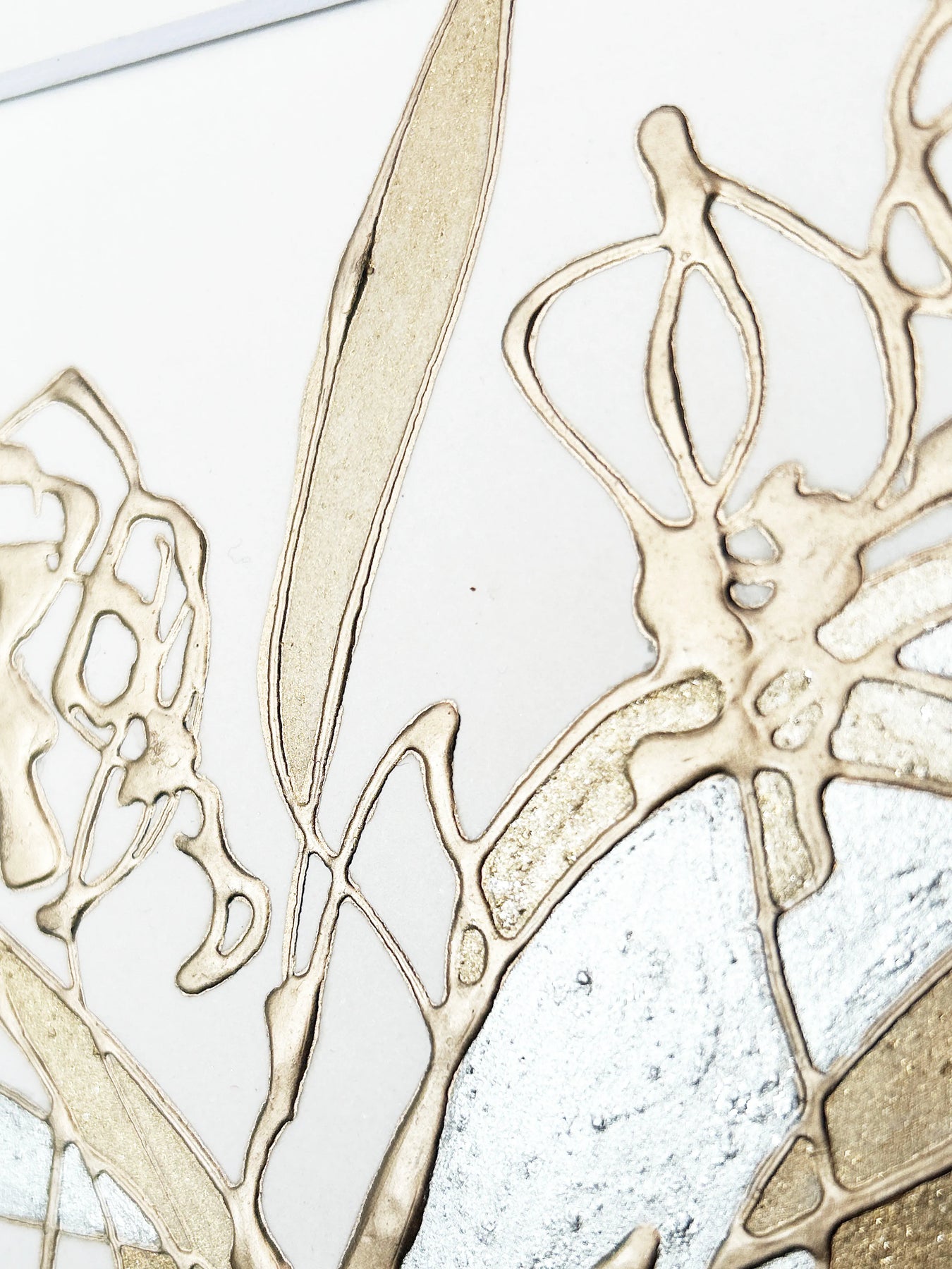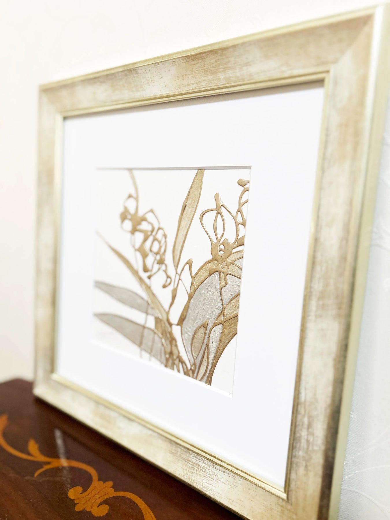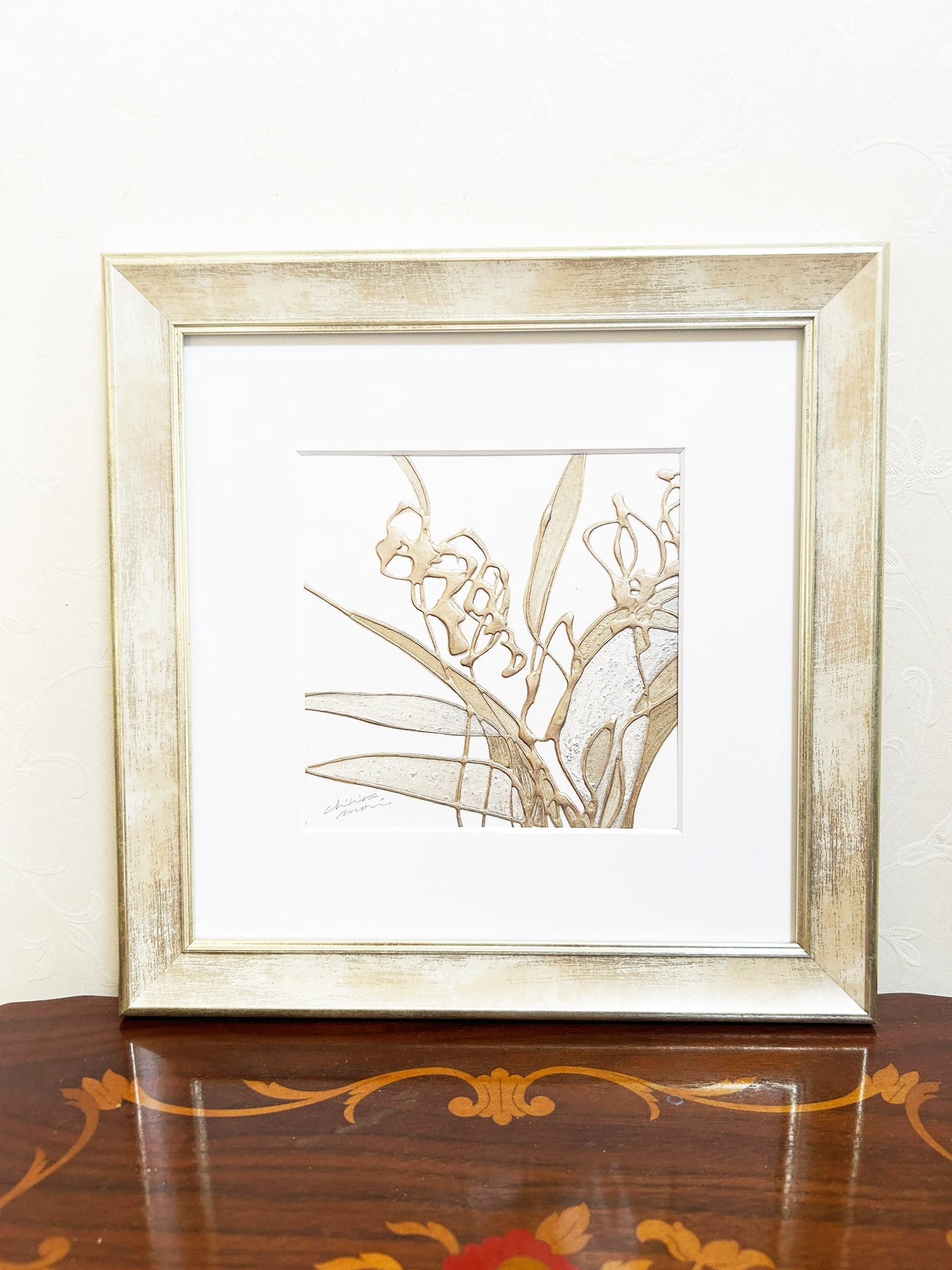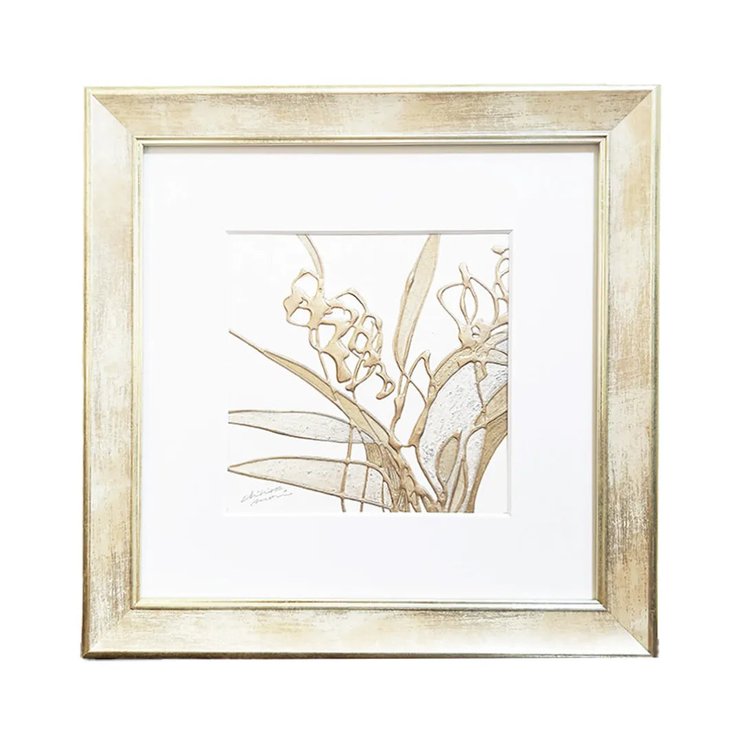 無垢な白の上に、シャンパンゴールドの優美な線が、紫蘭の清廉な佇まいをモダンに描き出しています。立体的なテクスチャーが生む繊細な光の陰影は、見る角度で表情を変え、暮らしの中に清々しい風が吹き抜けるような心地よさを届けてくれるでしょう。この作品を壁面に添えることで、空間全体に気品ある華やぎが広がり、洗練された大人の安らぎを演出します。コンソールの上や玄関に、モダンな洋家具と設えるのが最適です。