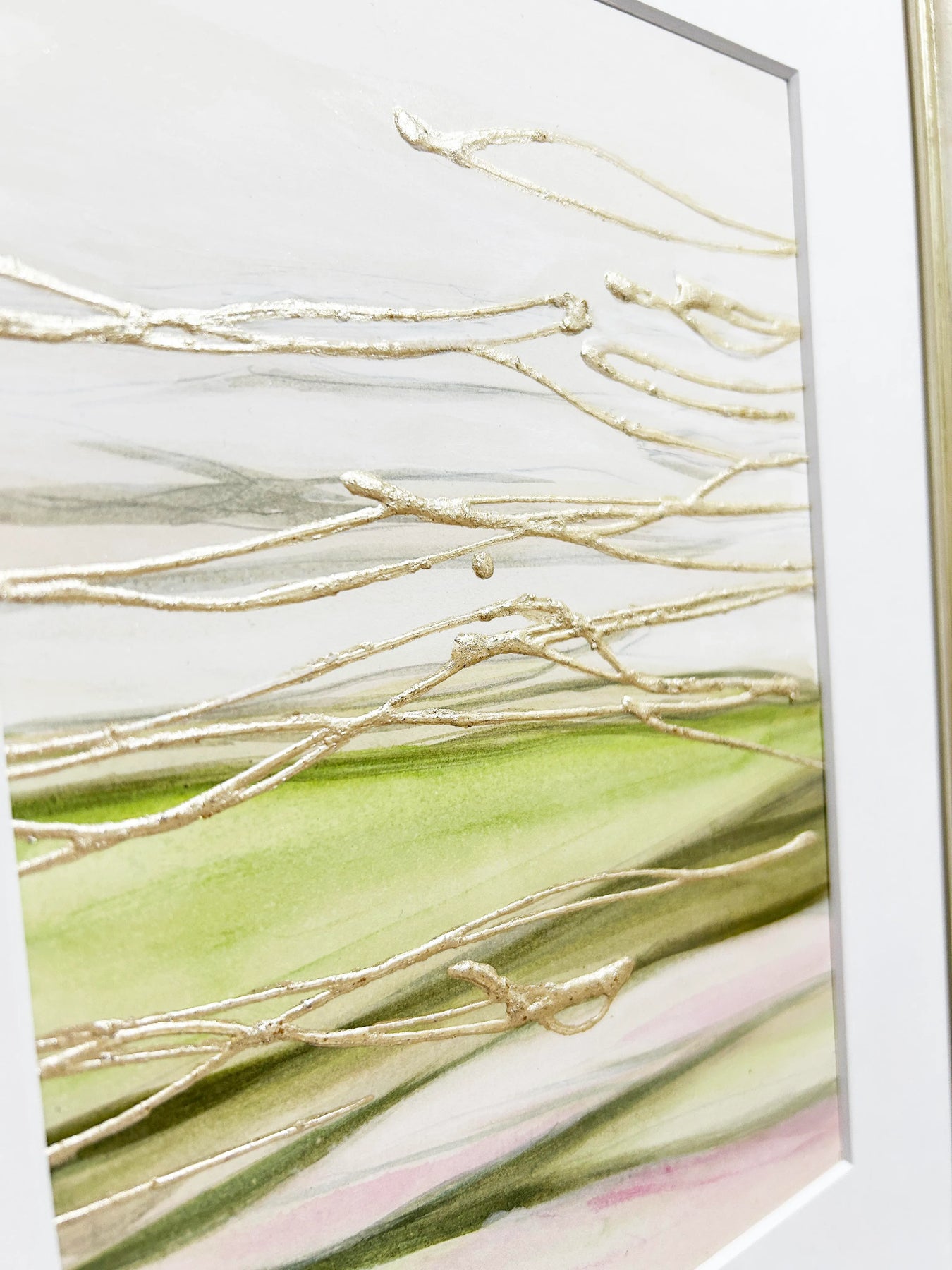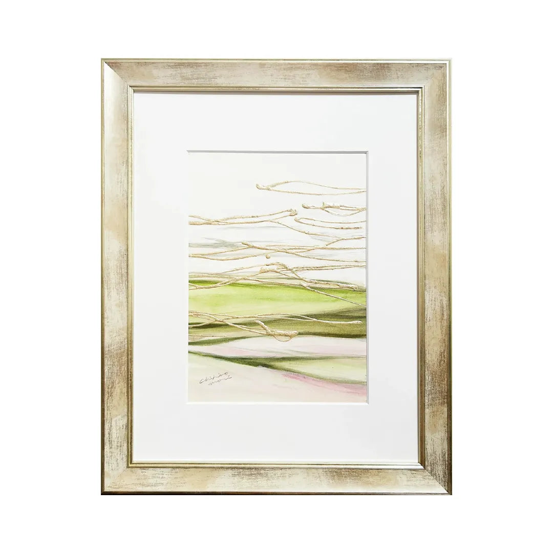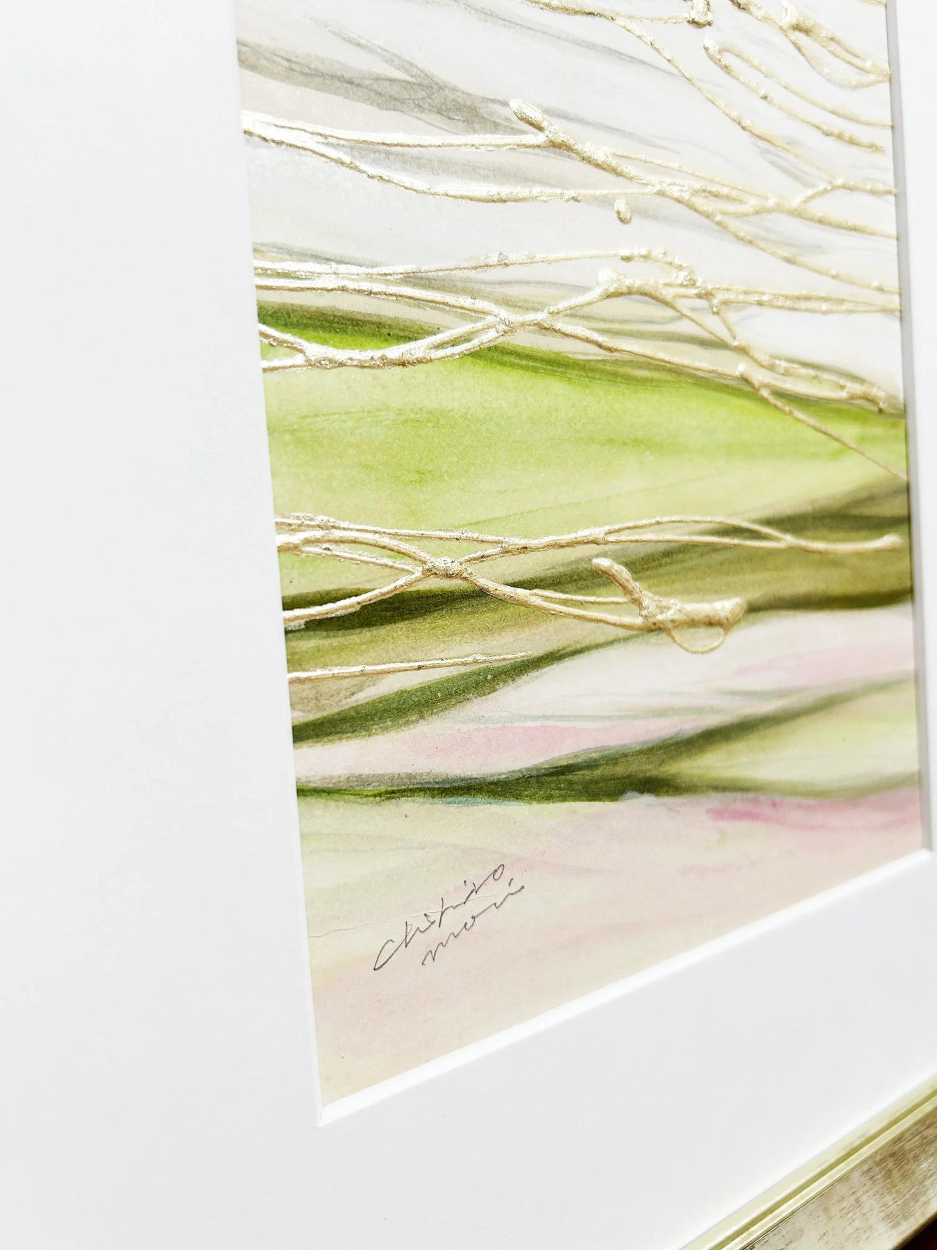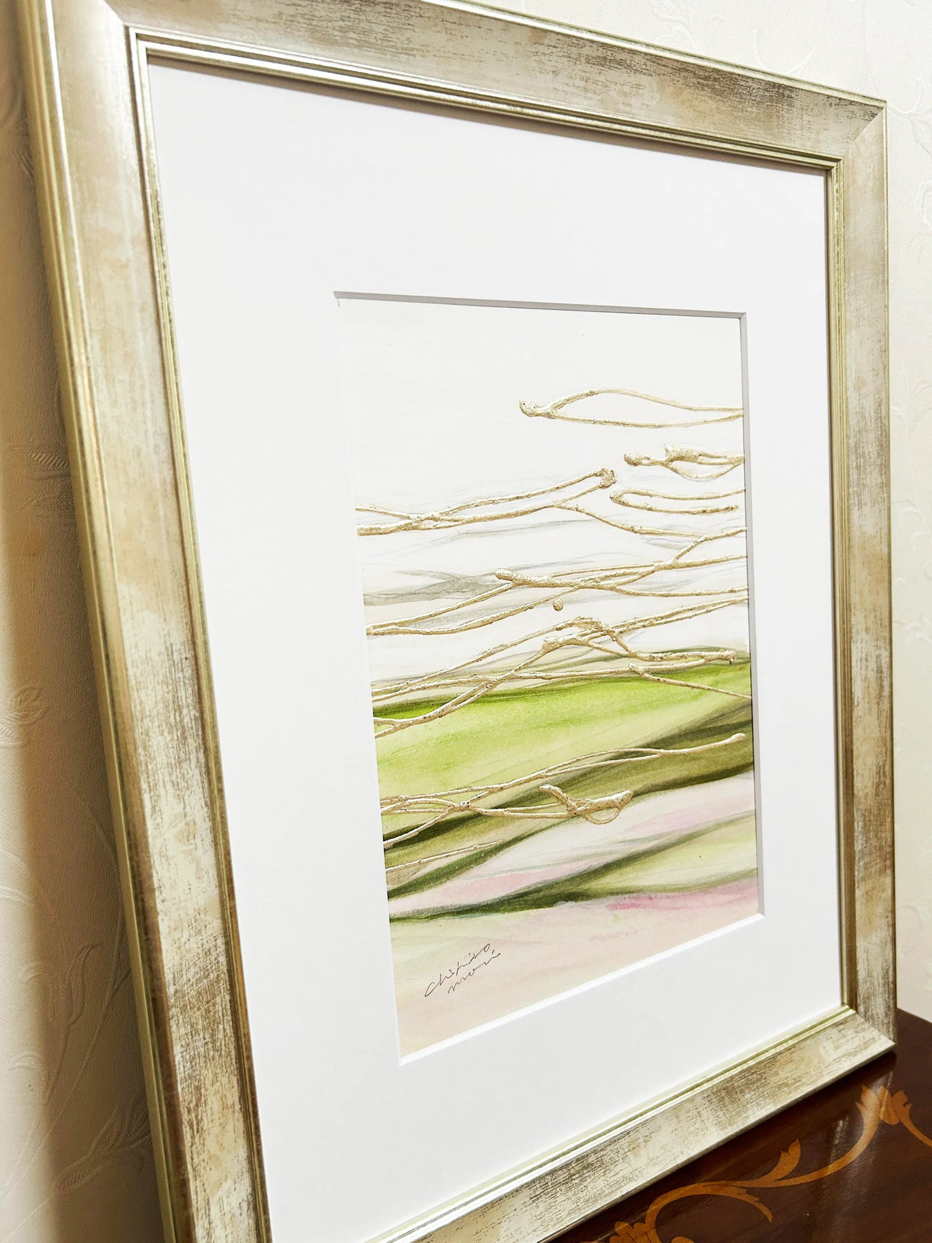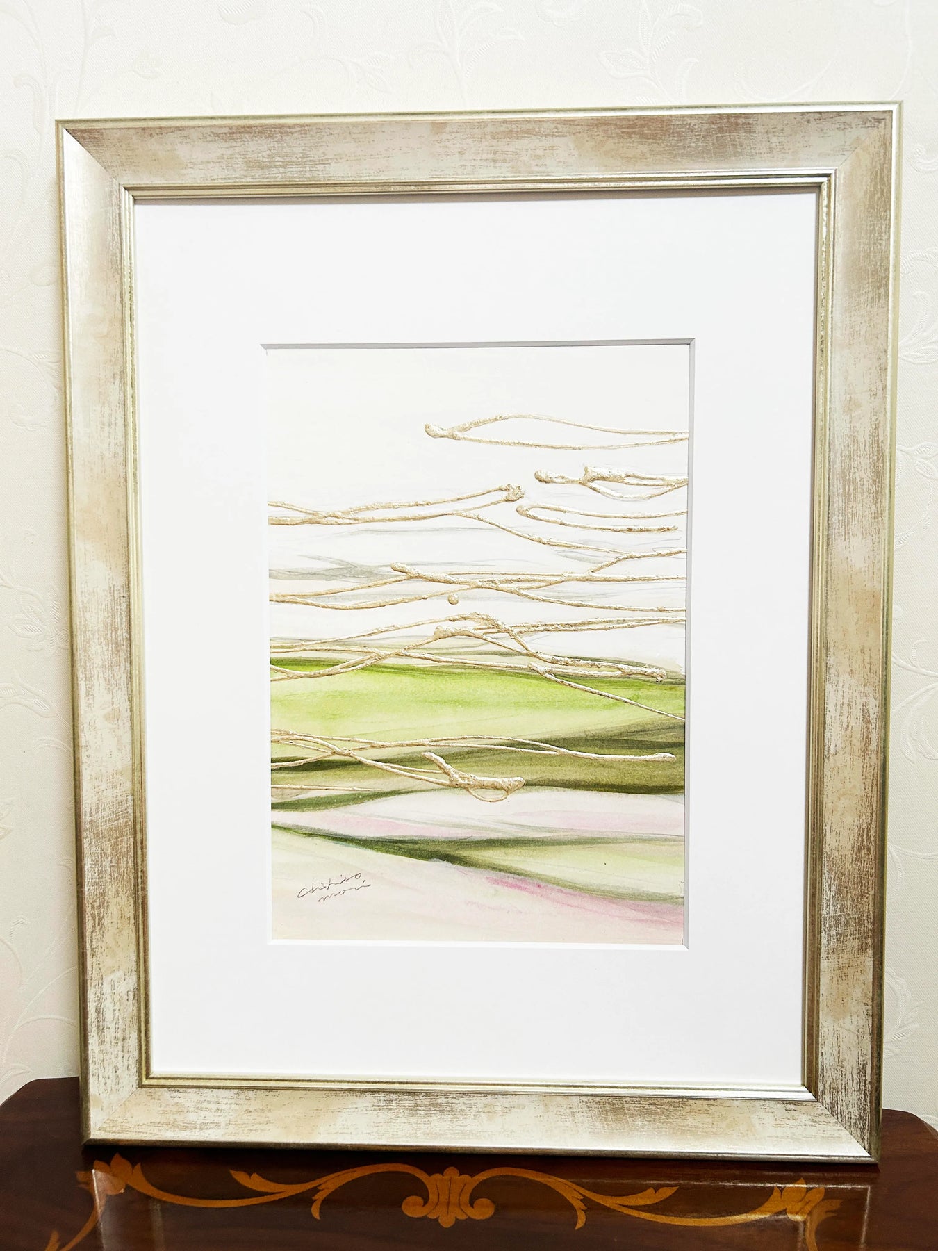 柔らかなグリーンのグラデーションとホワイトの余白が溶け合い、穏やかな自然の風景を思わせる一枚。そこに立体的に施された金のラインが、光を受けてきらめき、風や水の流れを描くように広がります。静かな空気の中にきらめく瞬間を切り取ったかのような上品な表現は、眺める人の心をやさしく整えてくれるでしょう。リビングや寝室に飾ることで、落ち着きと洗練を感じさせる空間を演出します。