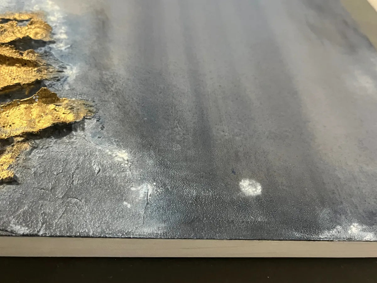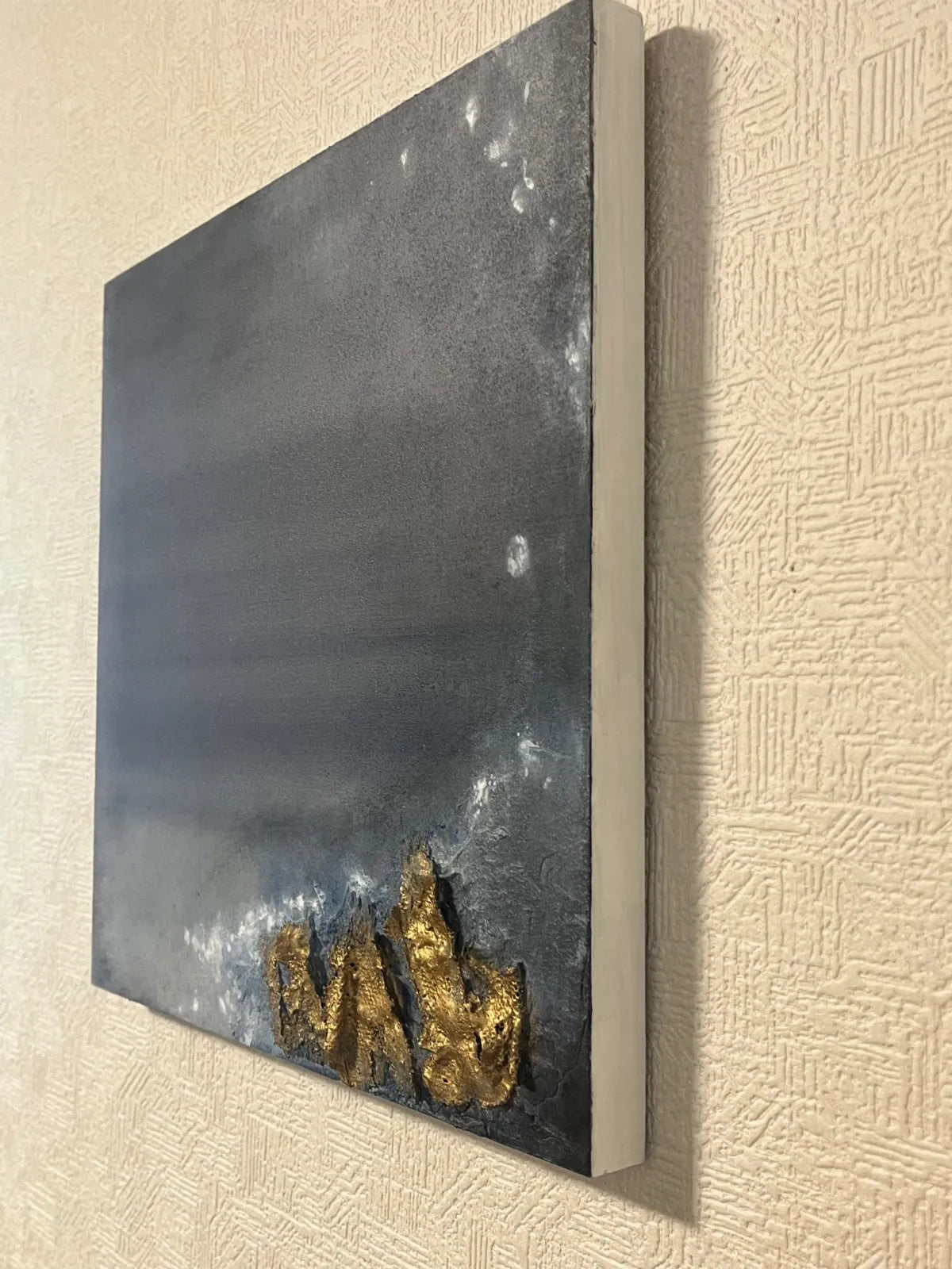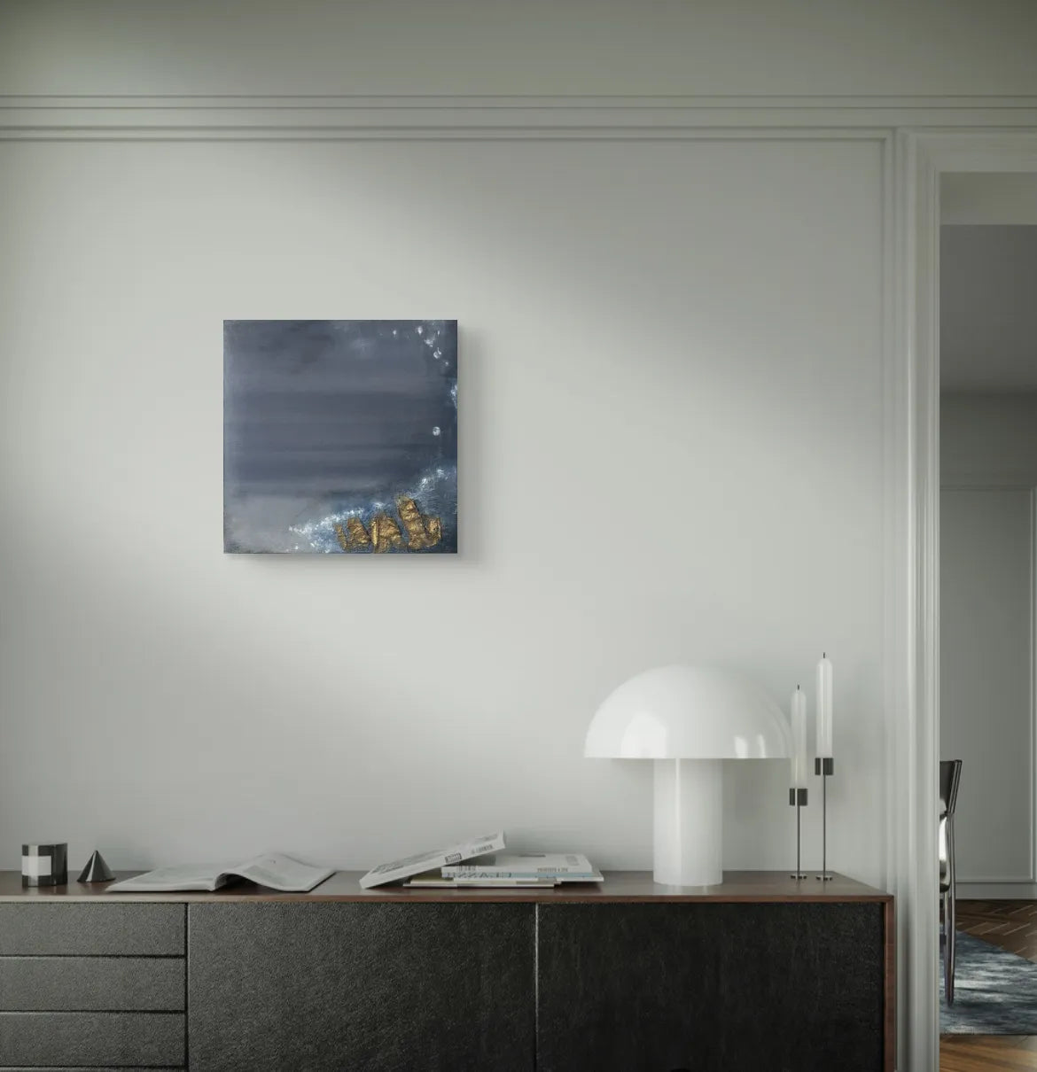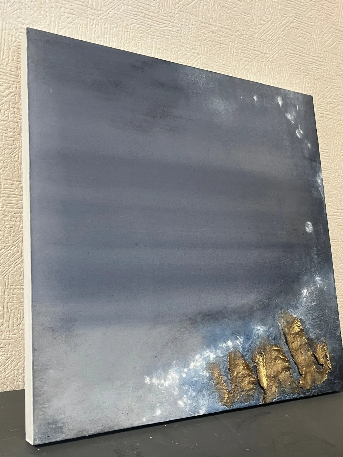深い夜空のようなネイビーのグラデーションが、心に穏やかな静寂をもたらす抽象画です。画面下部でほのかに光るゴールドの立体的な質感が、まるで暗闇に灯る希望や、月光に照らされた波しぶきのような幻想的な美しさを放ちます。落ち着いたトーンでありながら、ざらりとしたマチエールが空間に心地よい緊張感と奥行きを与えます。寝室や書斎に飾れば、深呼吸したくなるような安らぎに包まれるでしょう。モダンや和モダンのインテリアと相性が良く、日常に上質な静けさを運びます。