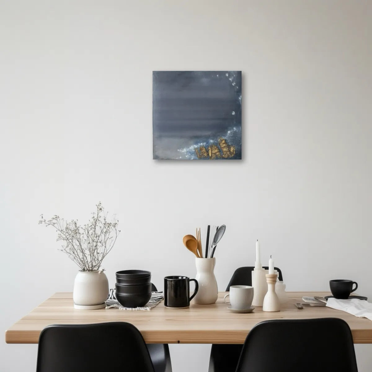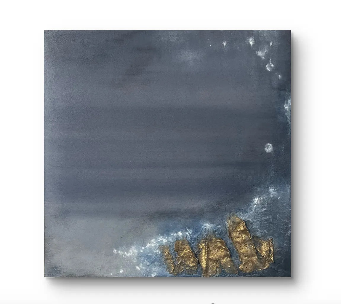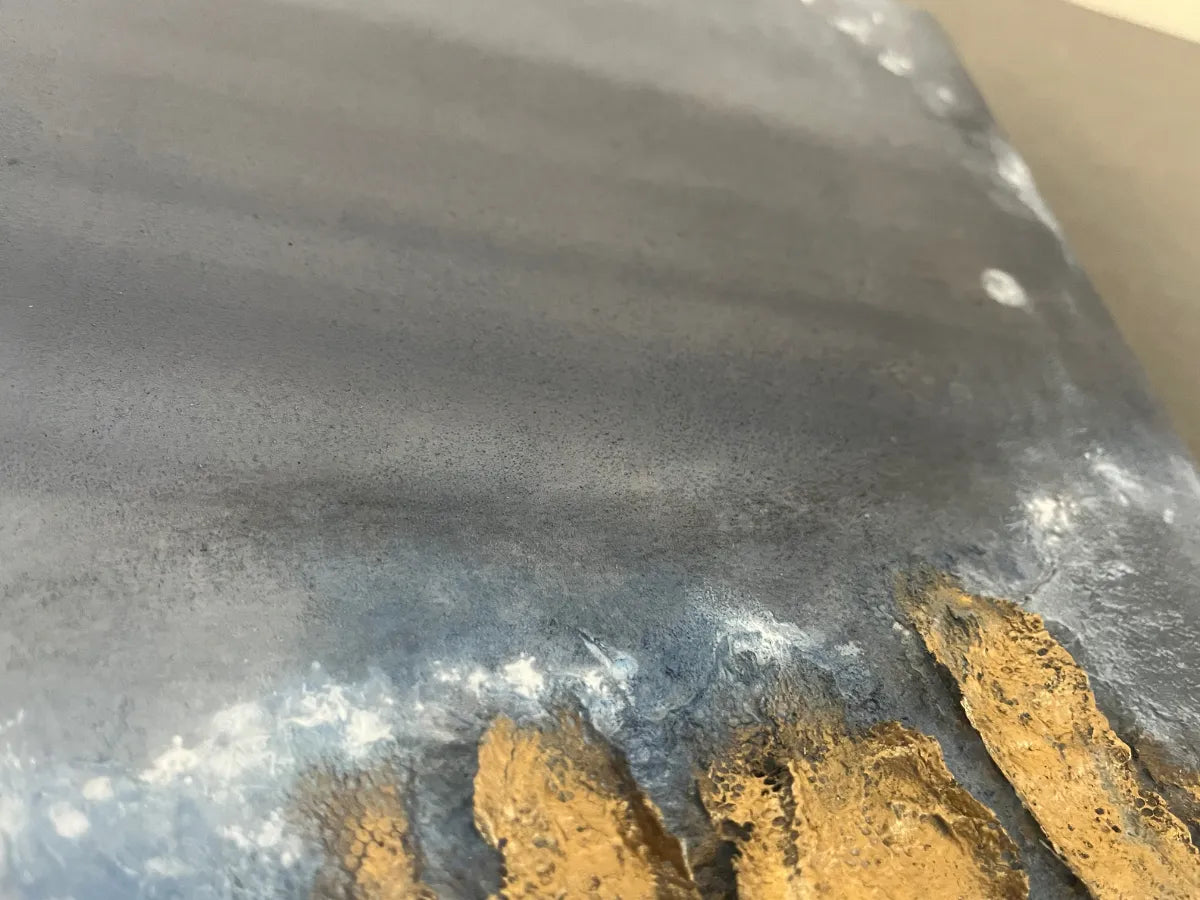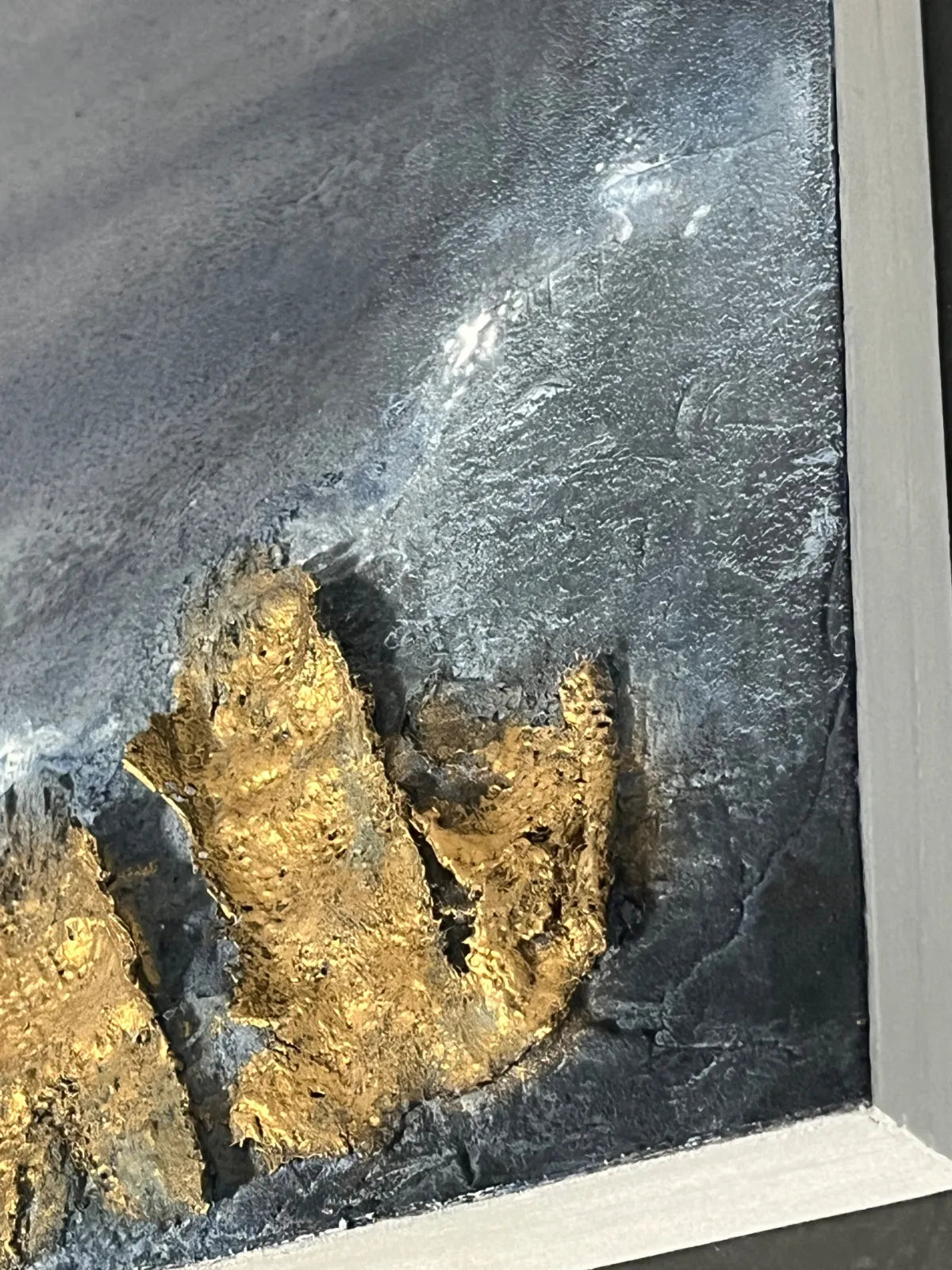 深い夜空のようなネイビーのグラデーションが、心に穏やかな静寂をもたらす抽象画です。画面下部でほのかに光るゴールドの立体的な質感が、まるで暗闇に灯る希望や、月光に照らされた波しぶきのような幻想的な美しさを放ちます。落ち着いたトーンでありながら、ざらりとしたマチエールが空間に心地よい緊張感と奥行きを与えます。寝室や書斎に飾れば、深呼吸したくなるような安らぎに包まれるでしょう。モダンや和モダンのインテリアと相性が良く、日常に上質な静けさを運びます。