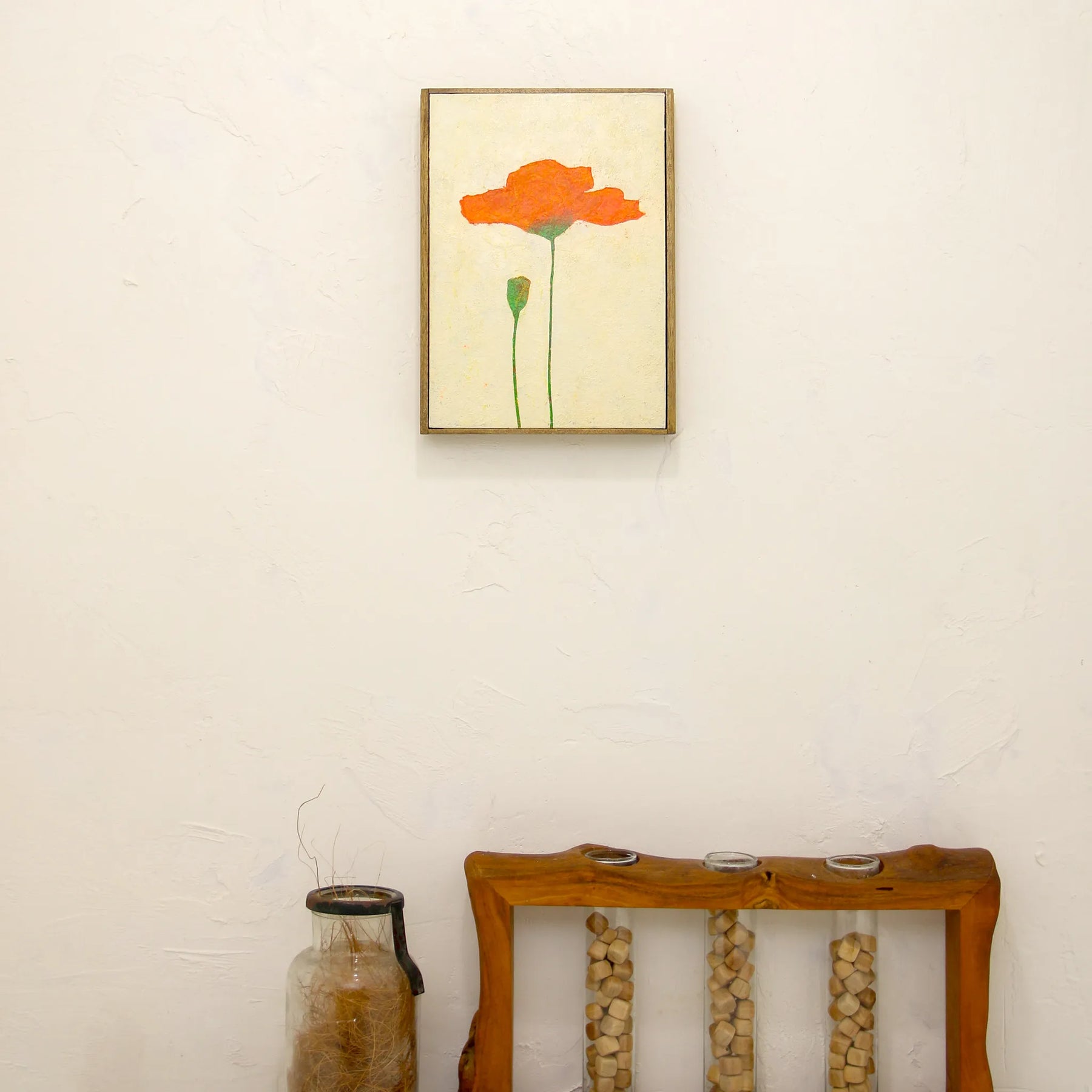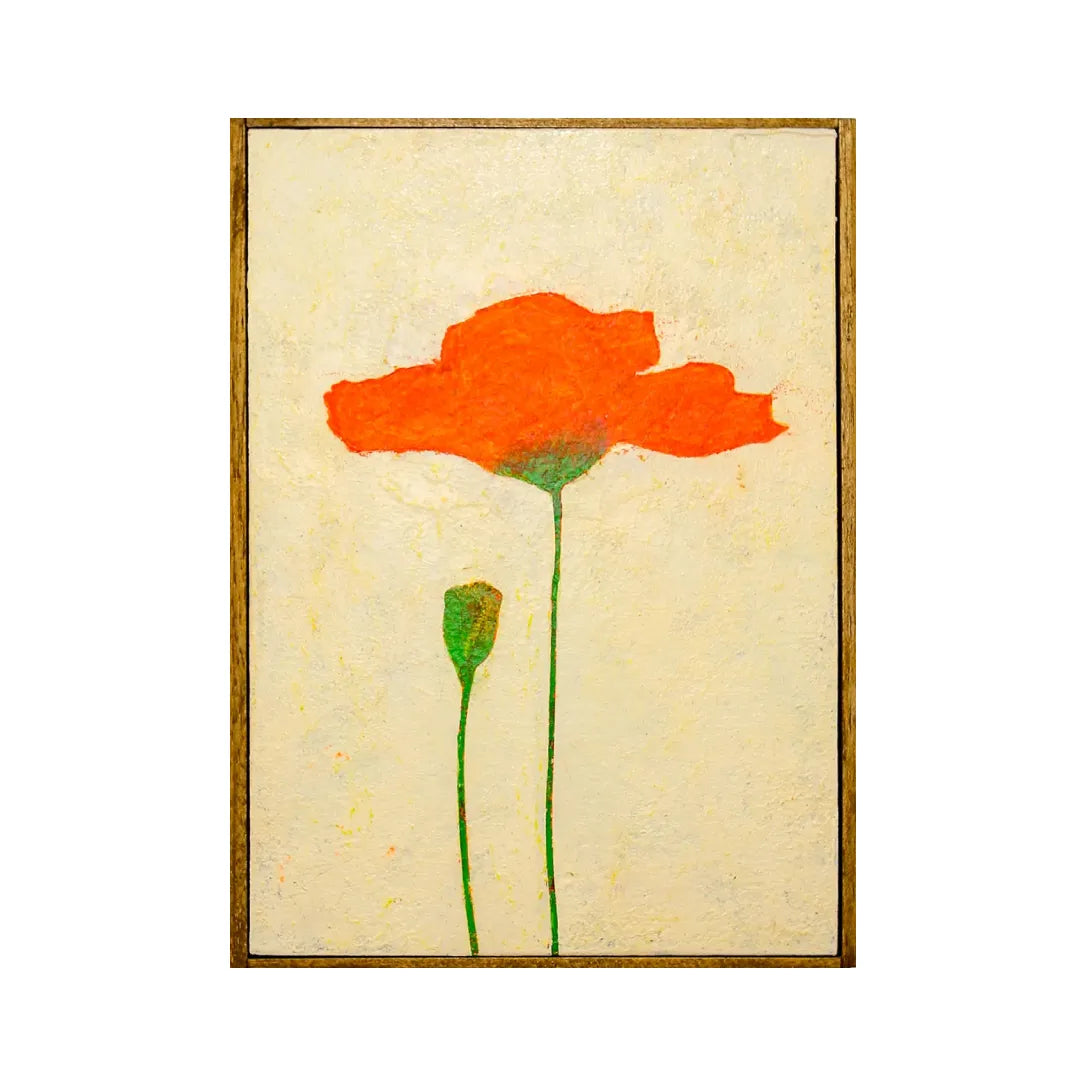 温かなクリーム色の背景に鮮烈なオレンジ色のポピーが、一輪の光のように凛と佇んでいます。厚みのあるテクスチャーが風にそよぐ花びらの鼓動を伝え、眺めるたびに心が晴れ渡るような、清々しい希望を届けてくれるでしょう。この作品を飾ることで、お部屋に陽だまりのような明るさが生まれ、日々の暮らしにささやかな活力を与えてくれます。玄関や廊下に、北欧ナチュラルの家具と設えるのが最適です。