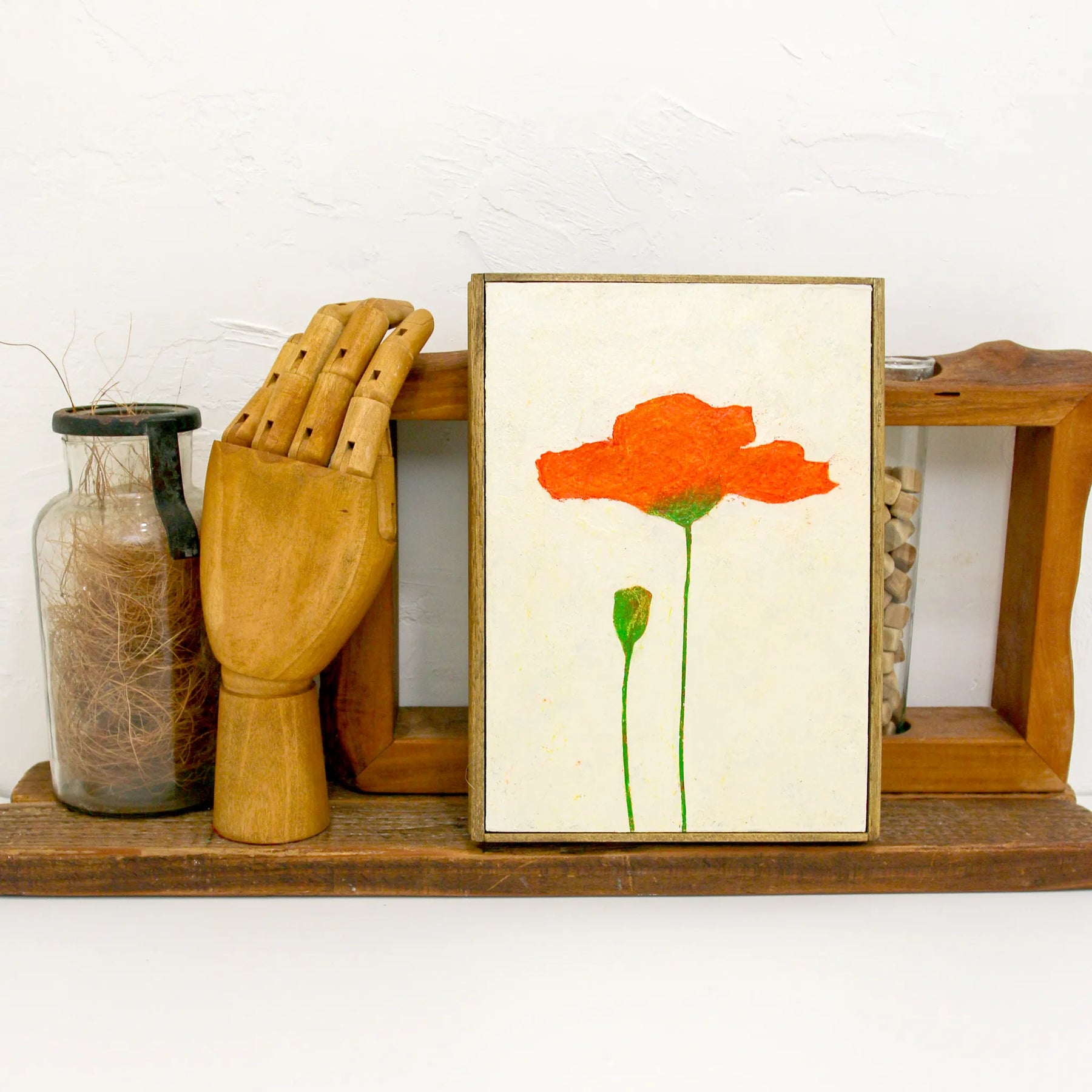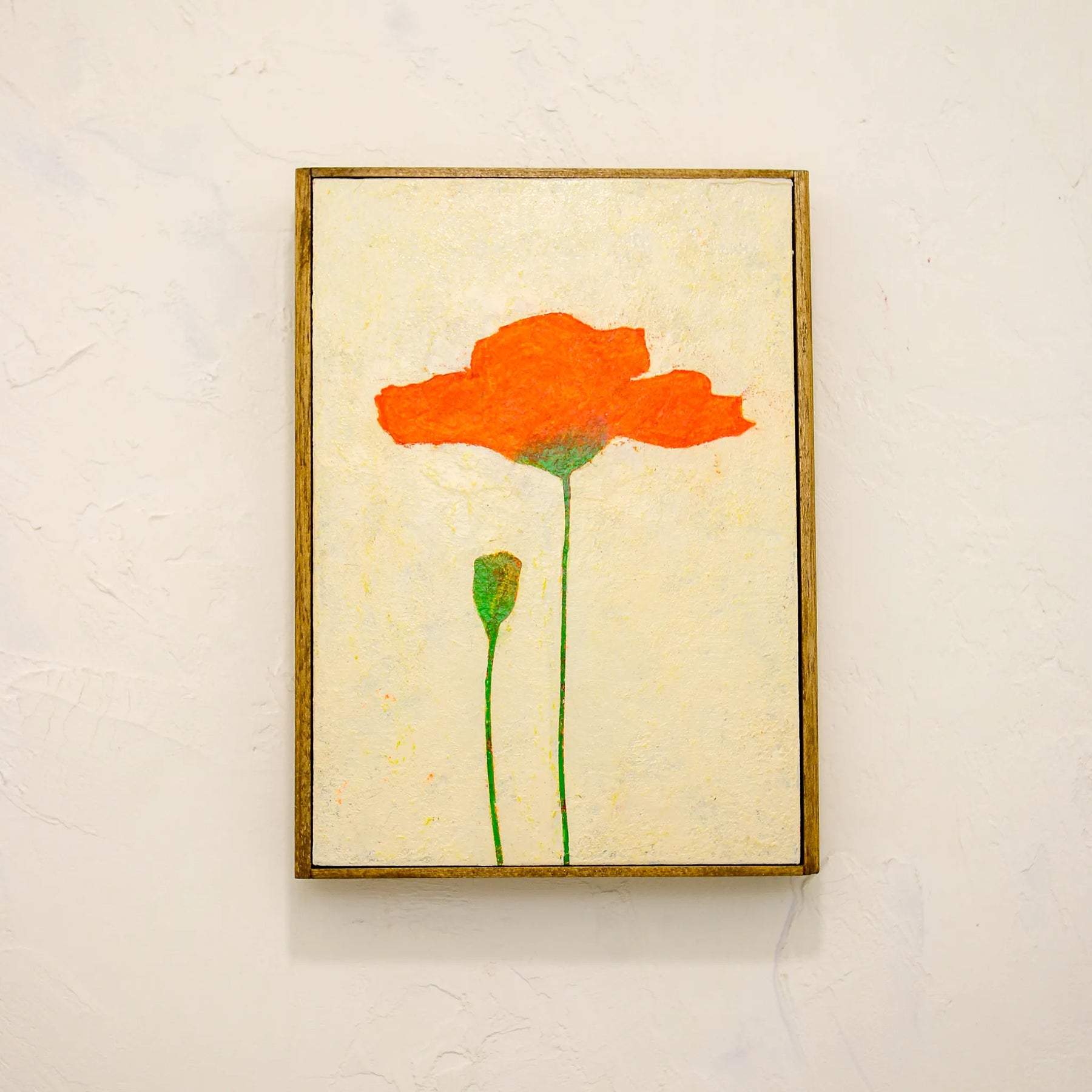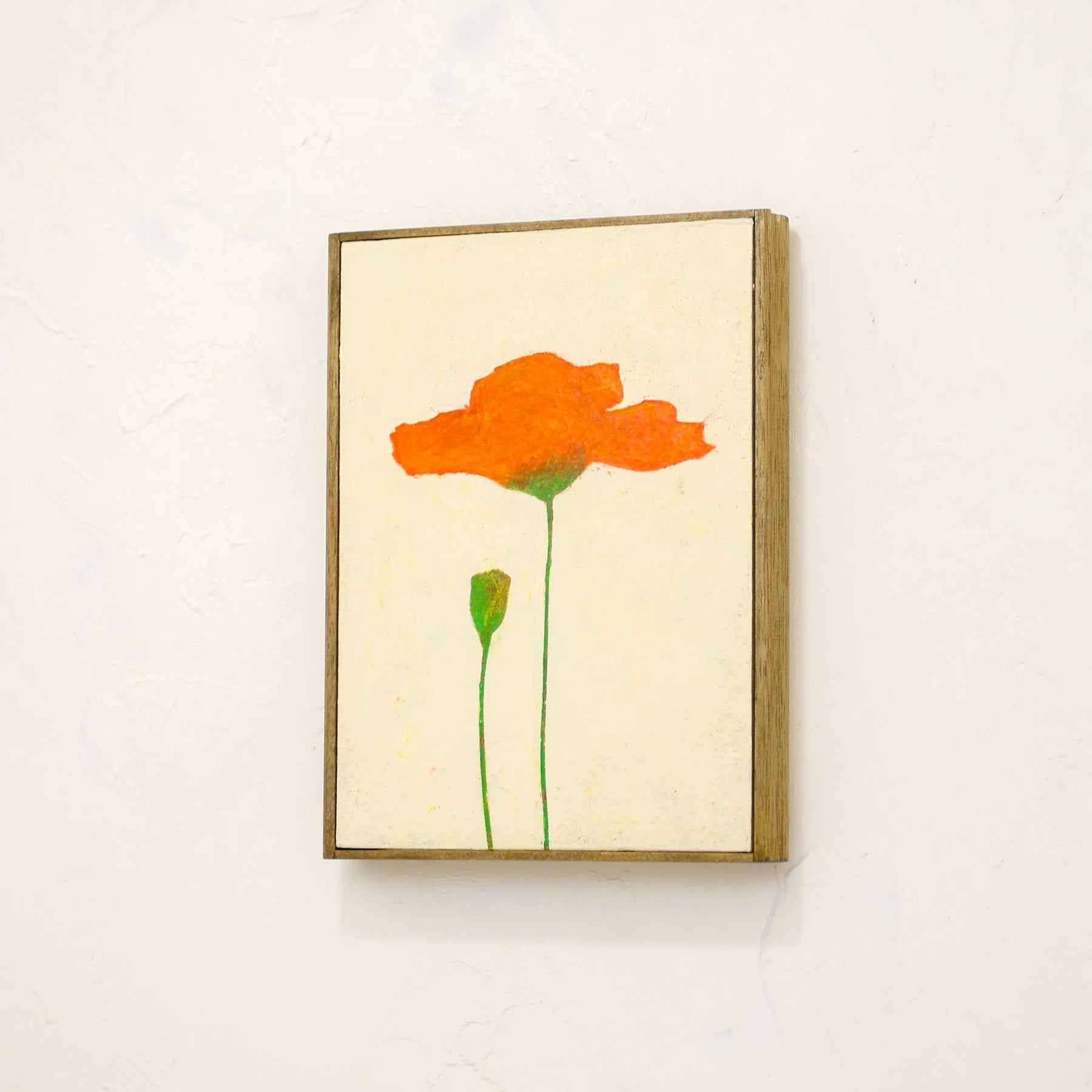 動き出す前、散ってしまう前、オレンジはそこに留まっている。そっと保たれた一瞬。花が自分自身を覚えているかのように。モチーフは花ですが、写実や装飾ではなく、記憶や感情に近い形へと抽象化しています。本作品は、作家自身による手描きのオリジナル作品です。制作から仕上げ、額装までを一貫して行い、一点一点、微細な色味や質感を確認しながら完成させています。