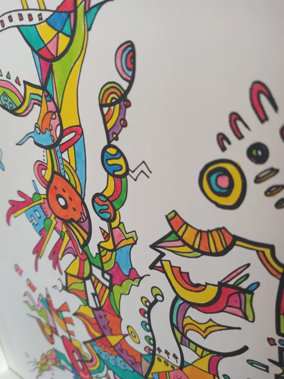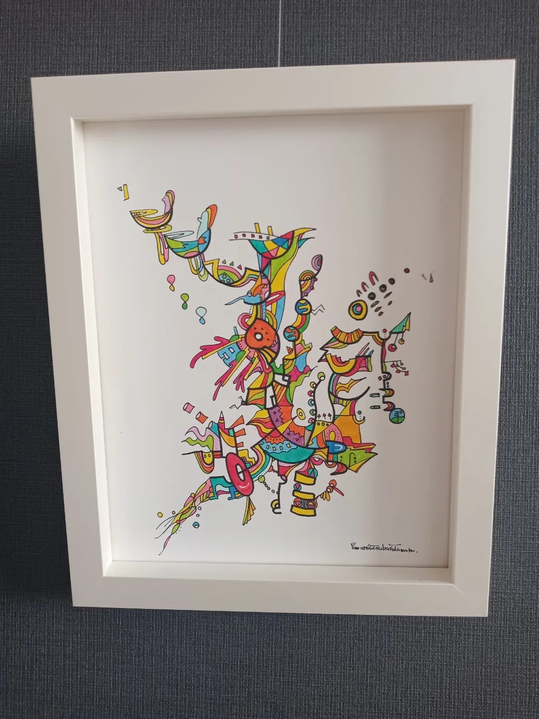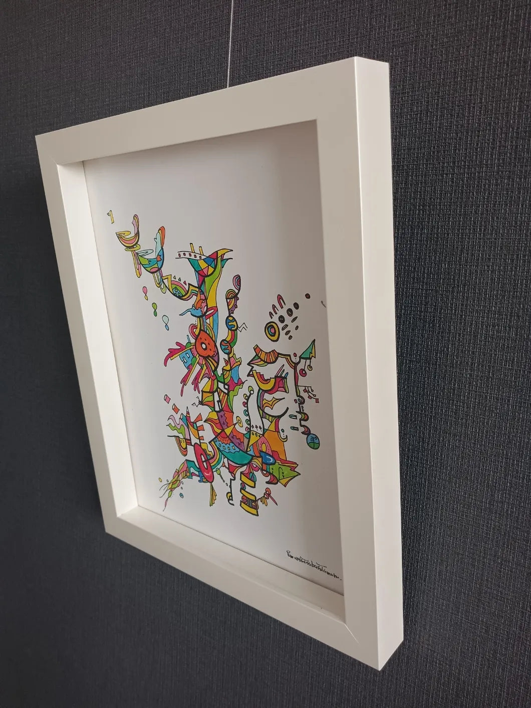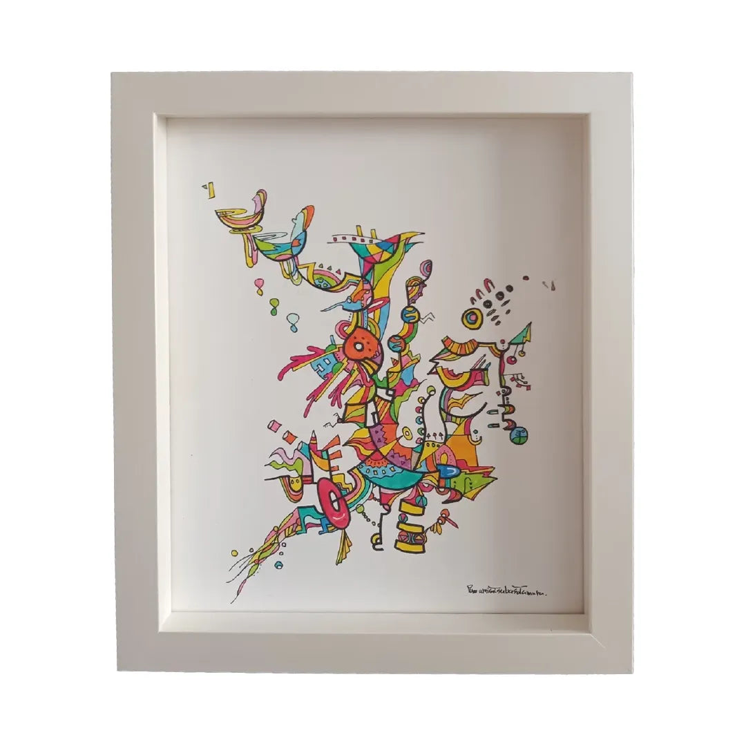 白いキャンバスに浮かぶように描かれたカラフルな抽象アート。ピンクやオレンジ、ブルー、グリーンなど多彩な色がリズミカルに組み合わさり、まるで音楽やダンスが可視化されたかのような軽快さを感じさせます。余白の中で自由に弾けるモチーフは、見る人の想像力を刺激し、物語や旋律を心の中に呼び起こします。飾ることで空間に明るさと遊び心を添え、日常を軽やかに彩る一枚です。