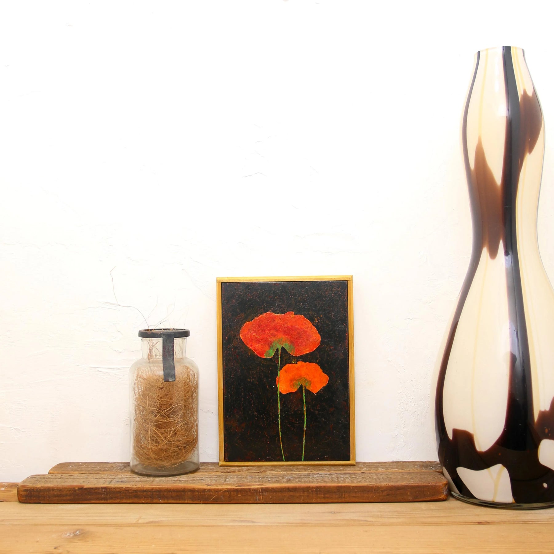 深い闇を思わせる背景の中で、燃えるようなオレンジの花びらが、一筋の希望のように鮮烈な光を放っています。この作品を一点飾ることで、空間に心地よい緊張感と気品が生まれ、日々の暮らしに劇的な彩りを与えてくれます。書斎や寝室の壁面に、重厚なヴィンテージ家具と設えるのが最適です。