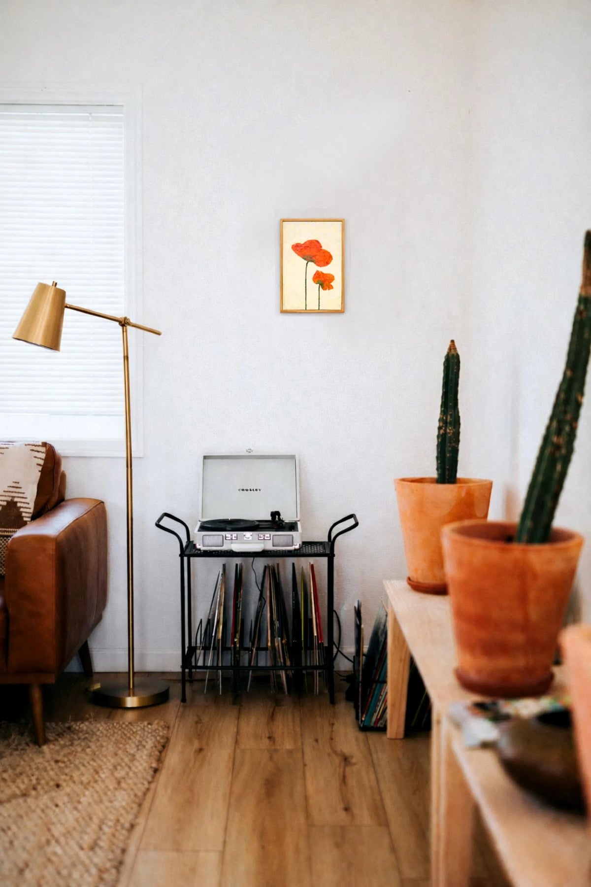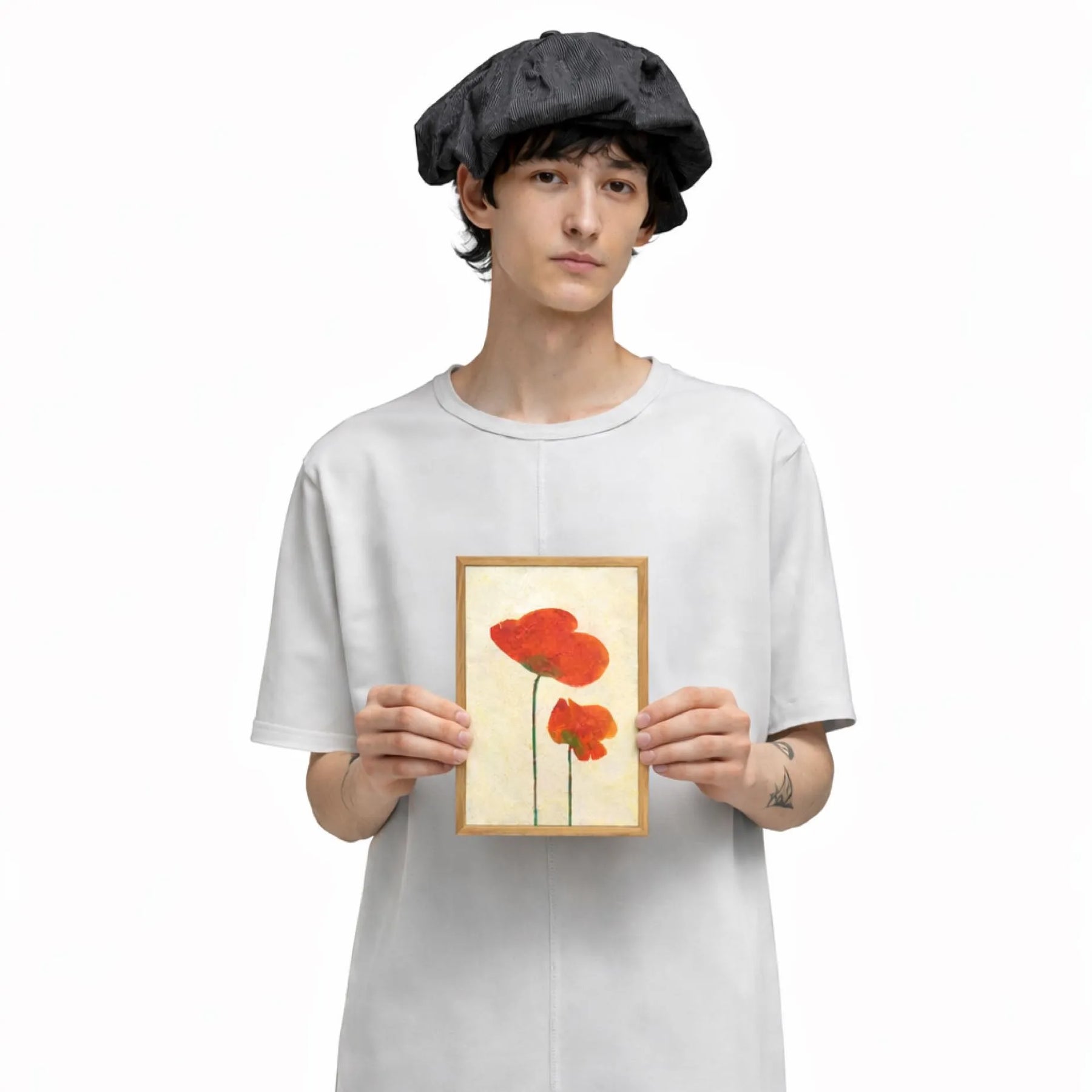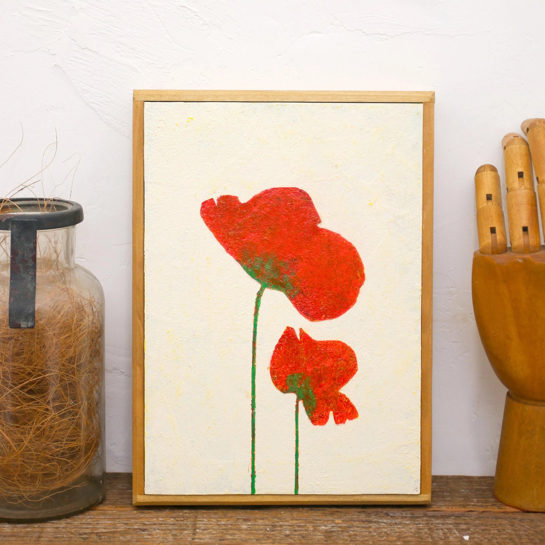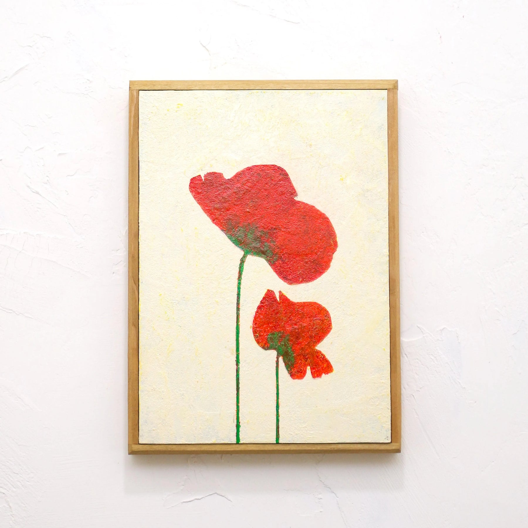 生成り色の柔らかな質感の中に、大小二つの緋色が寄り添い、静かな生命の対話を奏でているようです。ざらりとしたマチエールが陽光を優しく受け止め、眺めるたびに心の一角がじんわりと温まるような充足感を届けてくれるでしょう。この一枚を壁に添えることで、空間に穏やかな熱量が加わり、日々の暮らしを慈しむような豊かな時間を作り出します。リビングや寝室に、木製家具などの自然な設えと合わせるのが素敵です。