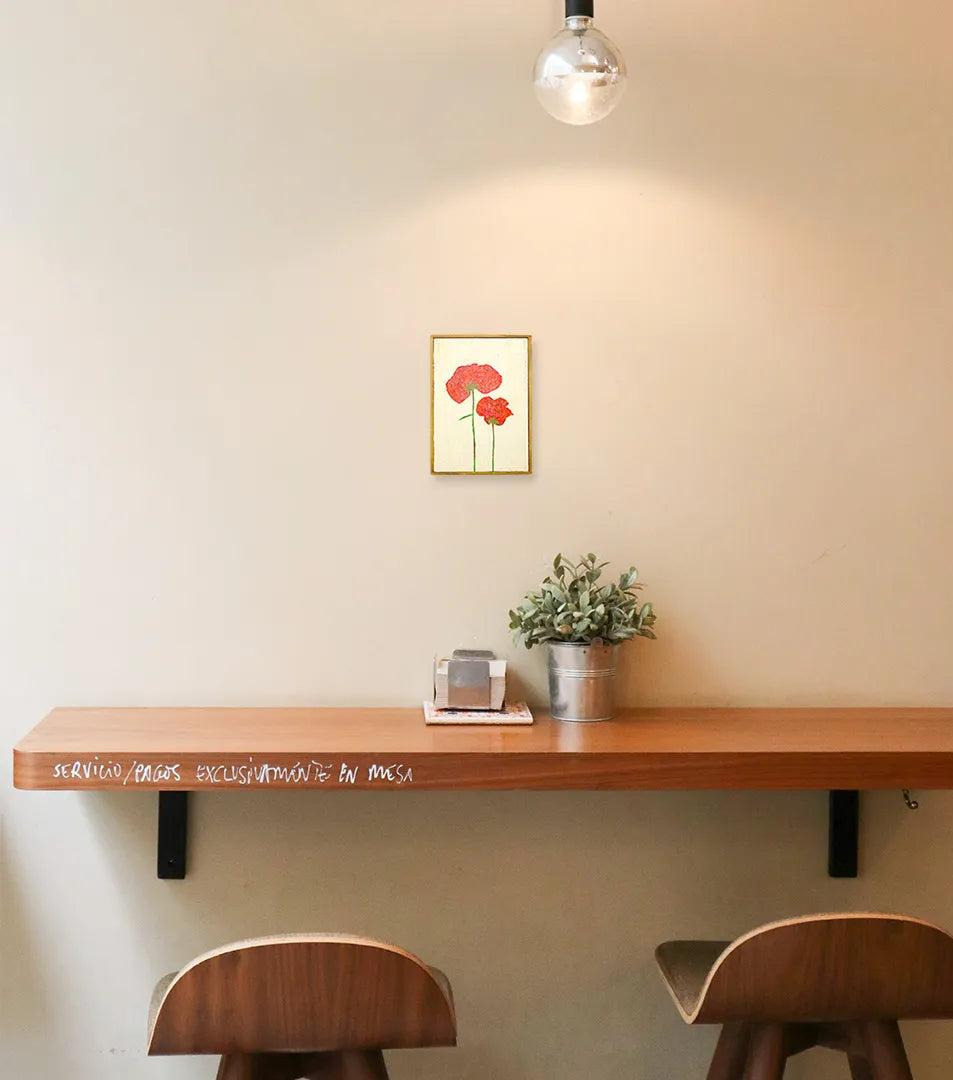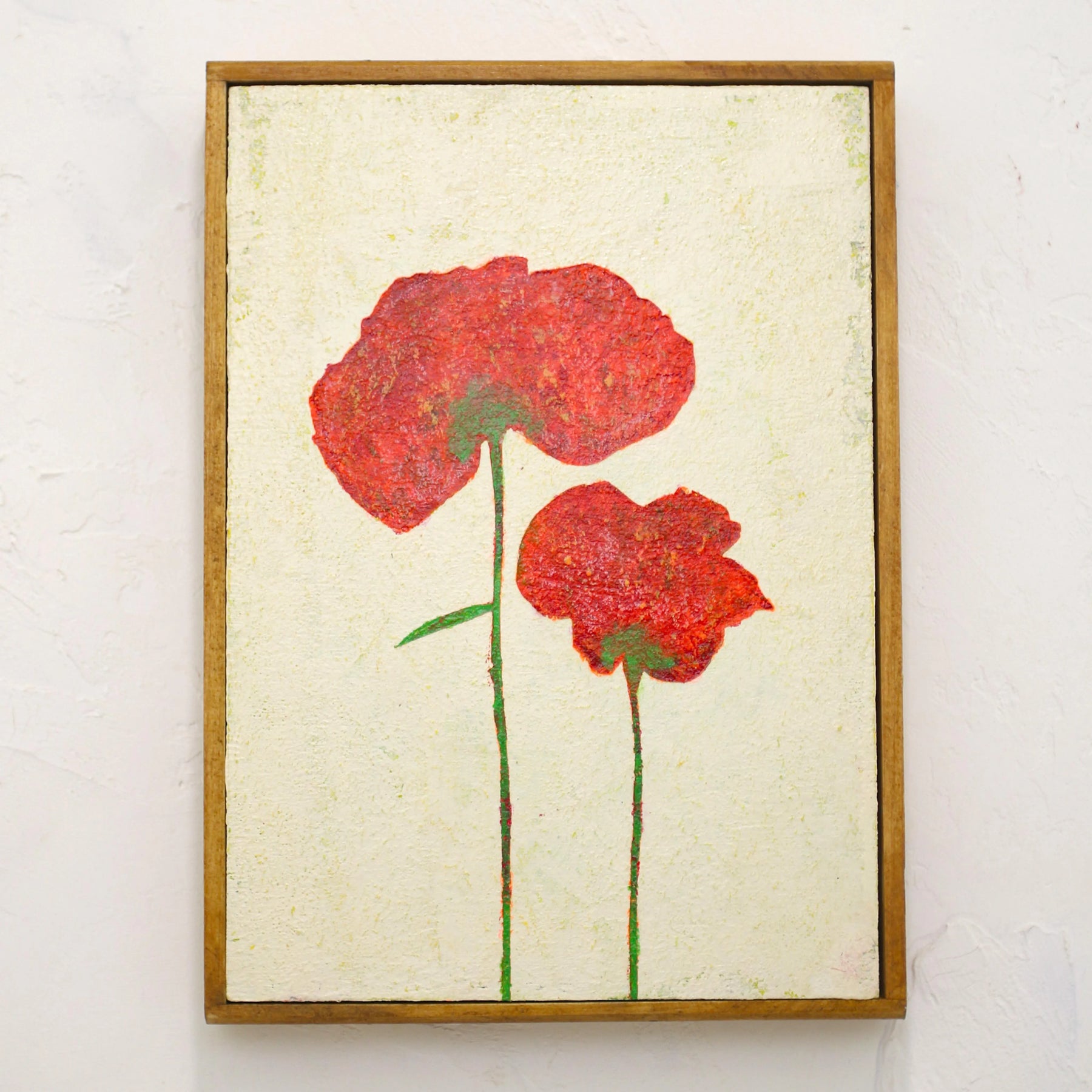 淡い生成り色の地層に、二輪の真っ赤なポピーが寄り添うように力強く咲き誇っています。ざらりとした質感から伝わる大地の息吹と、鮮烈な緋色のコントラストは、見るたびに心の奥底を温め、前向きな勇気を与えてくれるでしょう。この一枚を飾ることで、空間に心地よい温度感が加わり、日々の暮らしに豊かな彩りと生命力を吹き込みます。玄関や廊下の壁面に、木製家具などのナチュラルな装いと設えるのが素敵です。
