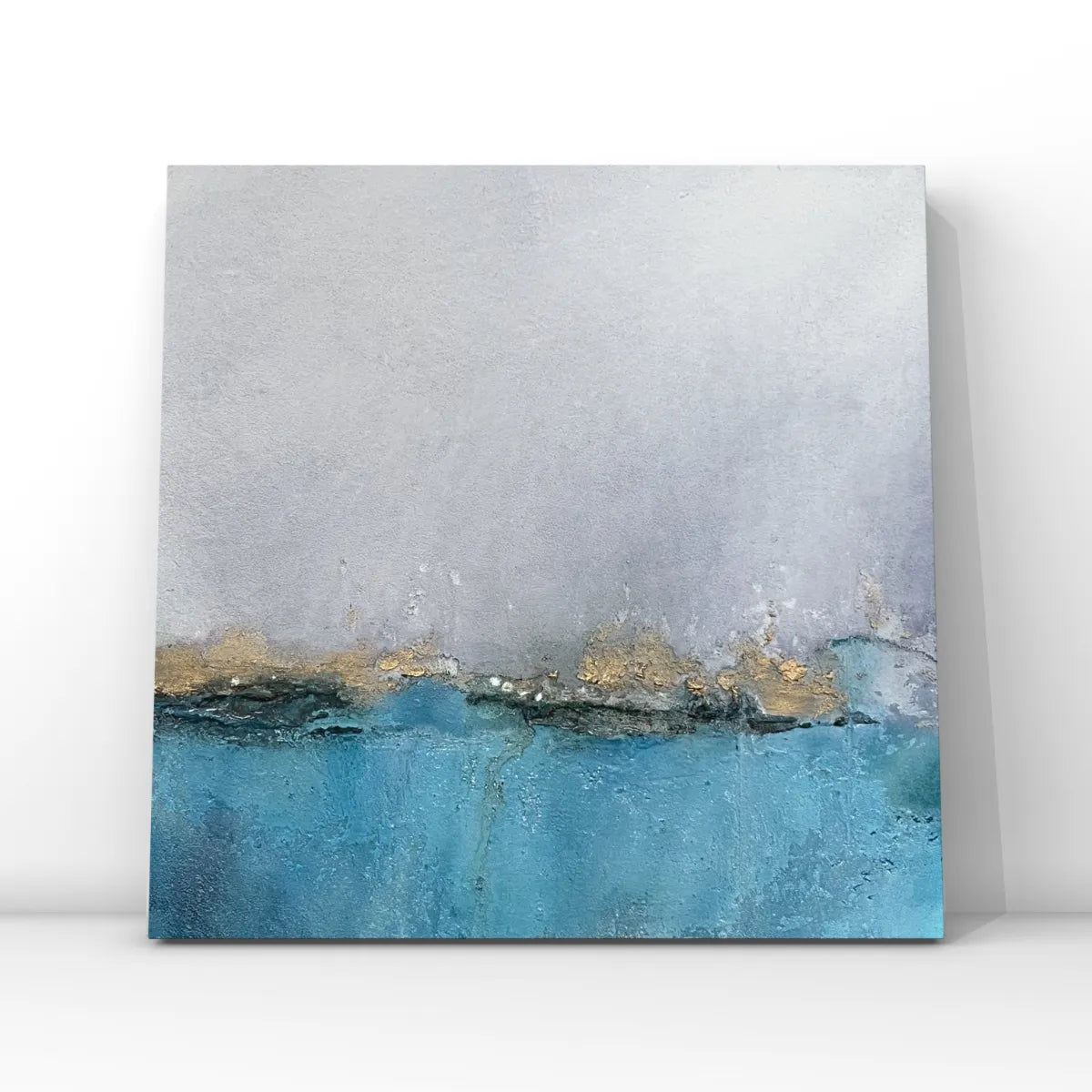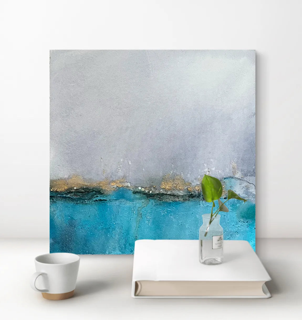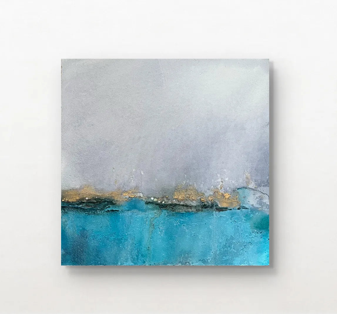 グレーからブルーへと移ろう色彩が、空と海の境界を思わせる抽象画。穏やかな広がりの中に、金箔のような輝きが散りばめられ、静けさの中に希望の光を感じさせます。シンプルでありながら奥行きのある表現は、眺める人の心を解きほぐし、空間に落ち着きと洗練をもたらしてくれるでしょう。リビングや寝室など、ゆったりと過ごす場所に飾ることで、日常に穏やかな癒しを添える一枚です。