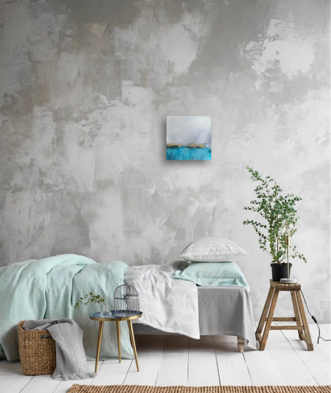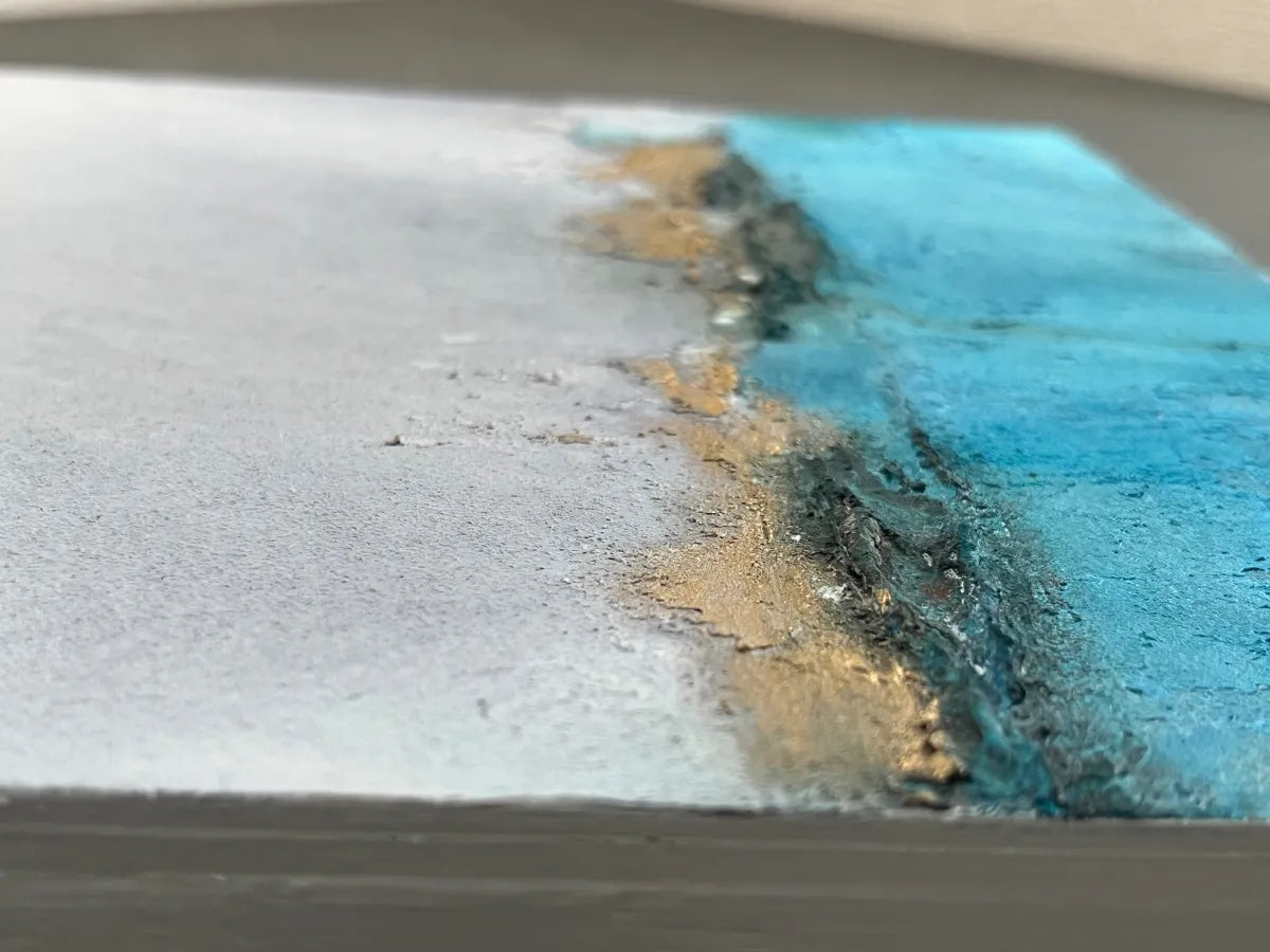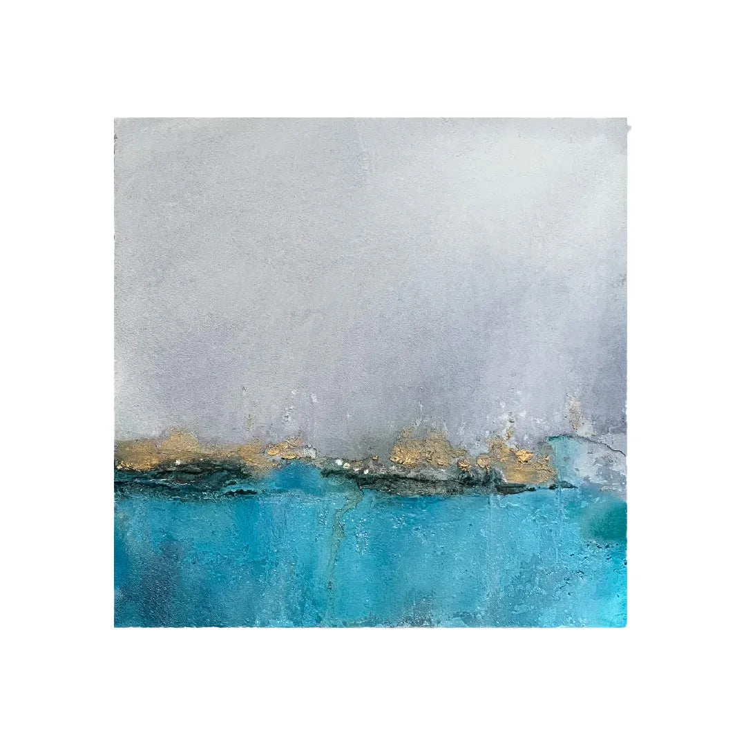 グレーからブルーへと移ろう色彩が、空と海の境界を思わせる抽象画。穏やかな広がりの中に、金箔のような輝きが散りばめられ、静けさの中に希望の光を感じさせます。シンプルでありながら奥行きのある表現は、眺める人の心を解きほぐし、空間に落ち着きと洗練をもたらしてくれるでしょう。リビングや寝室など、ゆったりと過ごす場所に飾ることで、日常に穏やかな癒しを添える一枚です。